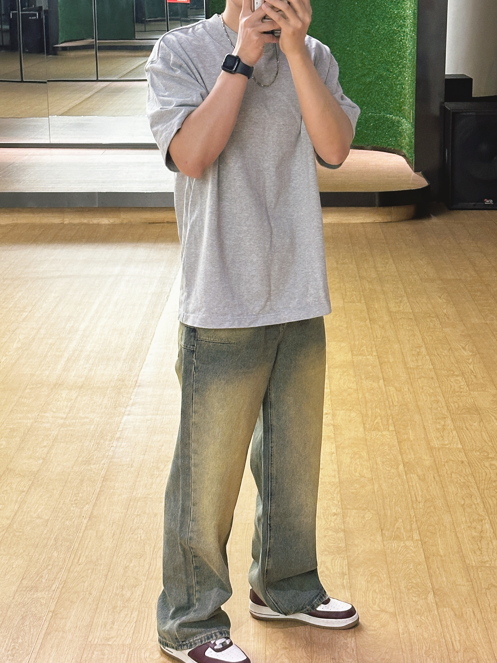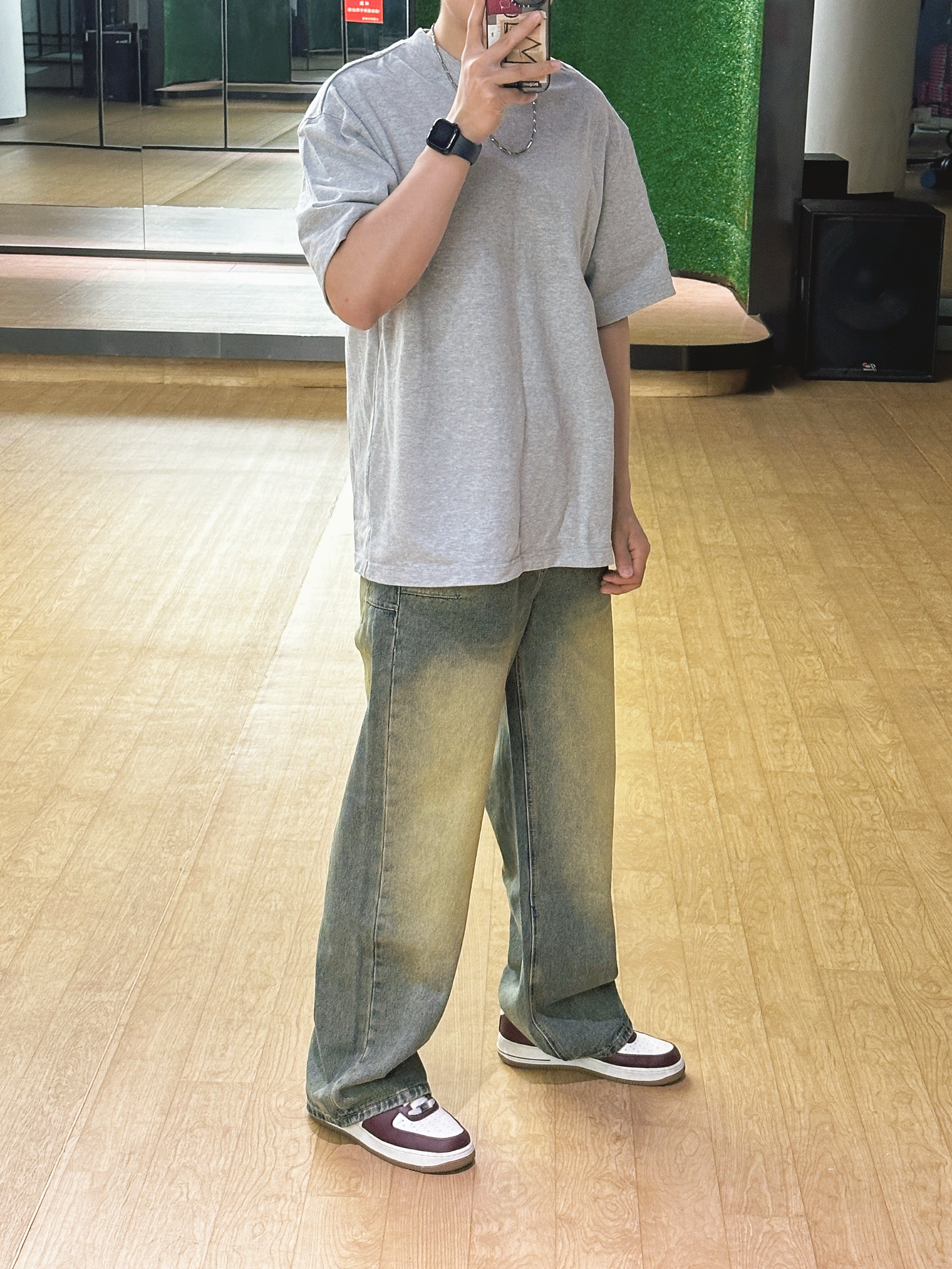 上身:重磅黑色短袖。小领口设计超级加分,不仅拉长颈部线条,显得整个人利落又精神,而且避免了领口过大带来的邋遢感。纯棉材质,贴身穿超柔软,透气性也杠杠的,即使运动后出汗,也不会黏在身上。经典黑色永远不会出错,低调又百搭,轻松拿捏高级感。 下身:泥黄色美式复古直筒高街痞帅阔腿牛仔裤。泥黄色与黑色上衣形成了强烈的色彩反差,复古又吸睛。直筒阔腿的版型超藏肉,能巧妙修饰腿型,无论你是O型腿还是X型腿,都能瞬...