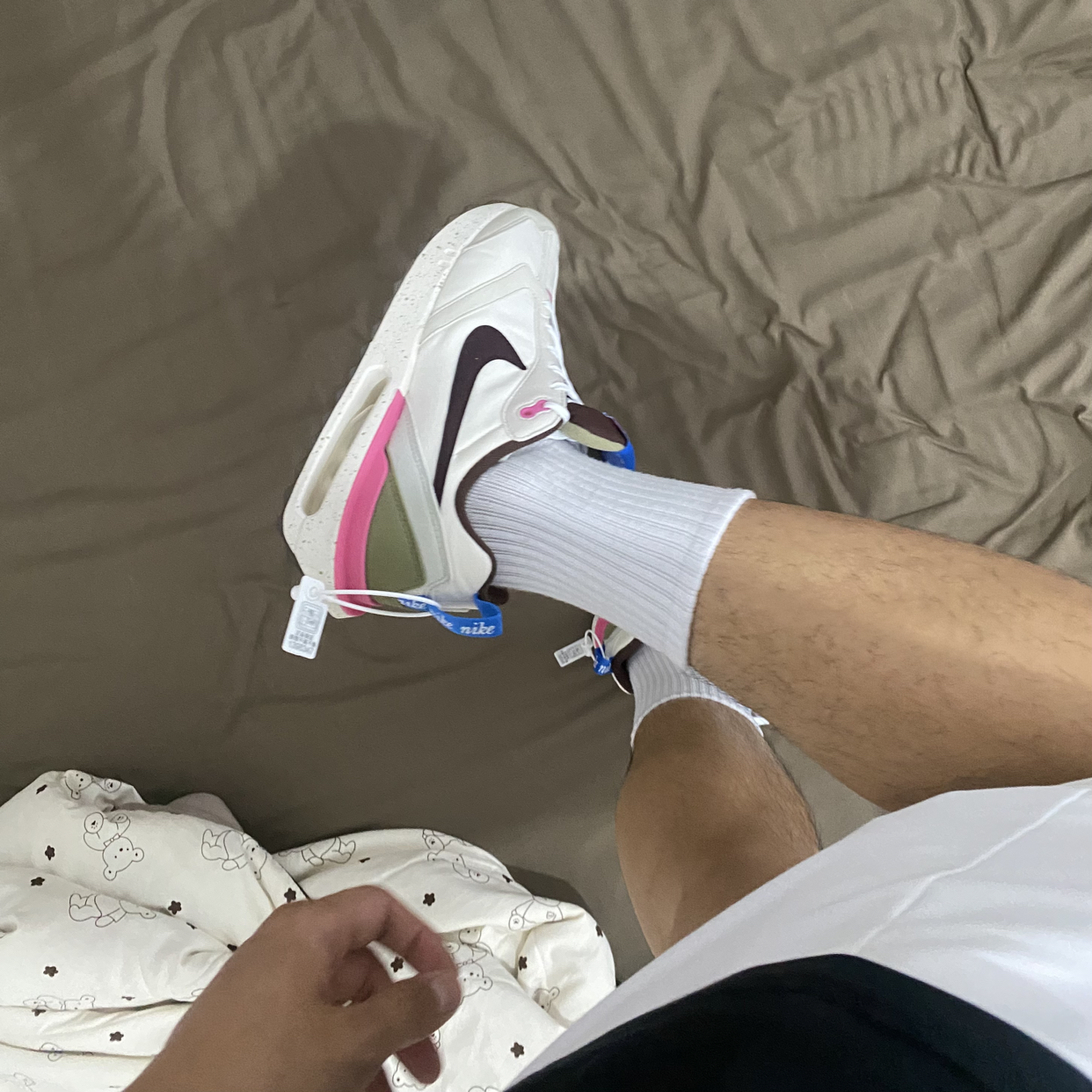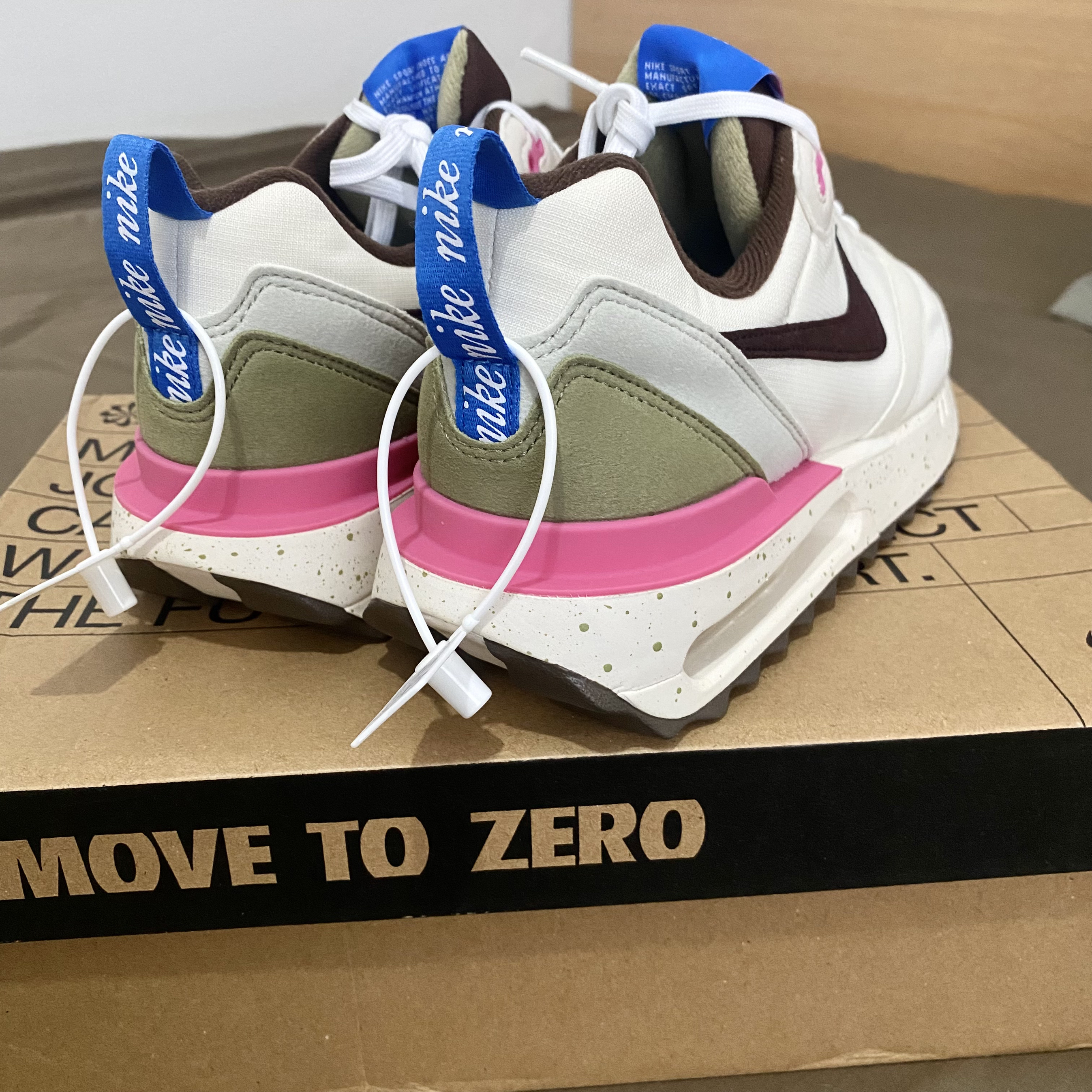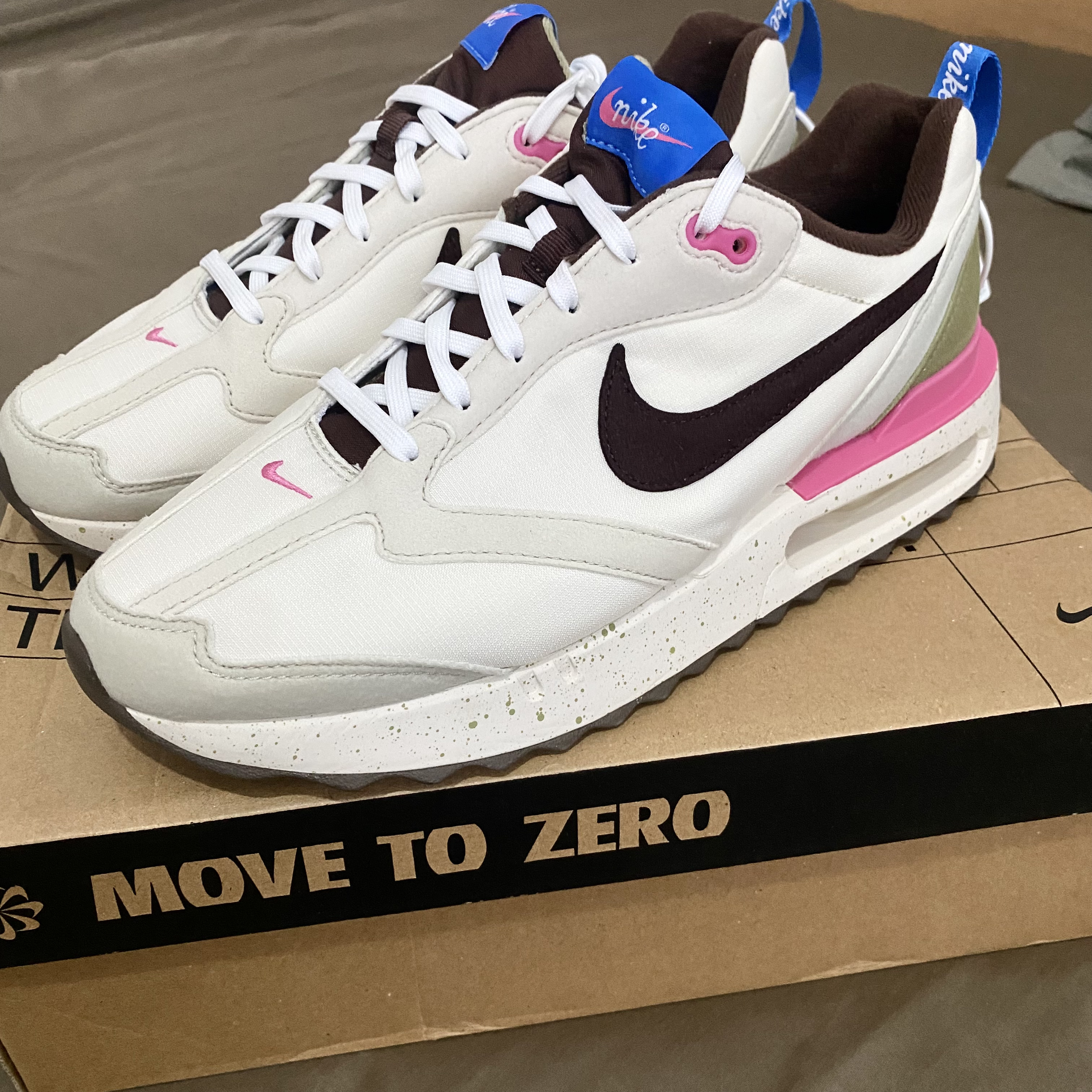 挖到宝啦!新入的这双Nike运动鞋, 白、黑、粉、绿的撞色设计超吸睛,个性又时尚。标志性的大勾子很经典,鞋底的气垫不仅颜值高,脚感也超棒,走路自带回弹。鞋盒上“MOVE TO ZERO”理念满满,环保又有态度,真的爱了!