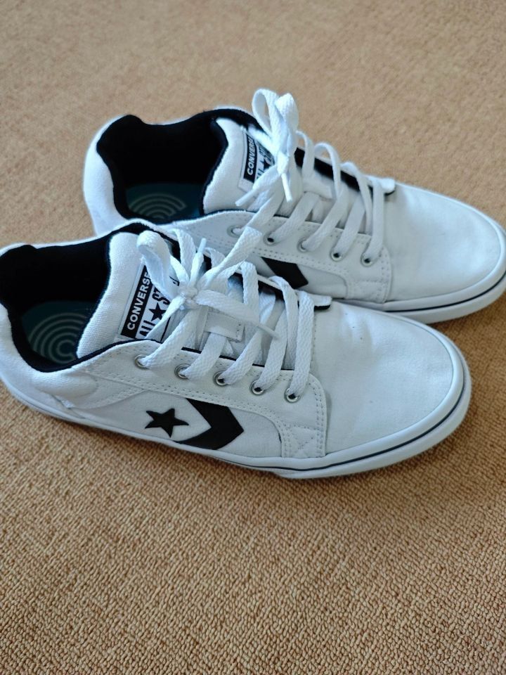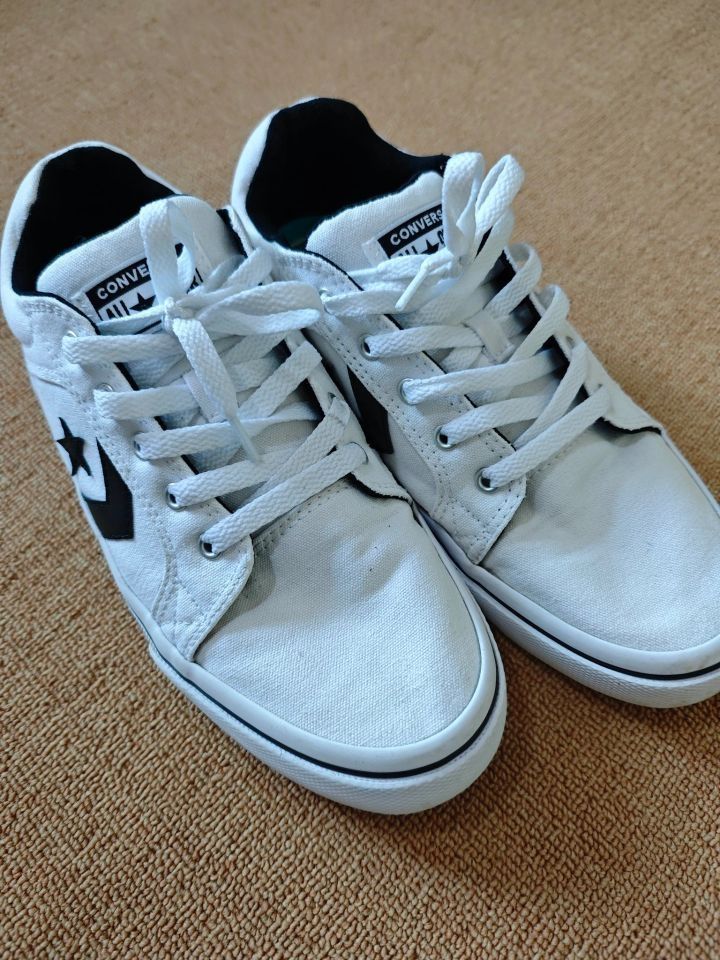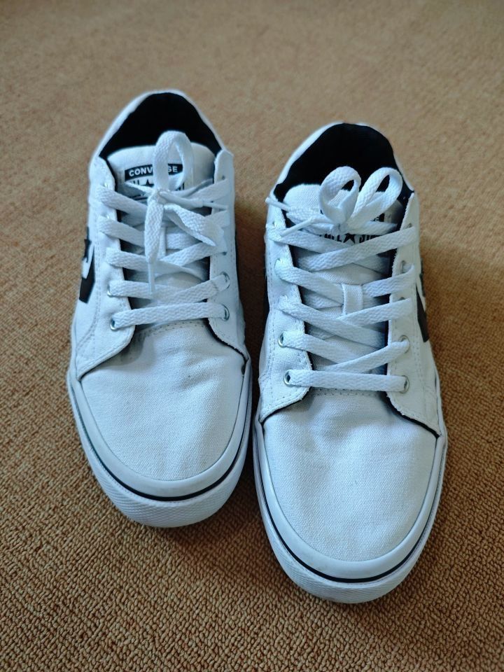 这一双Converse El Distrito 2.0Ox板鞋入手快一 年了,今天特地给大家分享下穿着体验。 这双鞋外观是经典的白黑配色,干净又百搭,不管是搭牛仔裤还是运动裤,都超有范儿,男女穿都好看。 它用的是合成革材质,质感不错,日常打理也方 便,用湿布一擦就行。而且它虽是低帮设计,脚踝 活动不受限,却又能提供足够支撑,走路、跑步都 稳当。 穿着它走了不少路,舒适度很惊喜。鞋垫软乎乎 的,像踩...