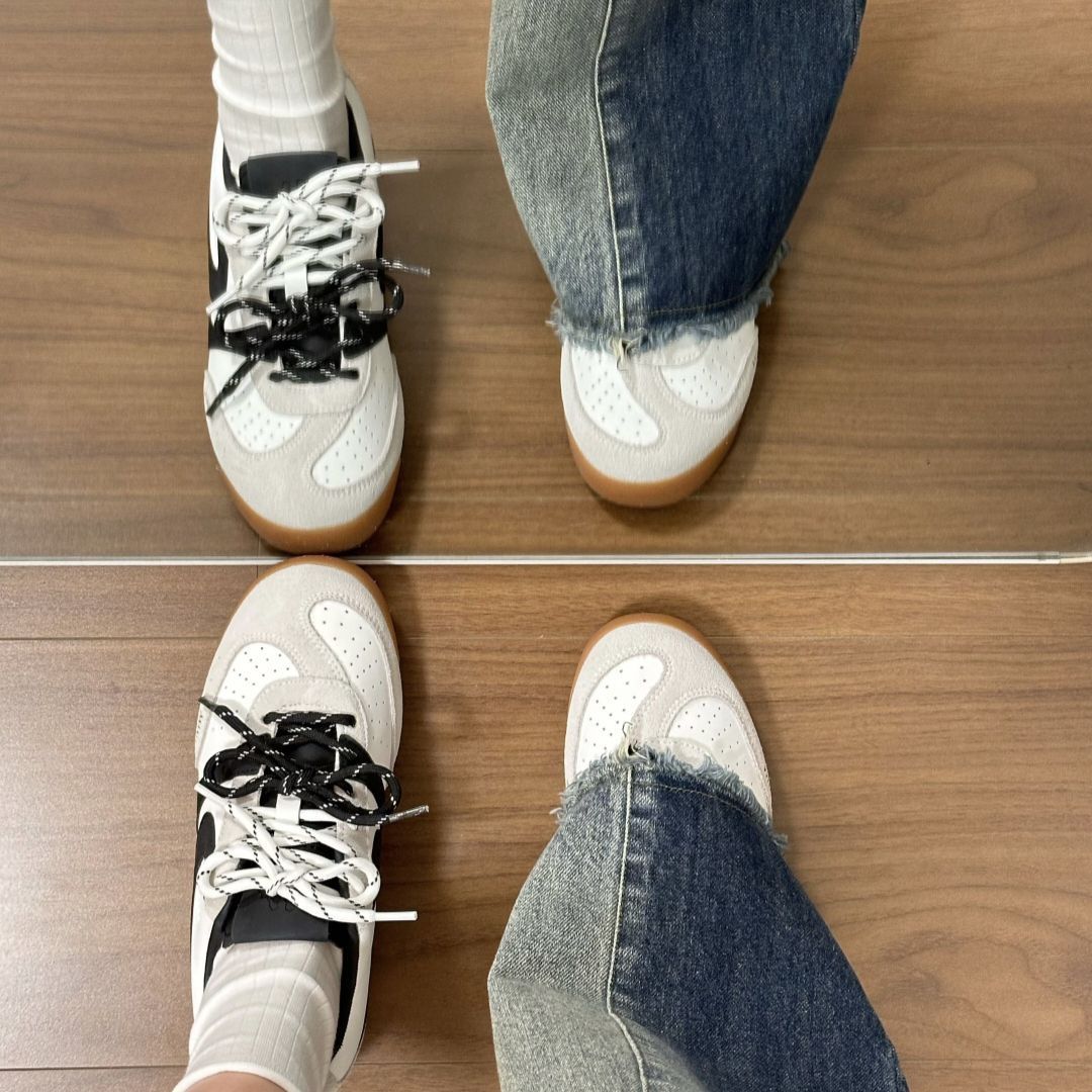 你可以相信我选薄底鞋的眼光!怎么搭都好看! 穿上好轻巧的 没有束缚感诶!脚感没得说~ 鞋身和鞋带的配色都相呼应啦 小巧思get! 鞋面有一丢丢麂皮和皮革拼接的感觉 质感💯分! 是上学or上班通勤的好搭子啦!谁爱了我不说~