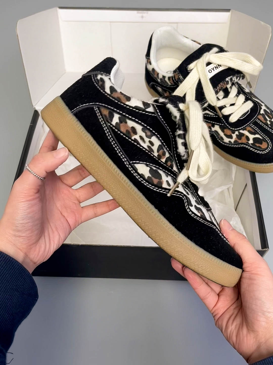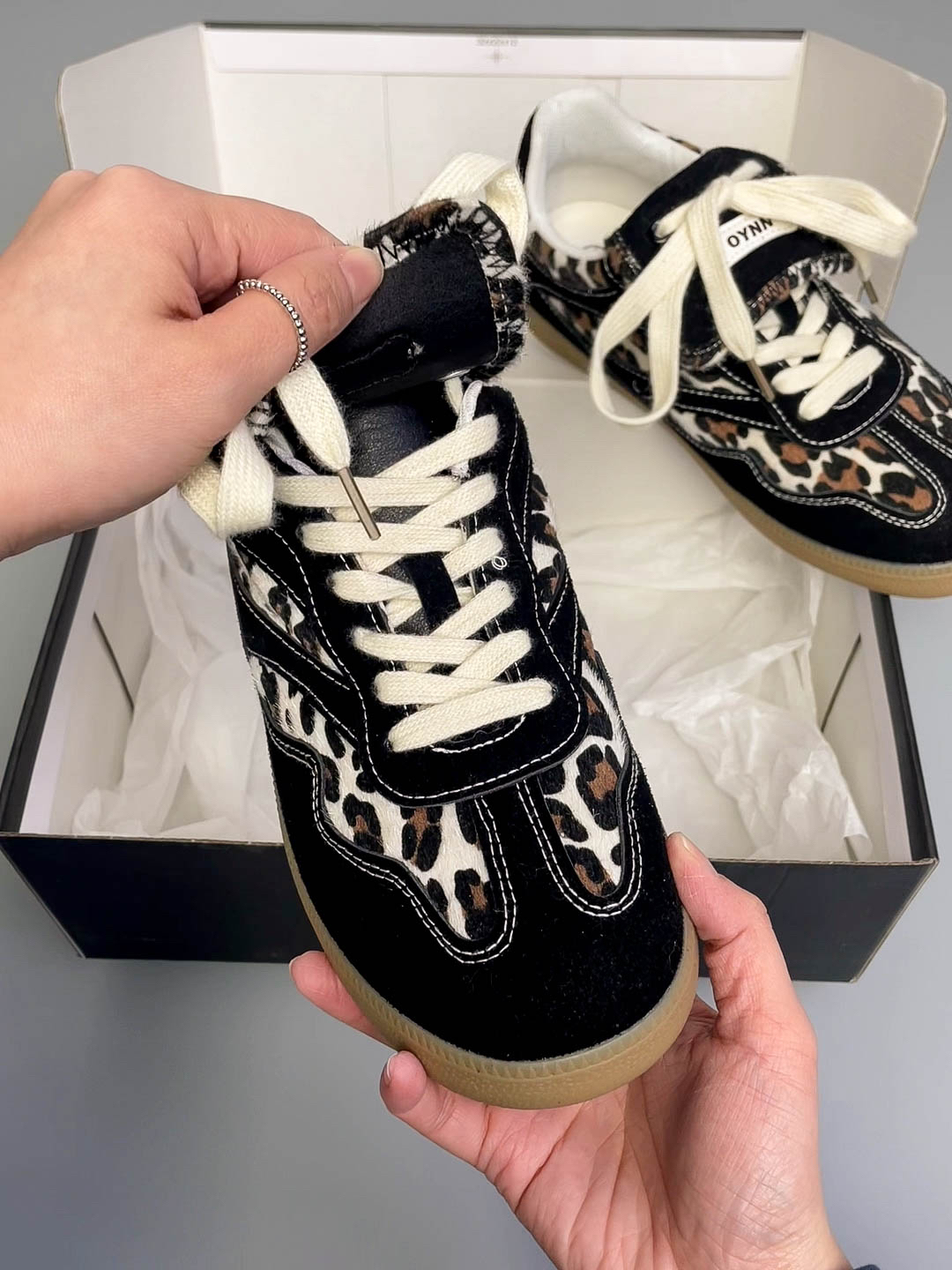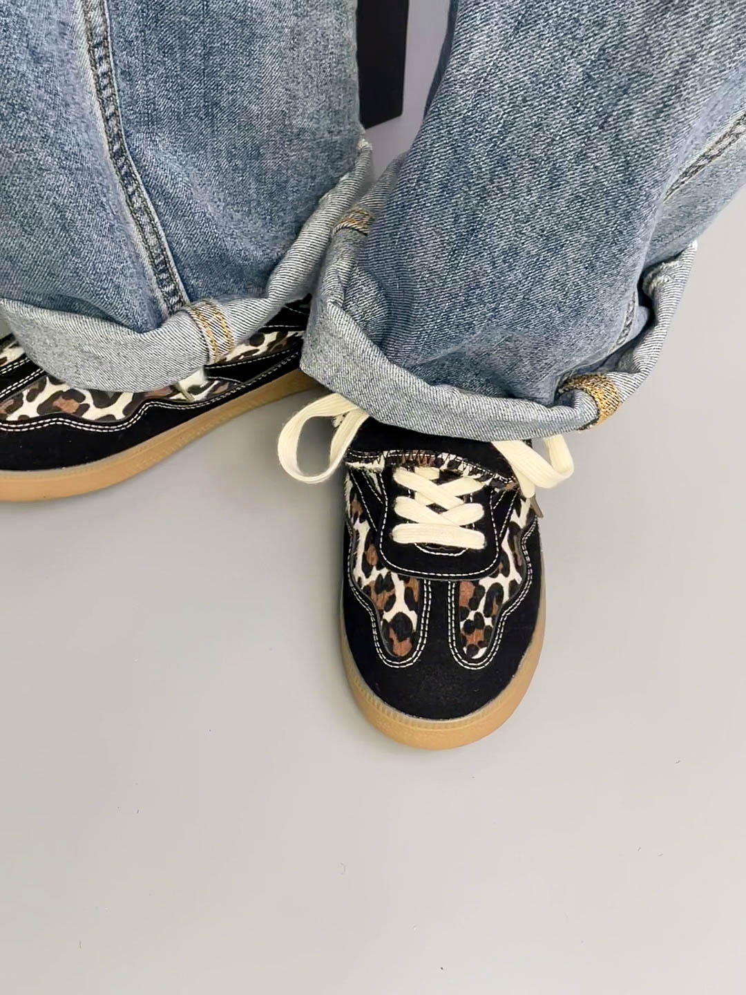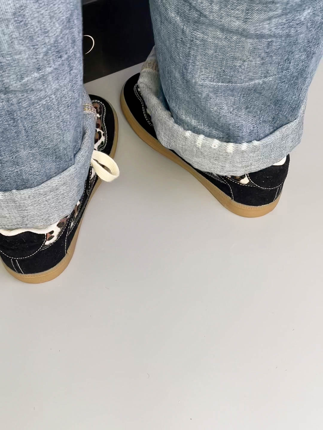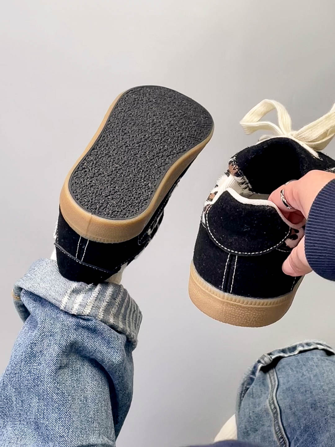 这款鞋的黑色豹纹设计很有特点,又酷又甜也太爱啦 穿上感觉又很休闲,随便一搭配都好看 鞋底平跟的,穿上脚感很舒服 鞋面材质很软,不会磨脚,性价比很高啦