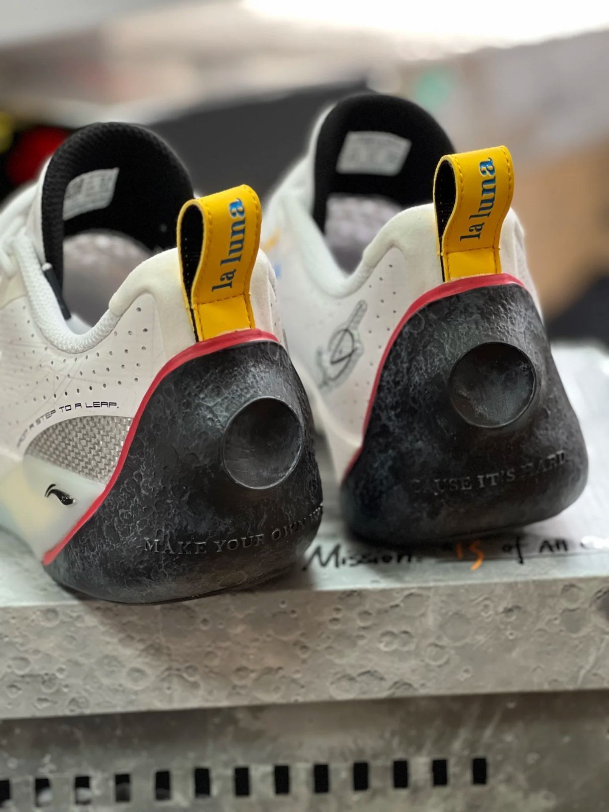 - 鞋面细节:鞋面融入设计草图风格的标注线条,后跟以月球环形山纹理点缀,搭配哑光银与深灰色渐变,呼应“探索”主题的科技感与神秘感。