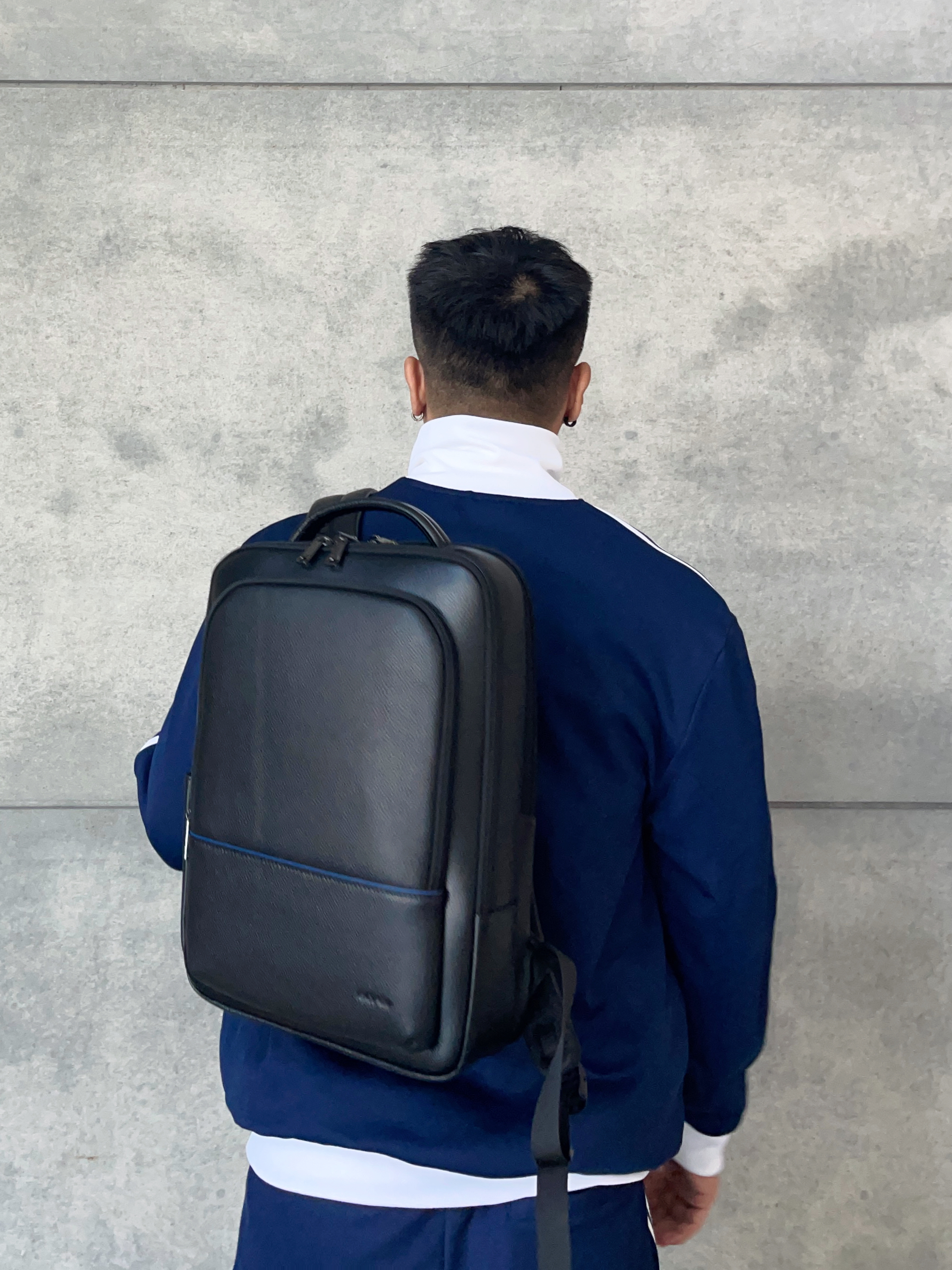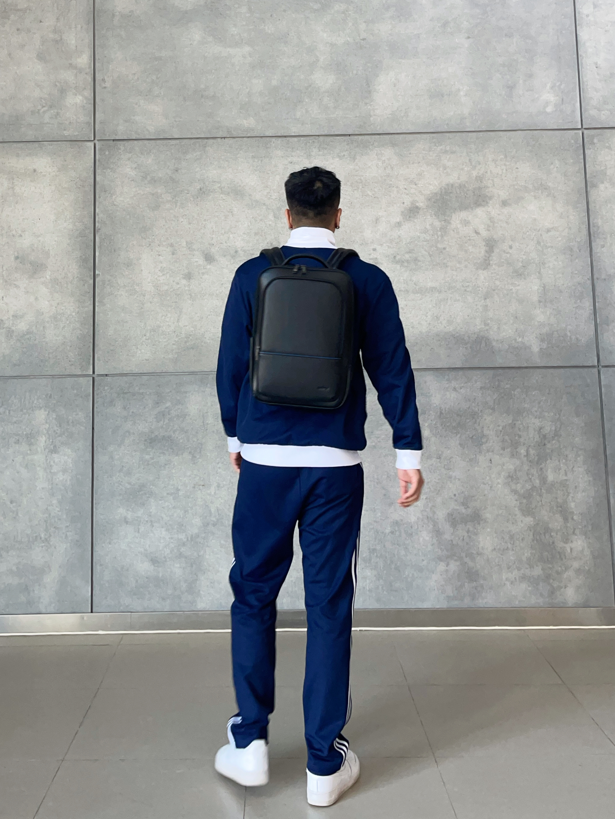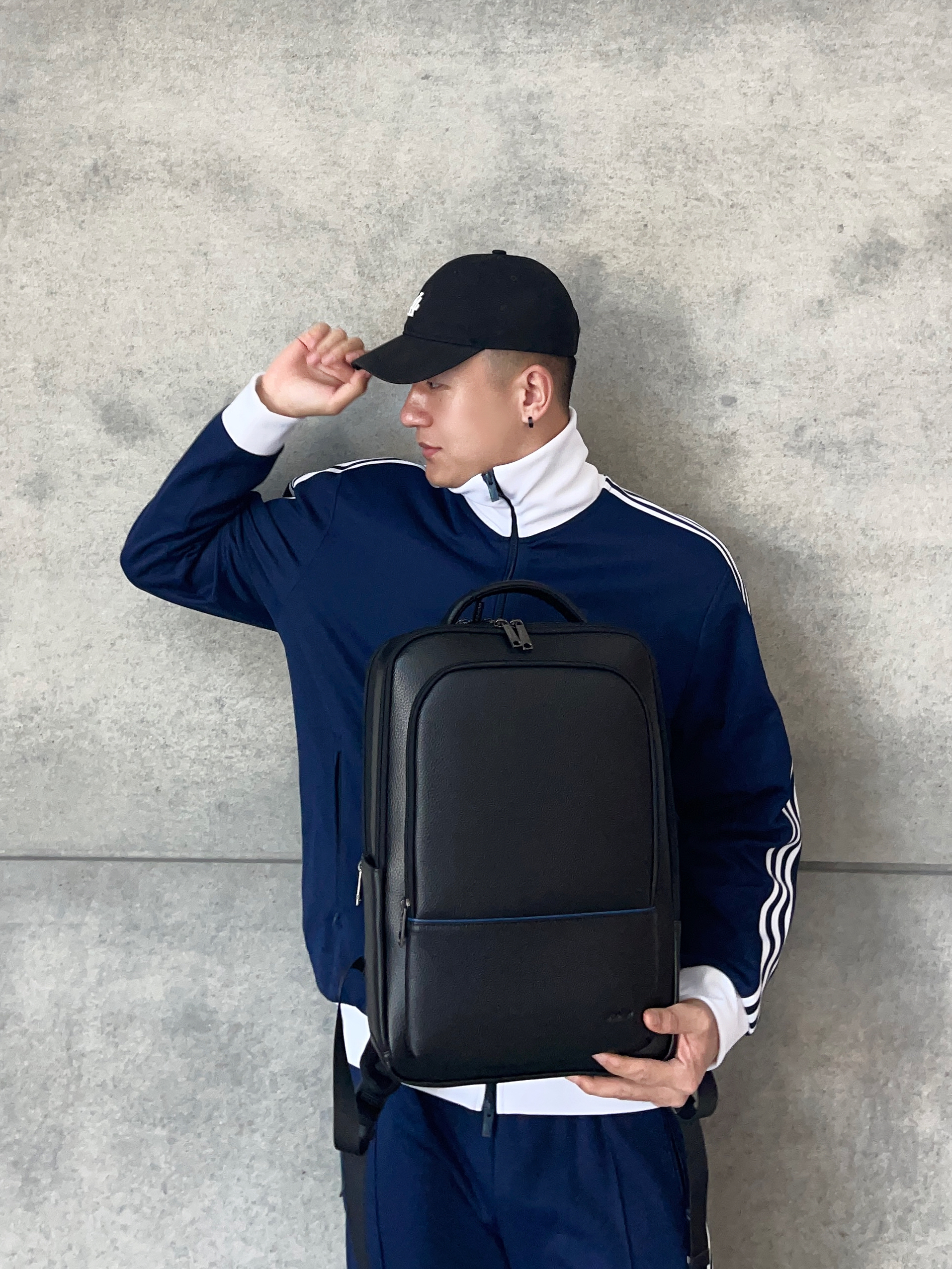 头层牛皮双肩包🎒被夸爆了! 立体剪缝线+哑光黑低调耍帅 大容量暗藏15寸电脑位👨💻 通勤上课不撞款的秘密武器 OOTD用三叶草夜魔蓝套装打底 白立领配蓝裤清爽不费力👟 塞外套+拎水杯+装课本… 一包搞定开季所有场景🌿 背上它 早八课也能走出秀场气场!
