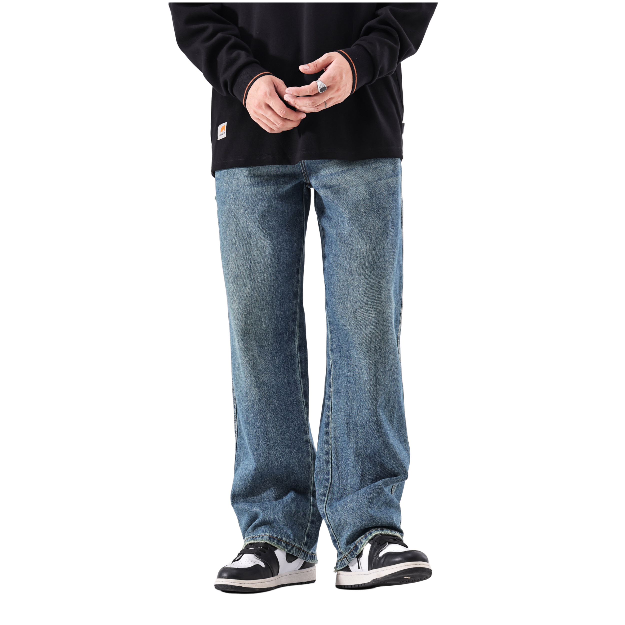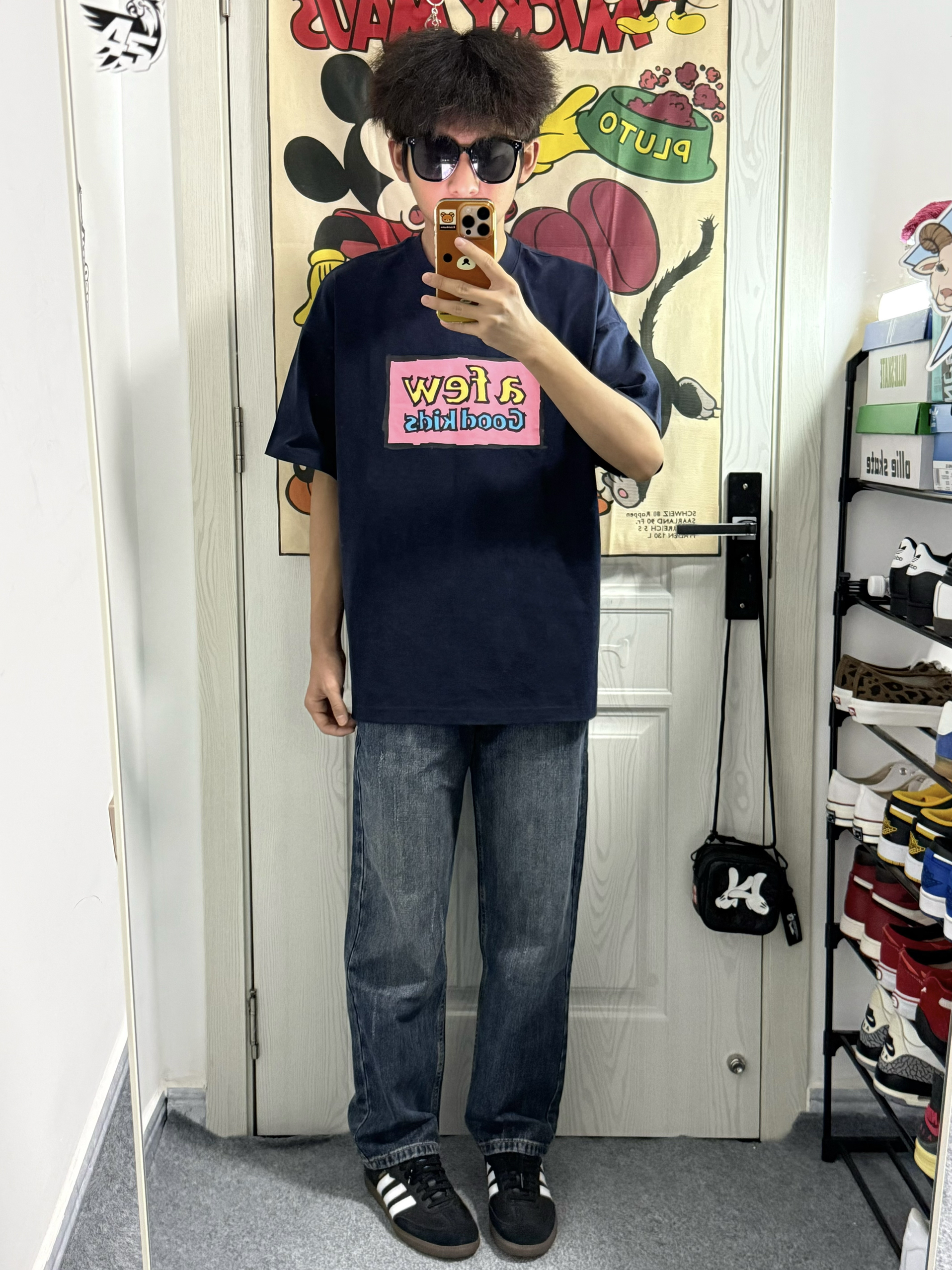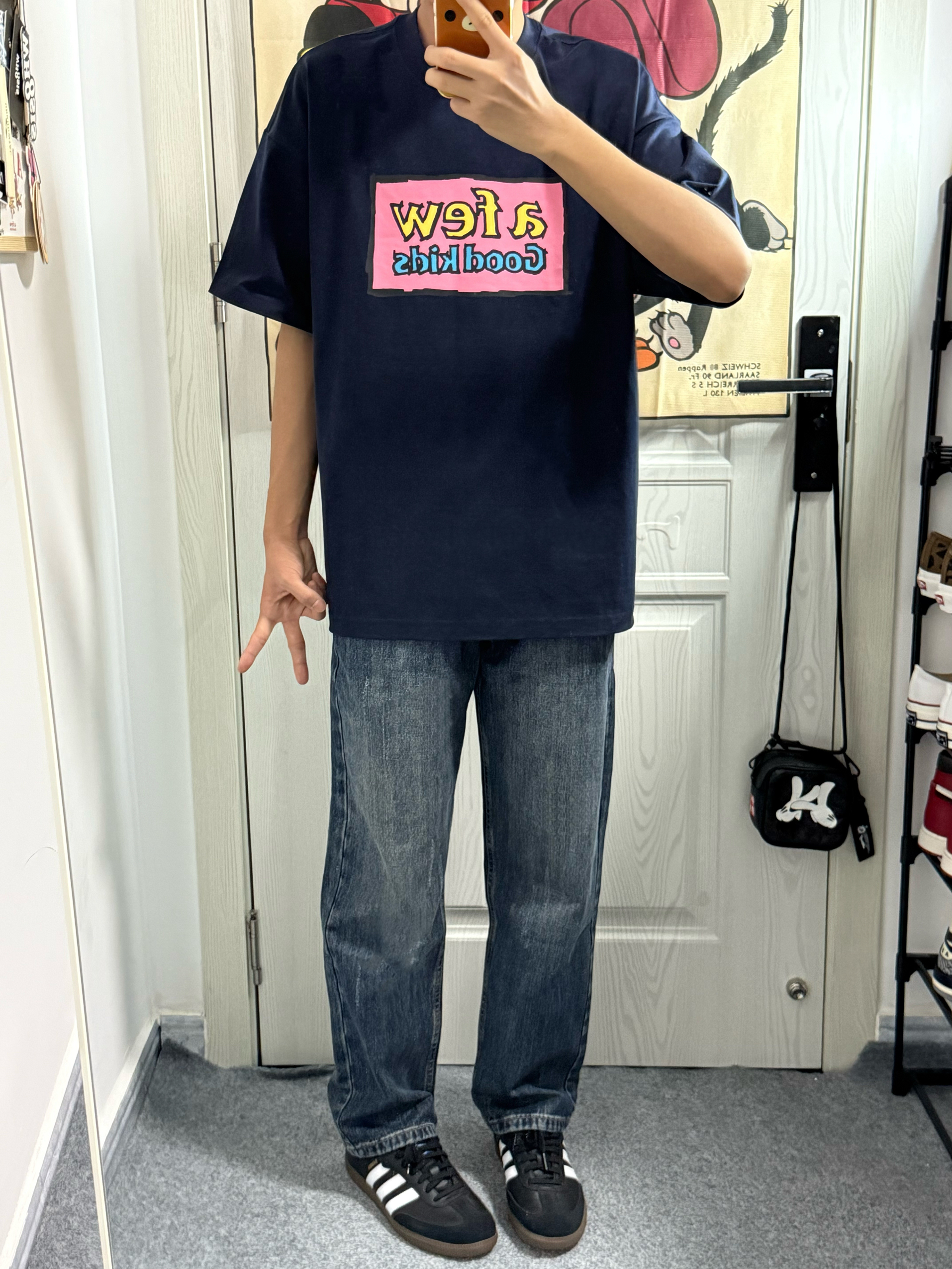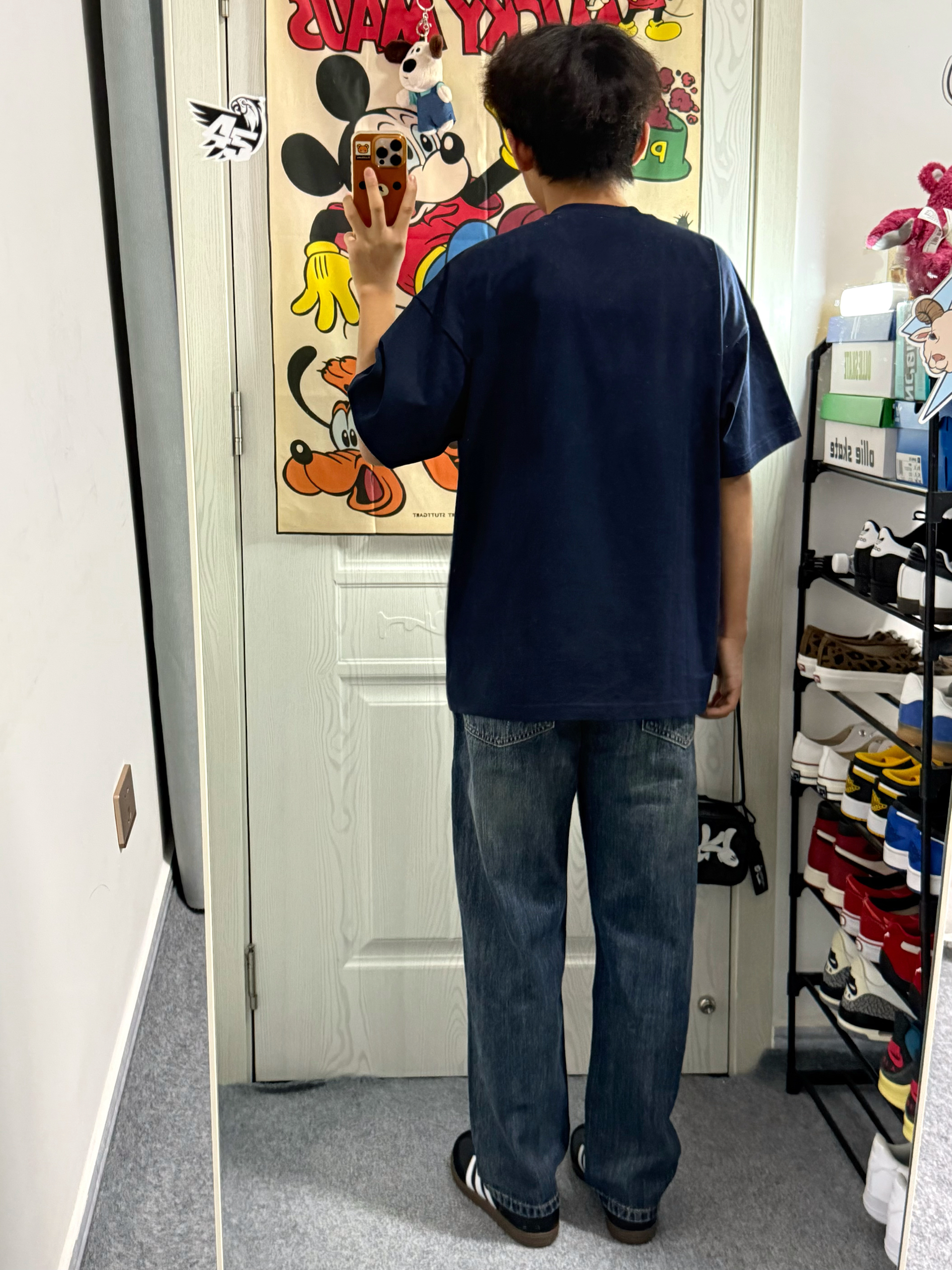 👀/今日份夏季穿搭分享🍉 藏蓝色🫐T恤➕复古蓝🔵直筒牛仔裤 搭配adidas黑色⚫️德训鞋 胸前LOGO涂鸦印花🤩 裤子修身版型 加上遁形后袋设计🥳 整体深色系搭配 很适合我这个黑皮boy👦🏾