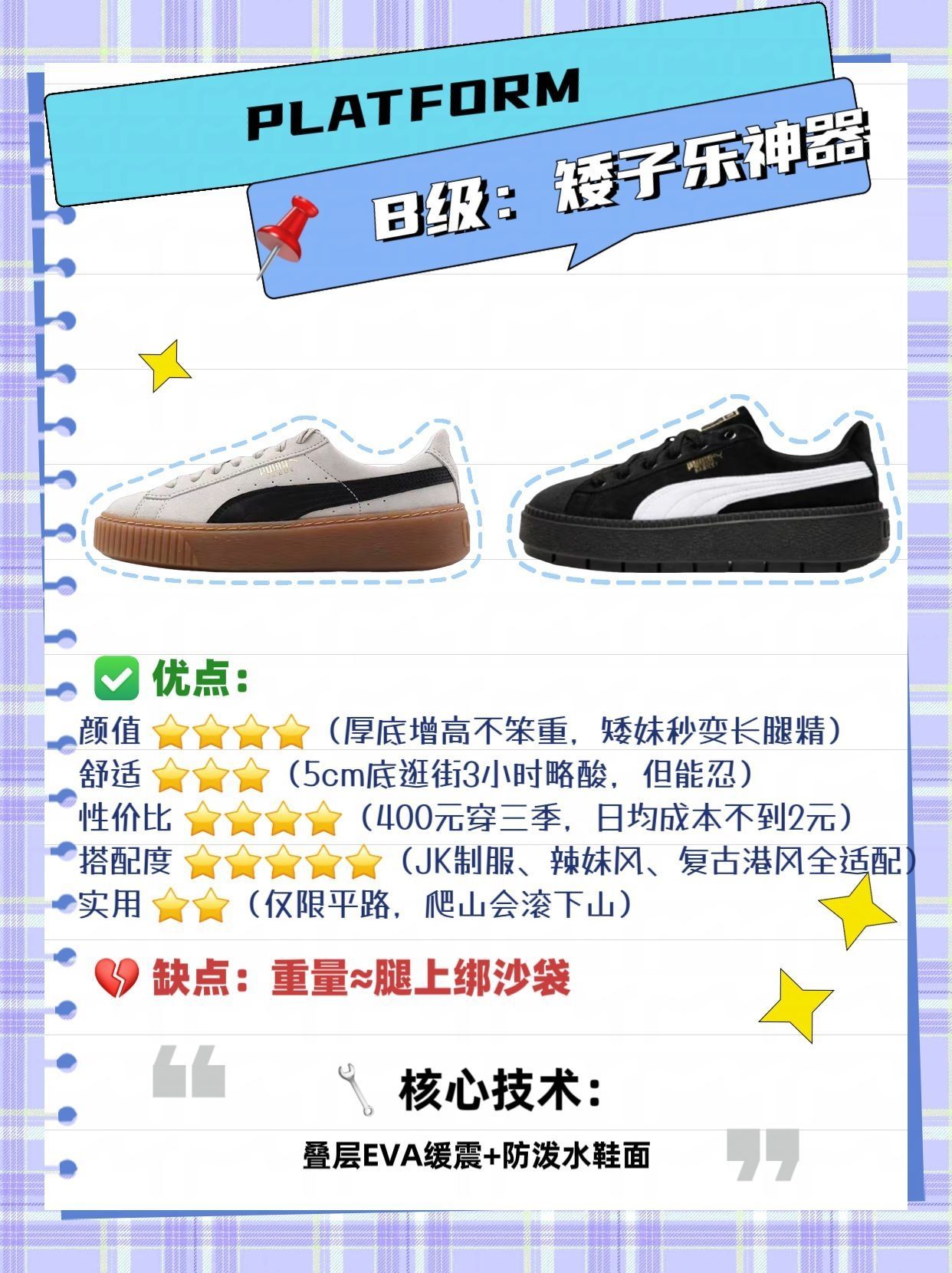 本篇笔记关联了Puma/彪马 Suede Platform Rihana 蕾哈娜 松糕鞋 板鞋 复古百搭防滑耐磨舒适厚底休闲 黑色/米白/棕色、Puma/彪马 Thunder 时尚复古 防滑耐磨 透气 厚底运动 增高鞋 黑黄绿红、Puma/彪马 Thunder 时尚复古 防滑耐磨 透气 厚底运动 增高鞋 白红绿等商品,为用户提供真实的使用体验和购买参考。