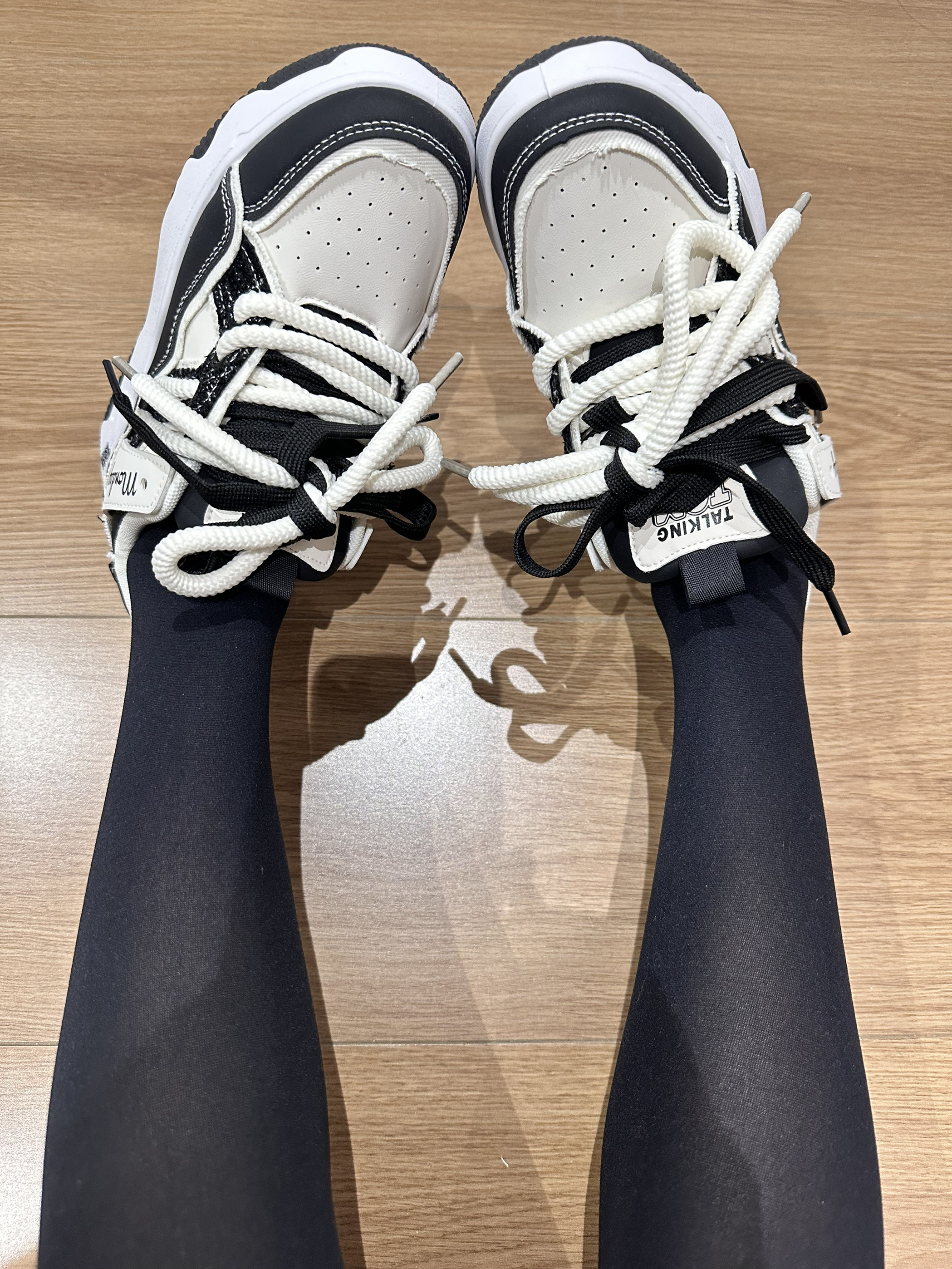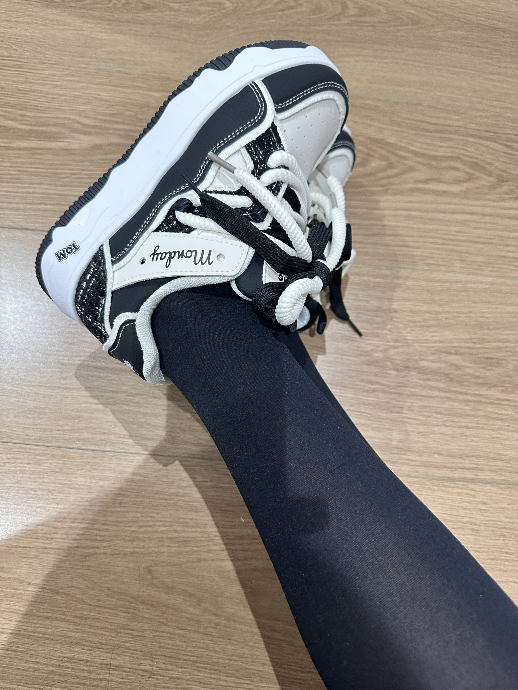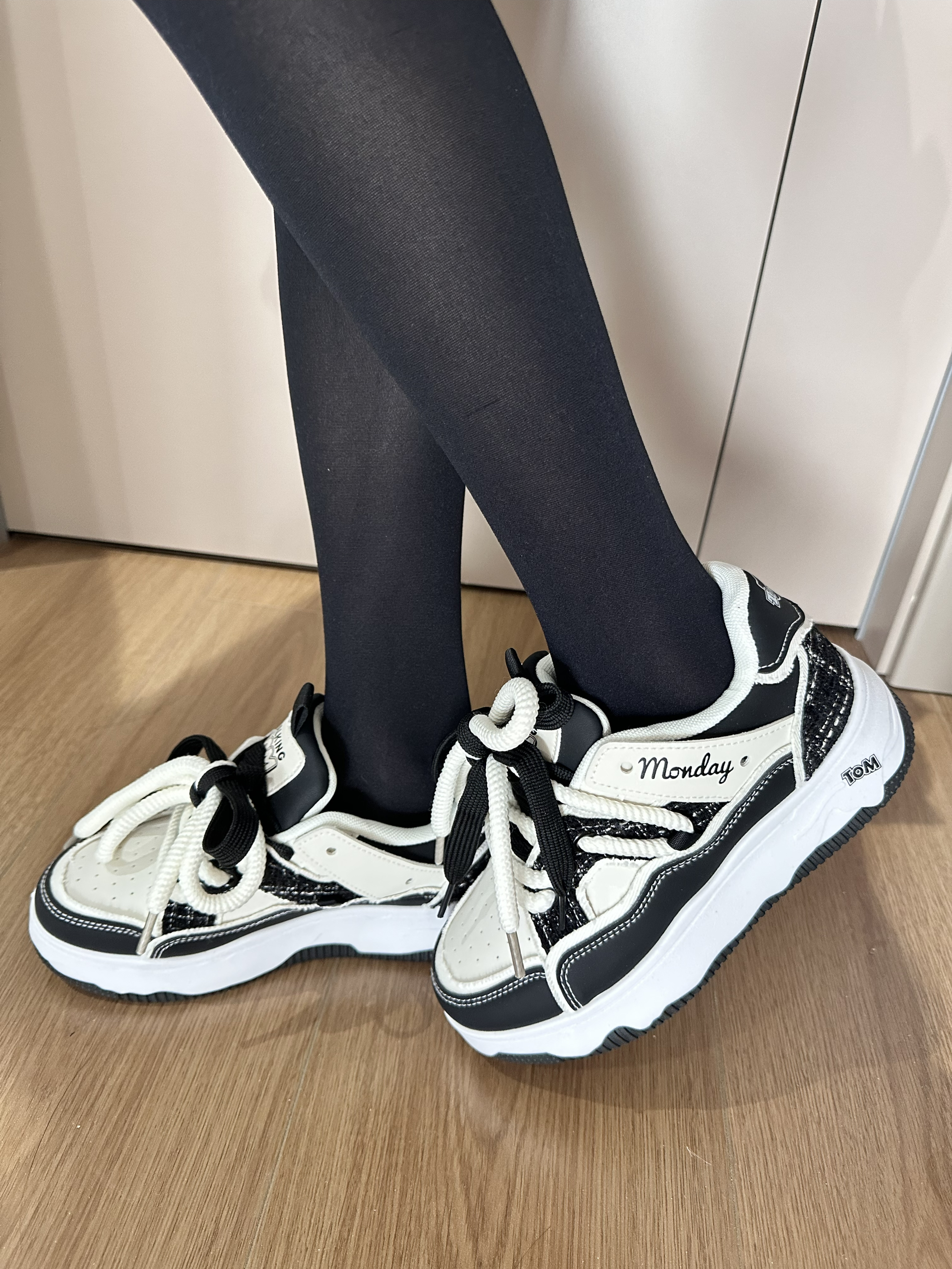 今天穿的厚黑是三朵棉家的 搭配了一双黑白配色的板鞋 鞋子的鞋底是增高的 上脚显高显腿🦵长 脚感也不错 一年四季都爱穿~