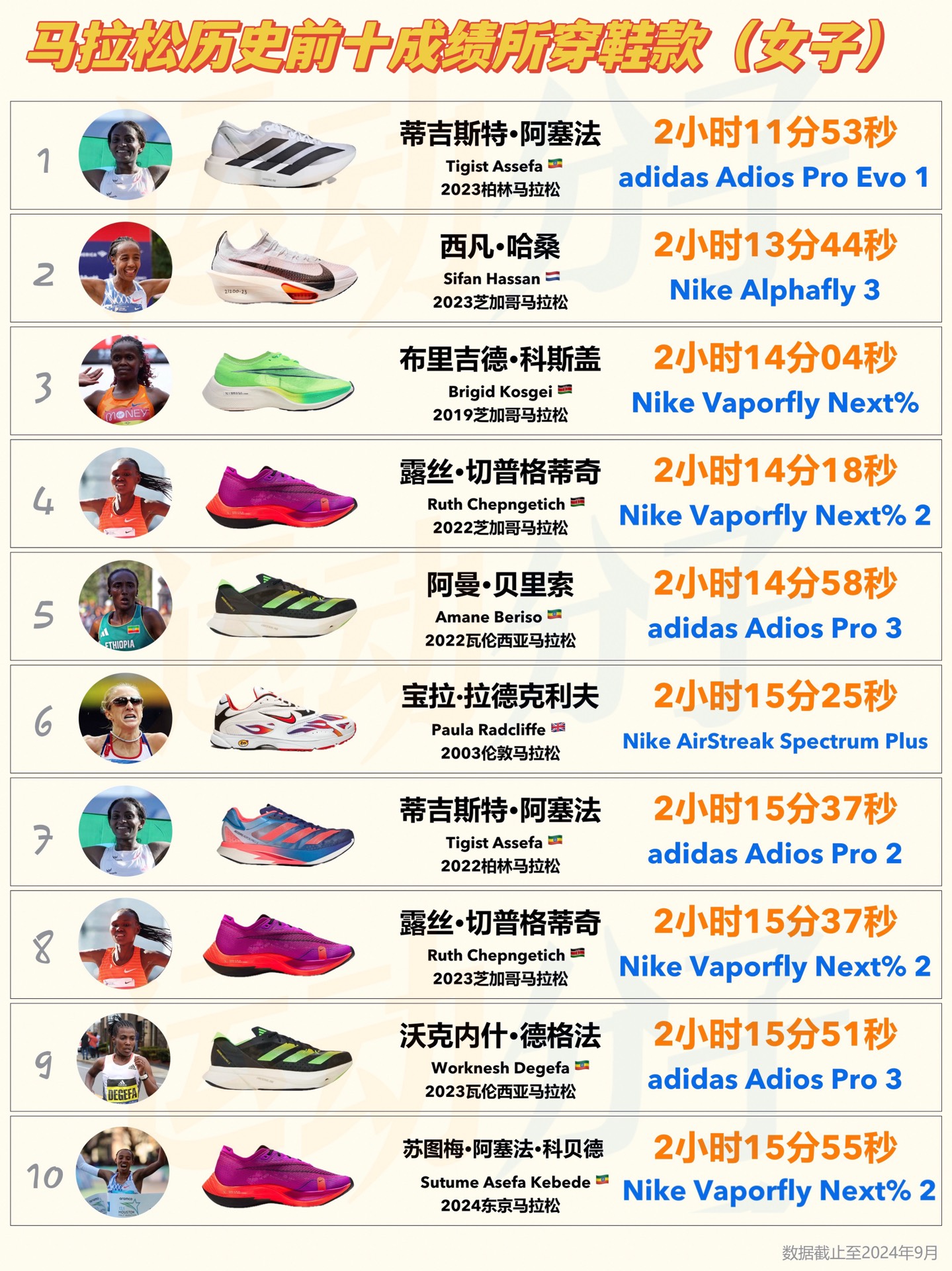 男女前十马拉松最快成绩,分别由5人(男子)、8人(女子)创造; 除了拉德克里夫2003年的前世界纪录,其余男女子最快几乎都在近5年内跑出; 男女历史前十也都由Nike(14双)和adidas(6双)包揽。Nike上榜7款、adidas上榜3款; 就成绩而言,中底相同的Vaporfly Next%/Vaporfly Next% 2显然相当成功,它们也的确在2019-2023年间创造了诸多出色成绩; ...