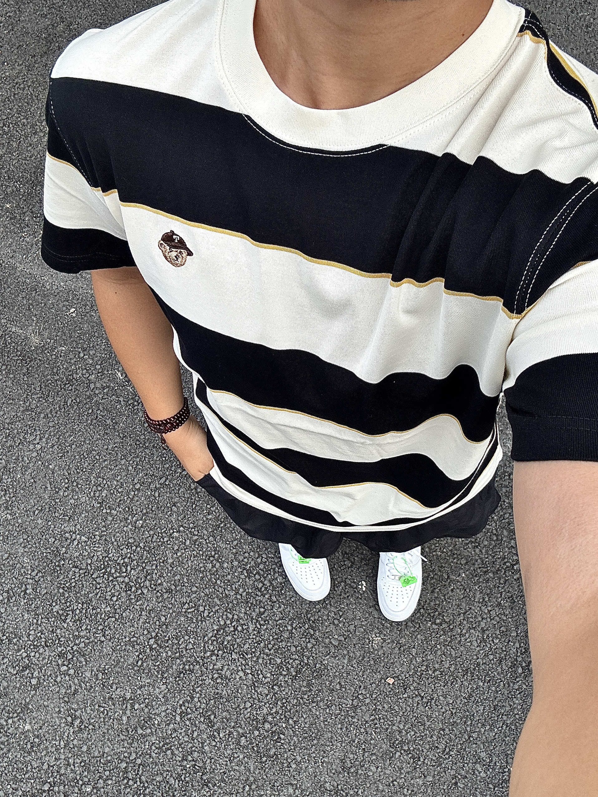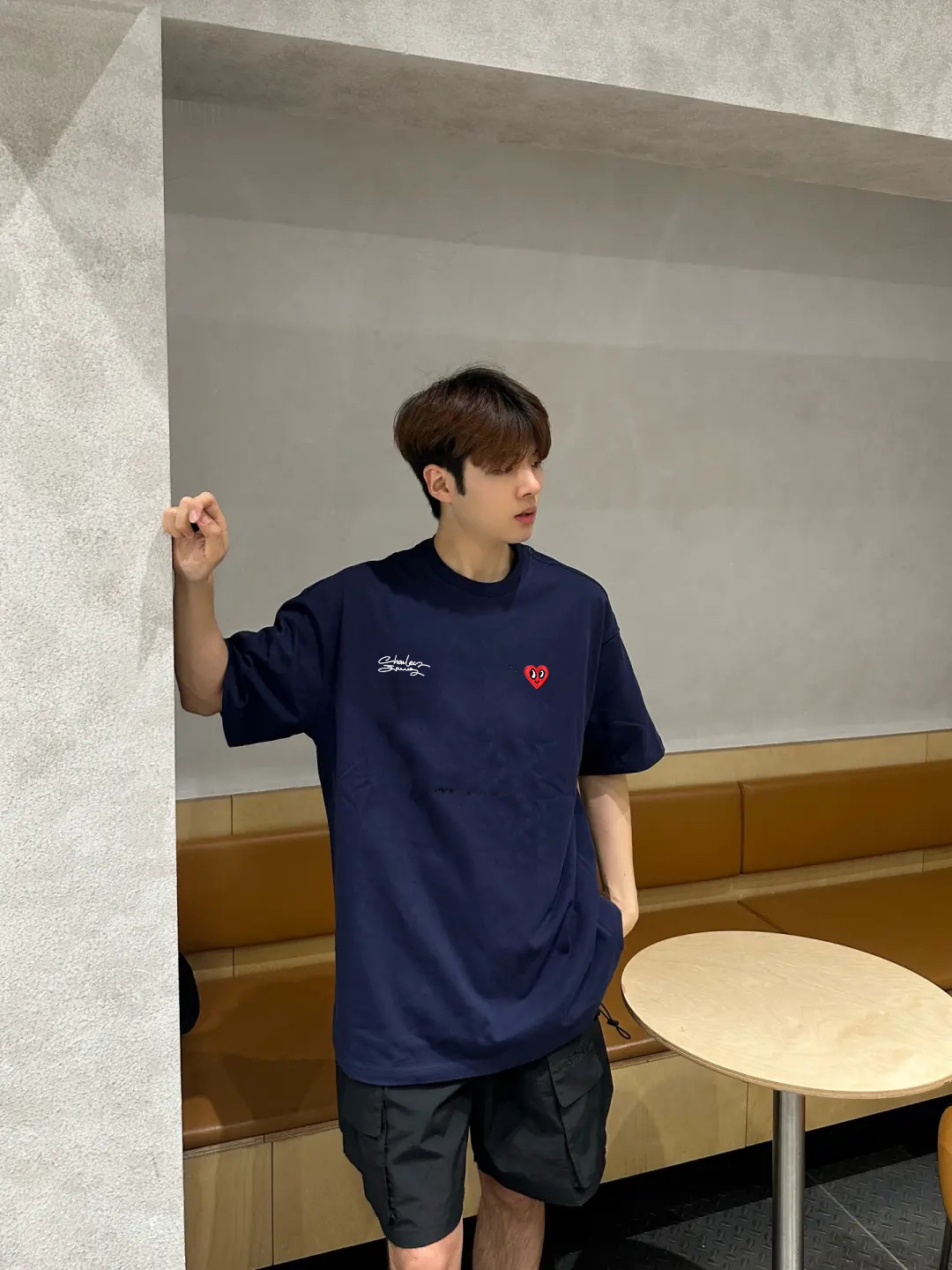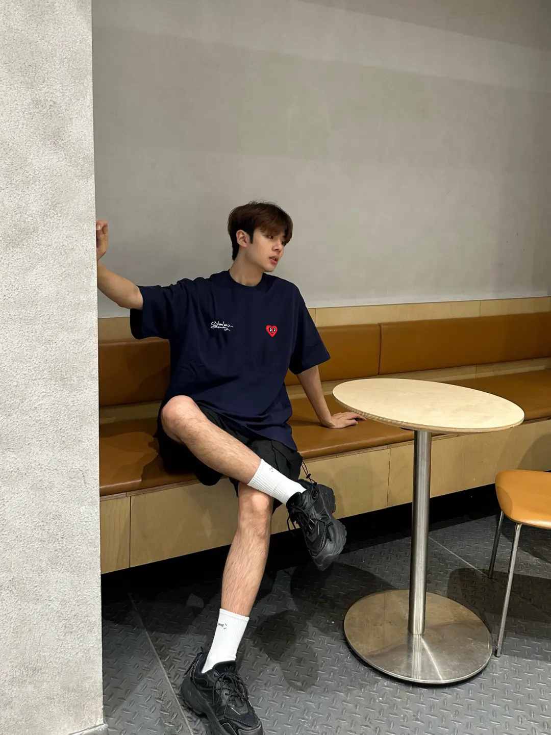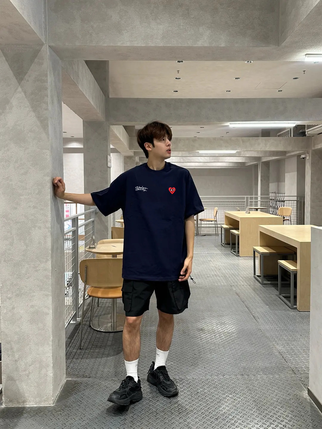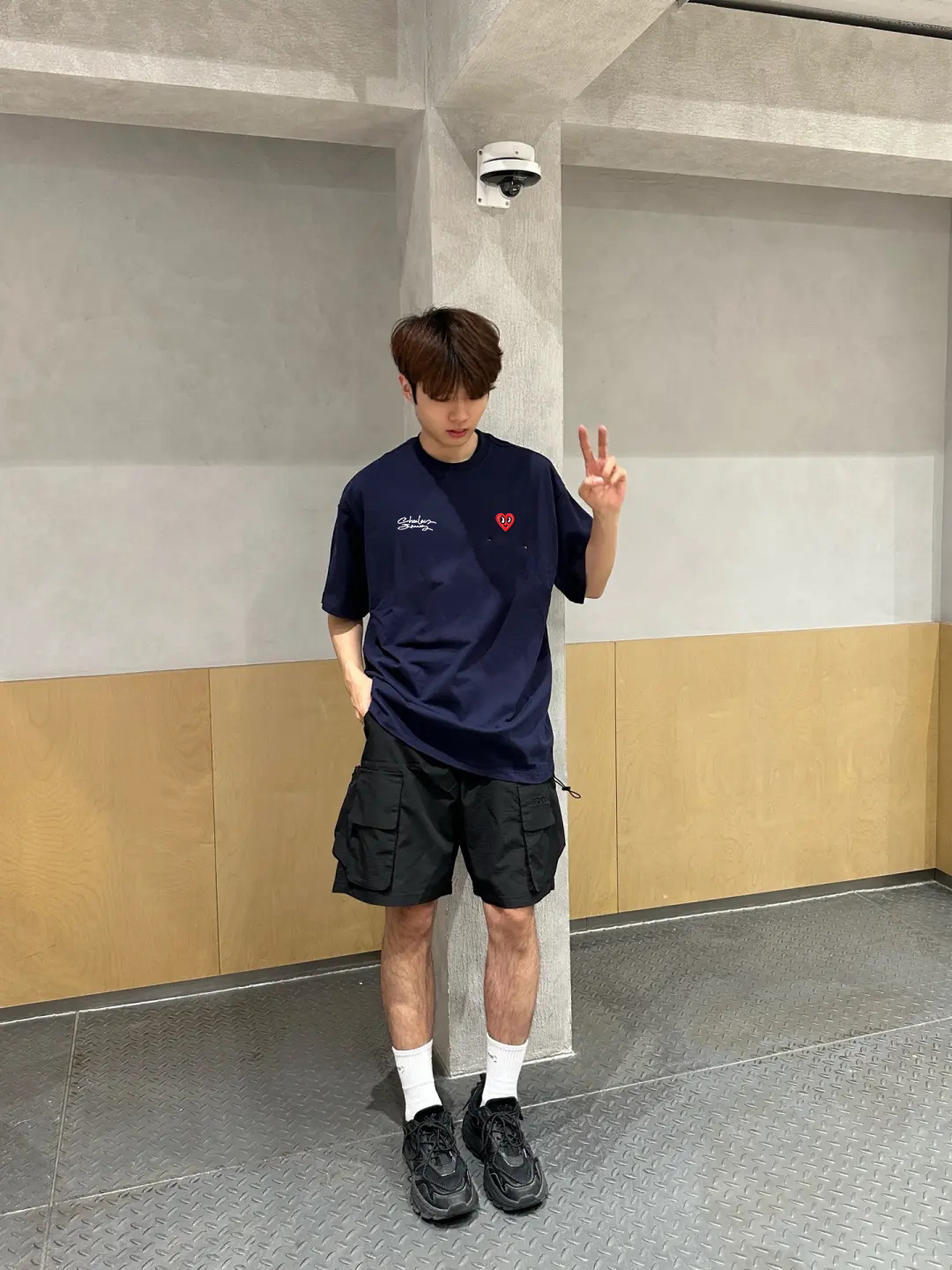 上身一件来自查尔斯桃心的藏青色短袖,搭配一条工装口袋短裤,一整套真的街头也很舒适,跟着穿帅就行了!