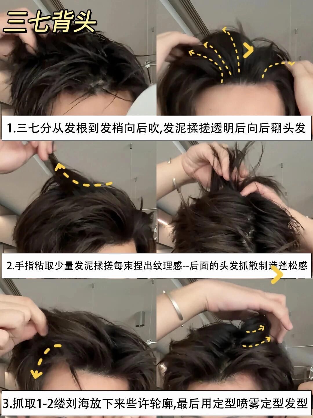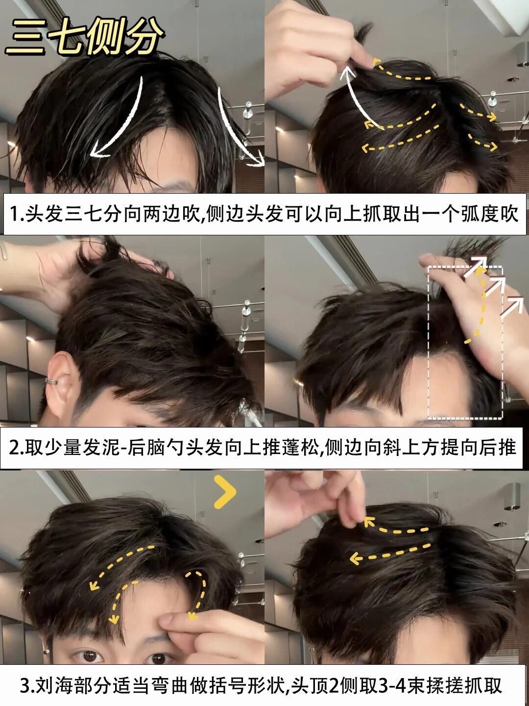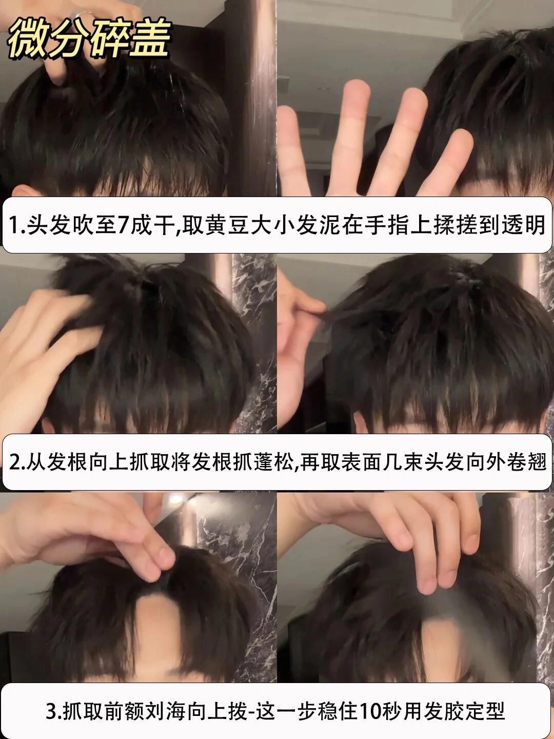 一个发型,打造三种不同造型,任意场合不同风格型男气质任意切换,抓住以下教程几个重点,你也能轻松每周不同场景帅气爆棚不重样 ✅Step 1:微分碎盖 🌟关键点:蓬松感 🧰工具准备:发泥+ 细齿梳 (没梳子用手指也可) 🏷️操作指南: 1. 头发吹至8成干,用梳子(手指)(刘海自然前落)。 2. 取黄豆大小发泥,掌心搓匀后从发根向发梢轻抓,重点塑造头顶蓬松度。 3. 刘海部分向后提拉,发梢向后微翘,可...