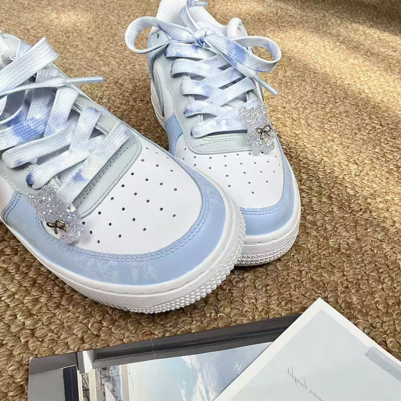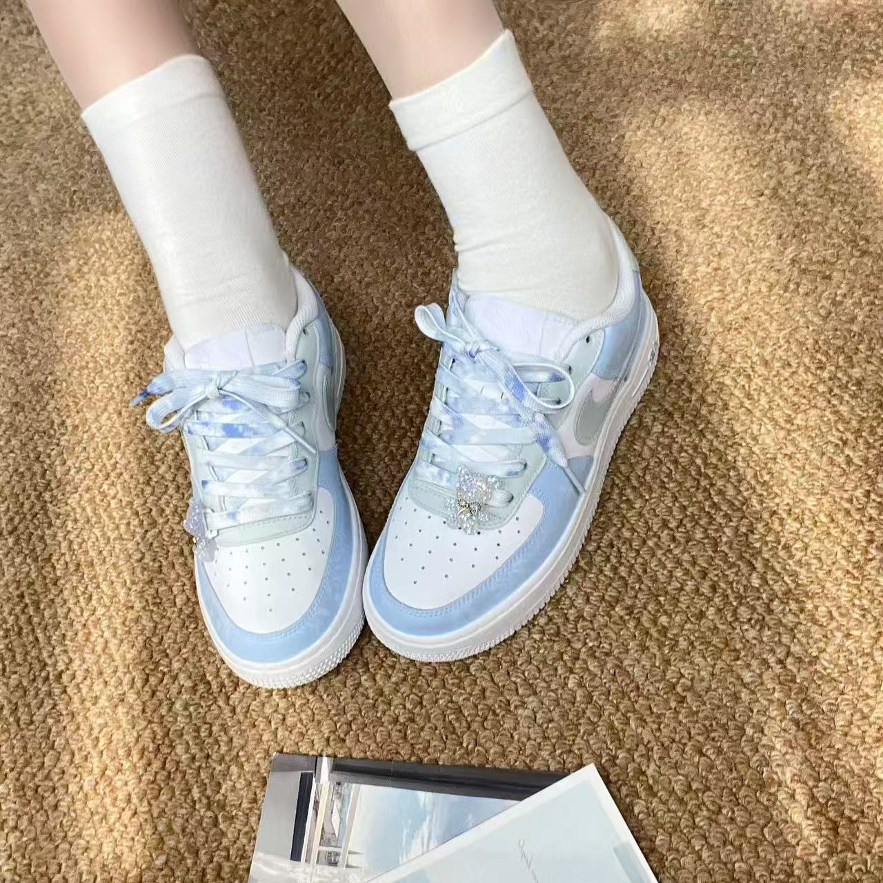 家人们!我又双叒叕被这双耐克鞋拿捏了!这蓝白配色也太梦幻了吧,就像把蓝天白云穿在脚上,简直是甜妹专属。鞋面的材质看着很有质感,搭配的小蝴蝶结更是戳中我的少女心,细节满满。上脚巨好看,显脚小还显腿长,配白色袜子和小裙子,妥妥的校园甜妹风。而且穿着也舒服,走路久了也不累。我现在一出门就想穿它,真的爱到不行,恨不得向全世界安利!