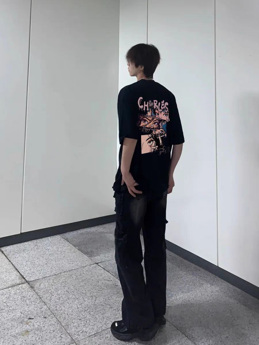 春季男生穿一身黑色真的超帅😎 ⬆️上身一件黑色卡通印花短袖T恤 圆领宽松版型舒适修身 轻薄面料亲肤透气 天热穿也不会闷汗 胸前品牌logo简约大气 背后卡通印花趣味性十足👍 ⬇️搭配条黑色牛仔长裤 版型宽松无束缚感春季出游休闲穿酷酷的🆒 图源网络侵删