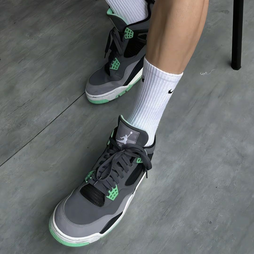Jordan Air Jordan 4 Retro Green Glow 灰绿简评 外观设计 • 评分:🌟🌟🌟🌟🌟 • 简评:AJ4灰绿的外观设计堪称经典与创新的完美结合。深灰色鞋面搭配黑色网格,绿色的梯形鞋带扣环、大底和飞人标识格外醒目,夜晚还能夜光,鞋舌的红色飞人Logo更是点睛之笔。 缓震性能 • 评分:🌟🌟🌟🌟 • 简评:AJ4灰绿采用前后掌独立AIR气垫设计,前掌减震效果...
