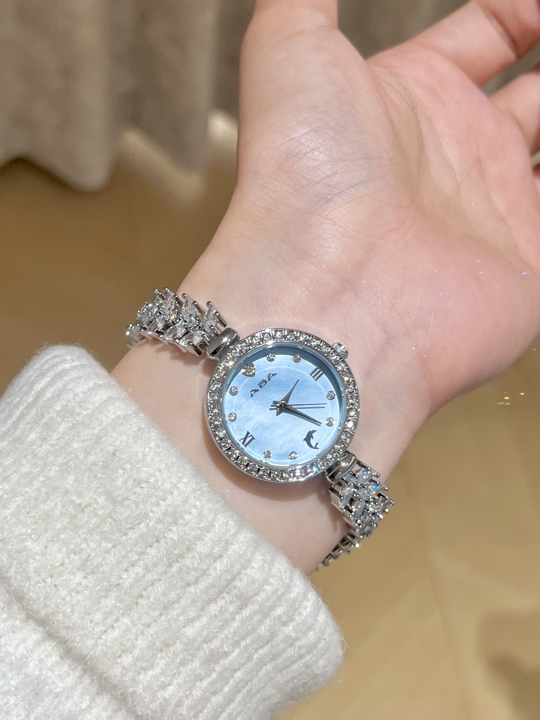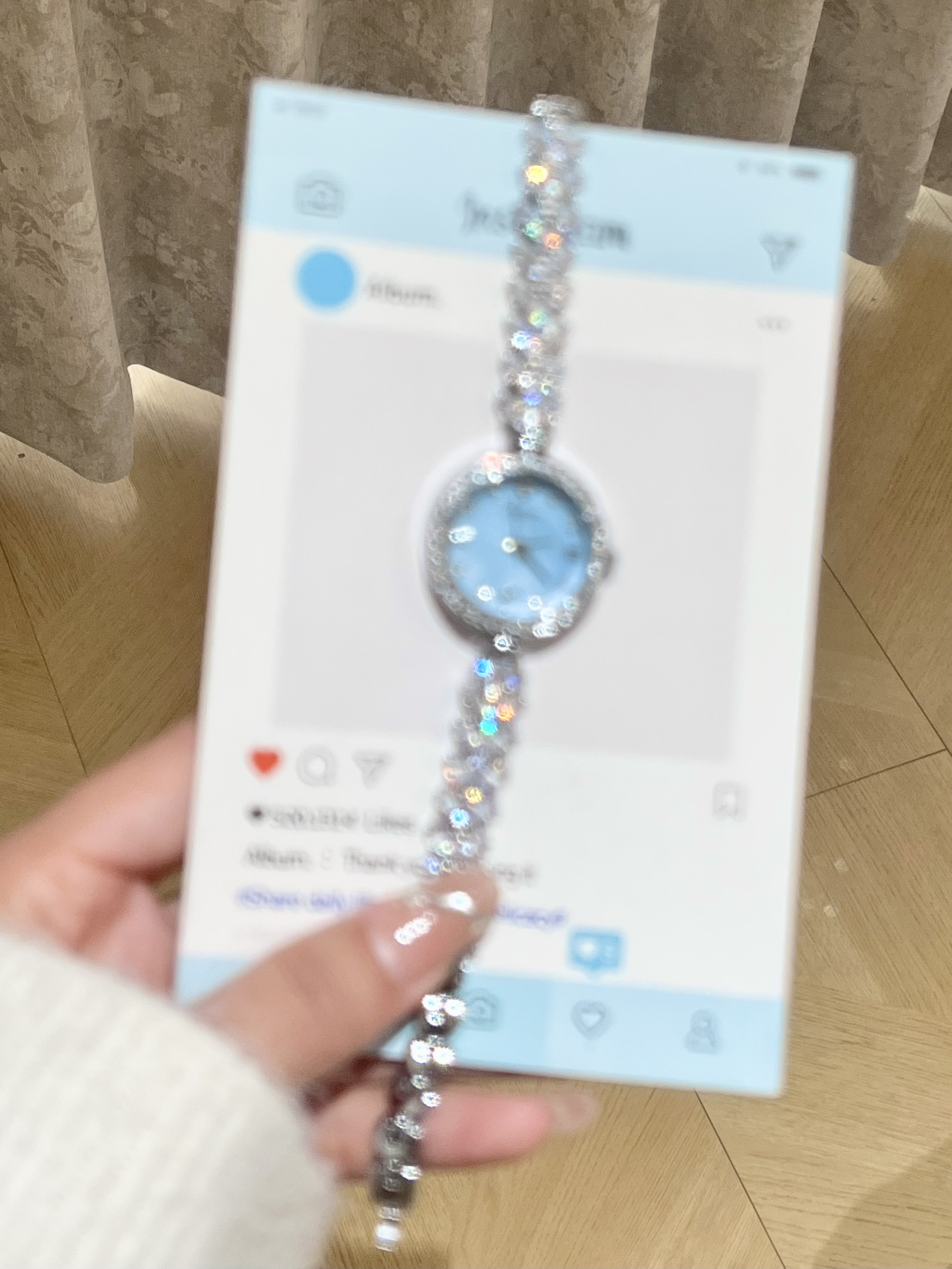 我这个蓝色控又把持不住了😭 终于还是忍不住拿下了它 露手腕的季节我比较喜欢戴亮闪闪的手表 蓝色贝母表盘配上满钻的人鱼表链 要被闪晕了好吗 春天穿个白色毛衣戴上它就很好看 显得我手腕细长,还蛮精致的