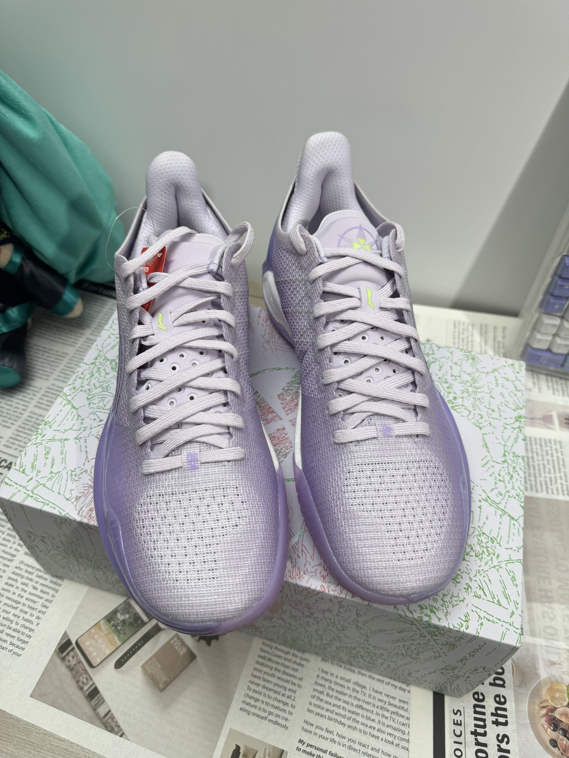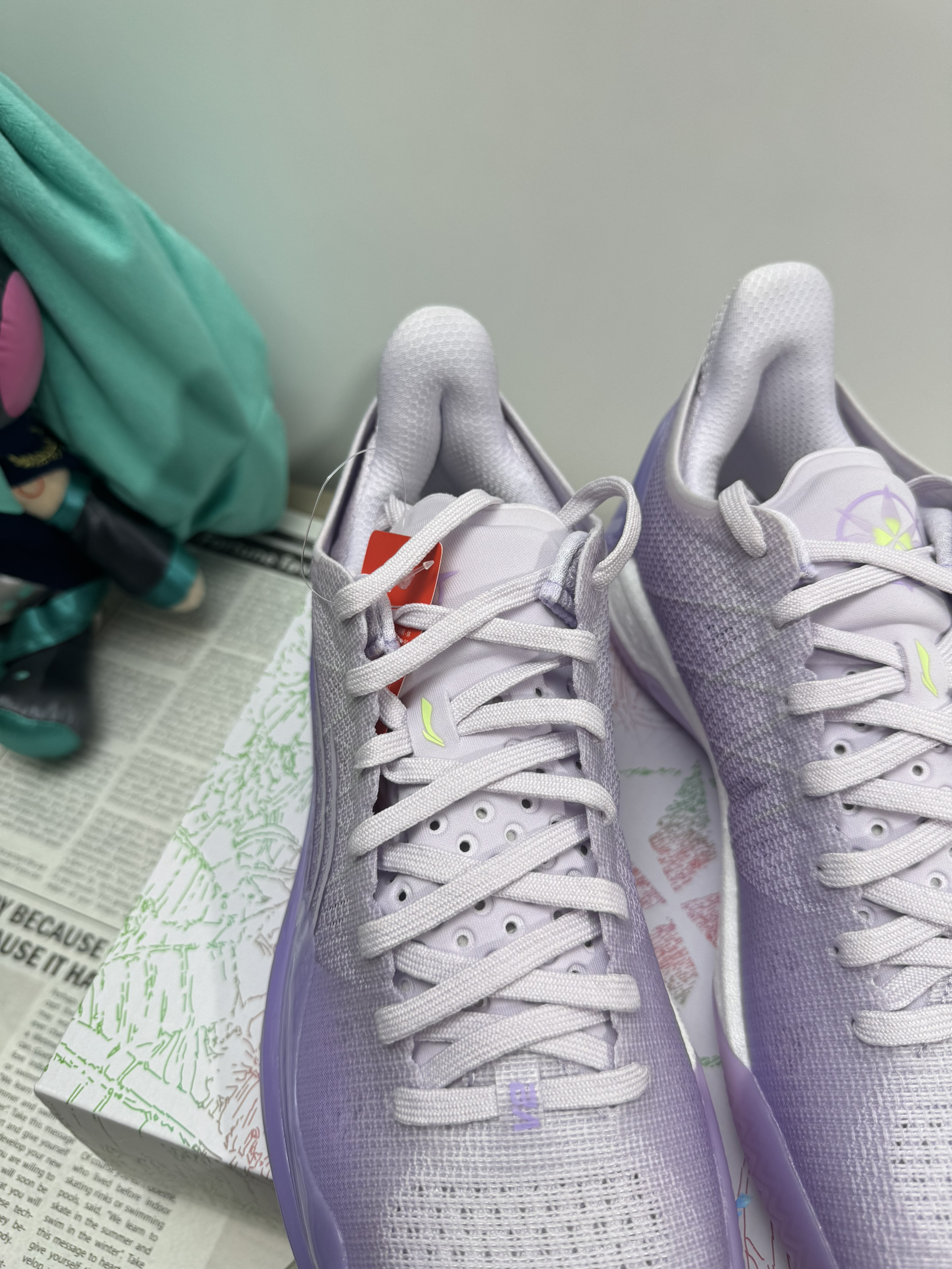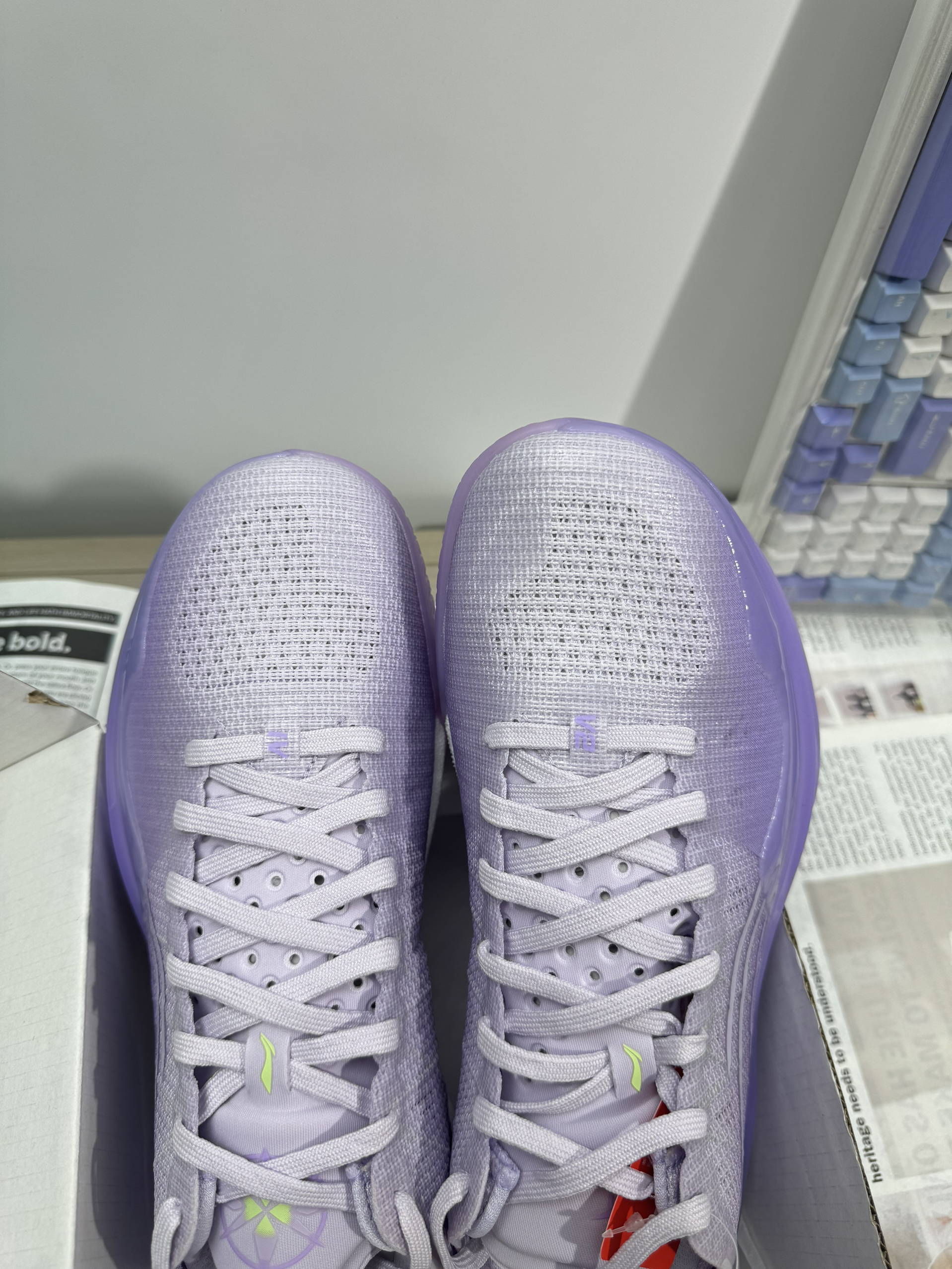 李宁利刃系列一直都是颜值出众的篮球鞋,这次的紫白渐变配色真的惊艳到我了,已经把我给迷住了,鞋子上脚全包裹的,前面是网状的透气打久了不闷脚,十分的赞,缺点就是不耐脏