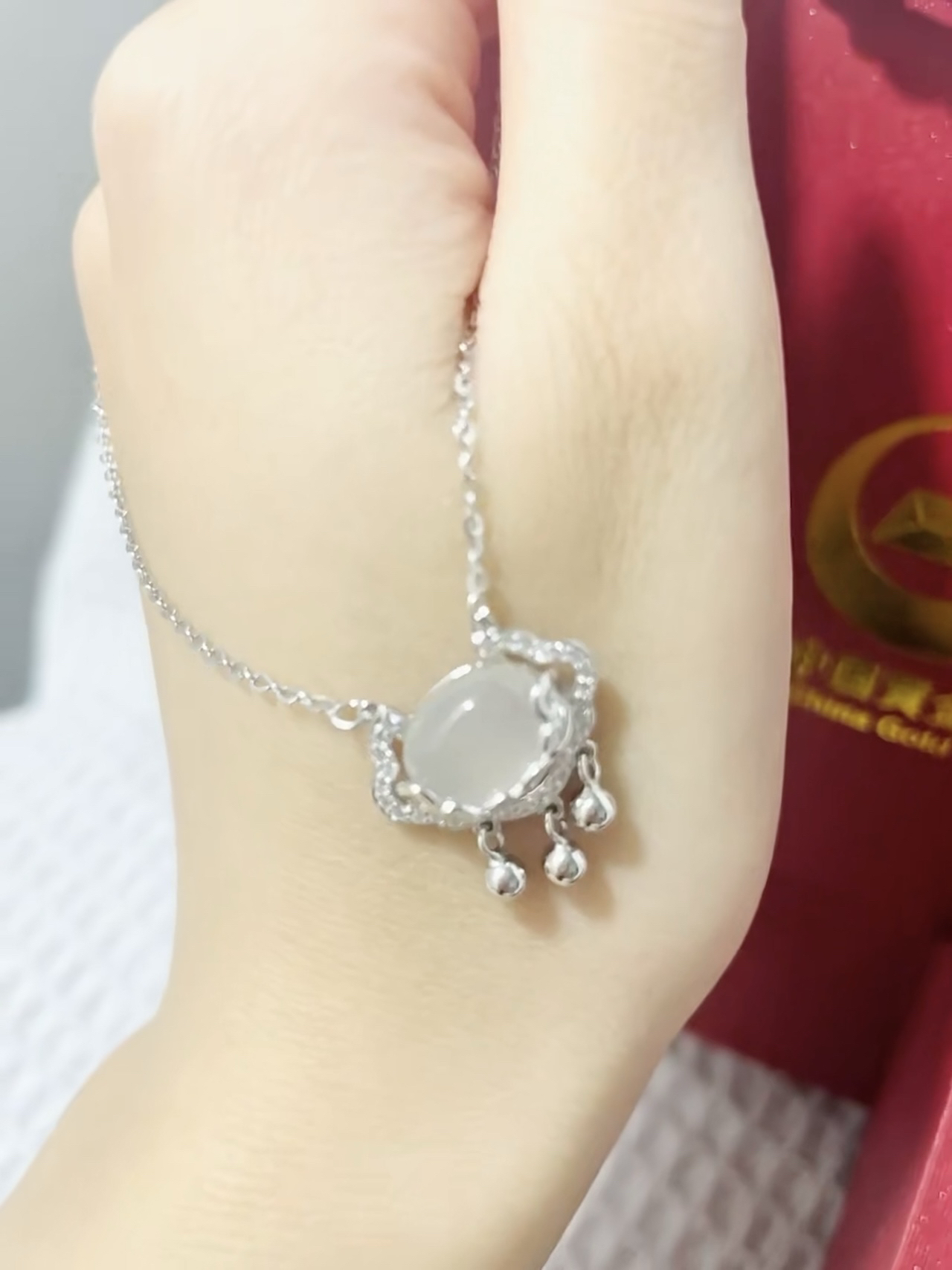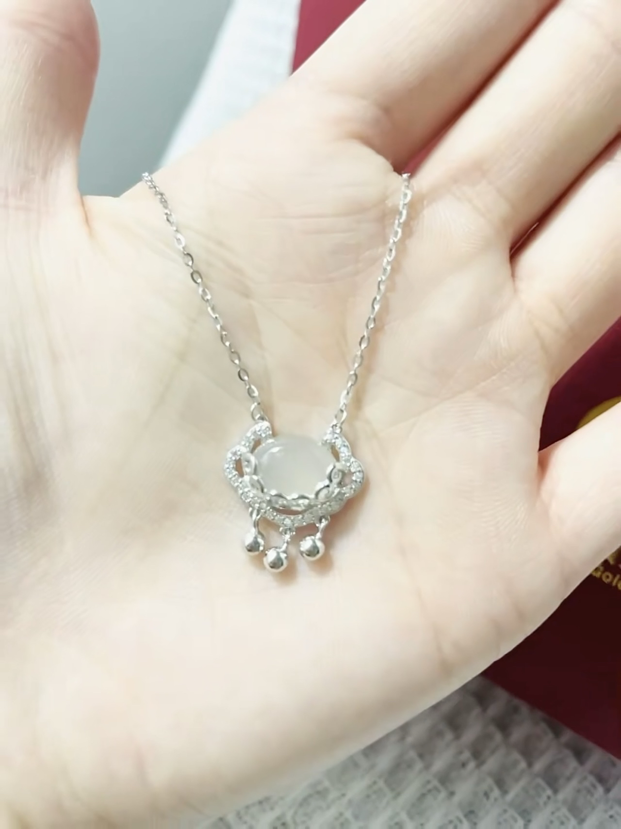 拆开快递那一刻真嘟好激动,一打开泰好看辣!完全不显老气,戴着舒服显白,大小也可以调节,项链打吊坠设计的很巧妙,像有铃铛🔔一样,不停的响,佩戴中也没有过敏的现象,也不会掉色,狠狠爱住了!