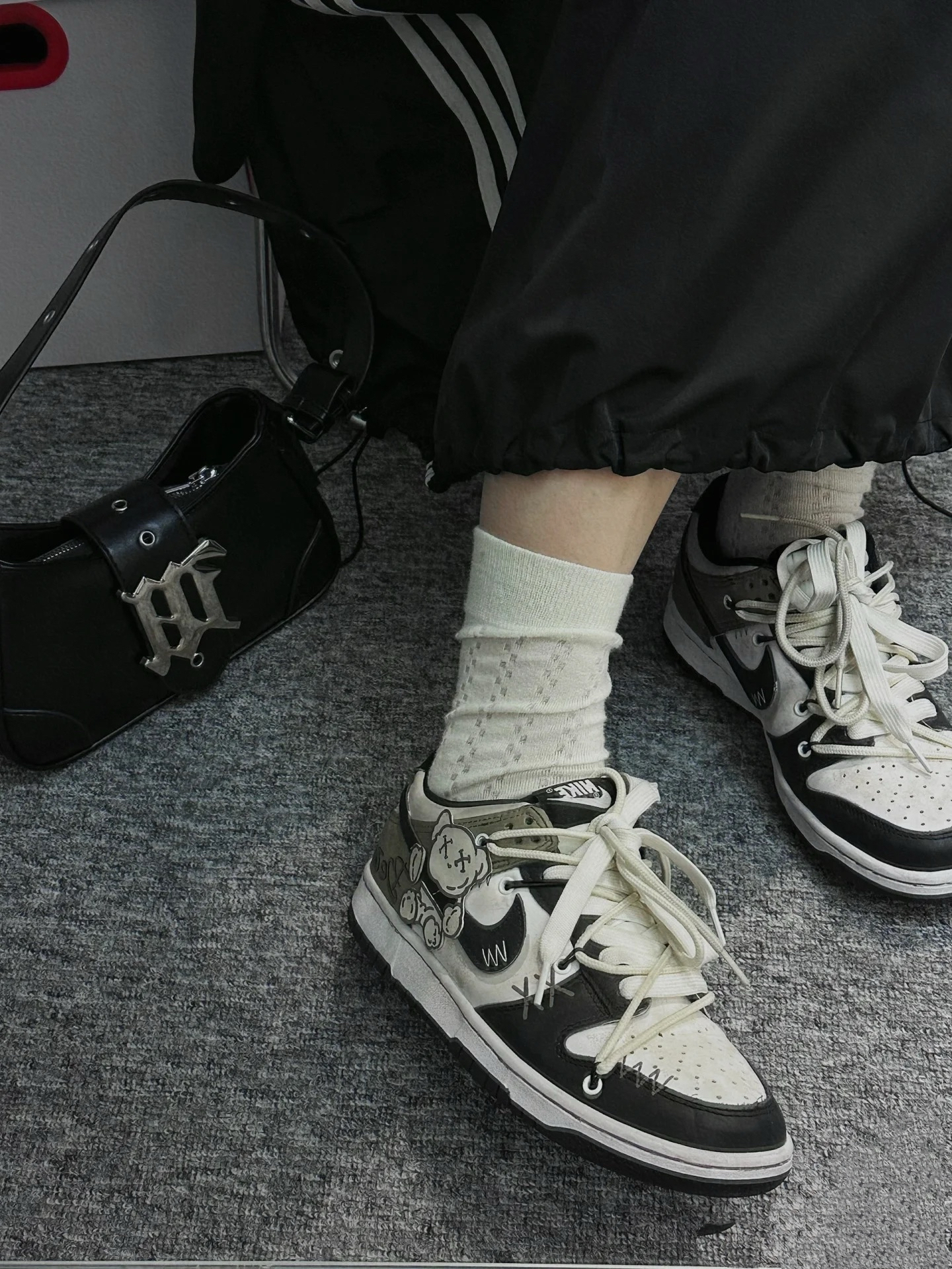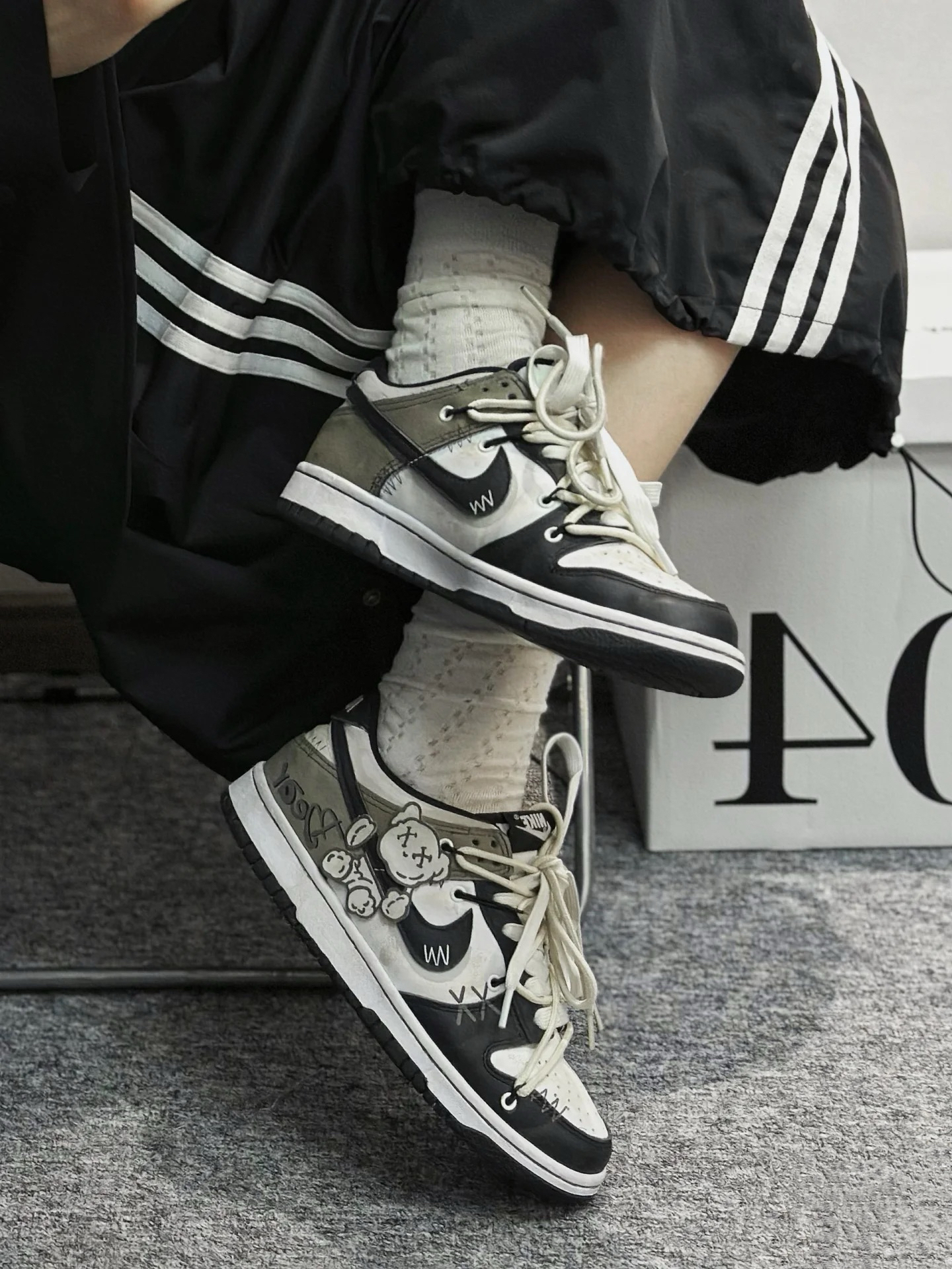 黑色加白色的搭配堪称经典基础色的搭配简直是韩系穿搭的精髓 侧面有布偶熊的涂鸦设计超级可爱 男生如果穿上了妥妥的美式街头帅哥 👟球鞋定制:布偶熊