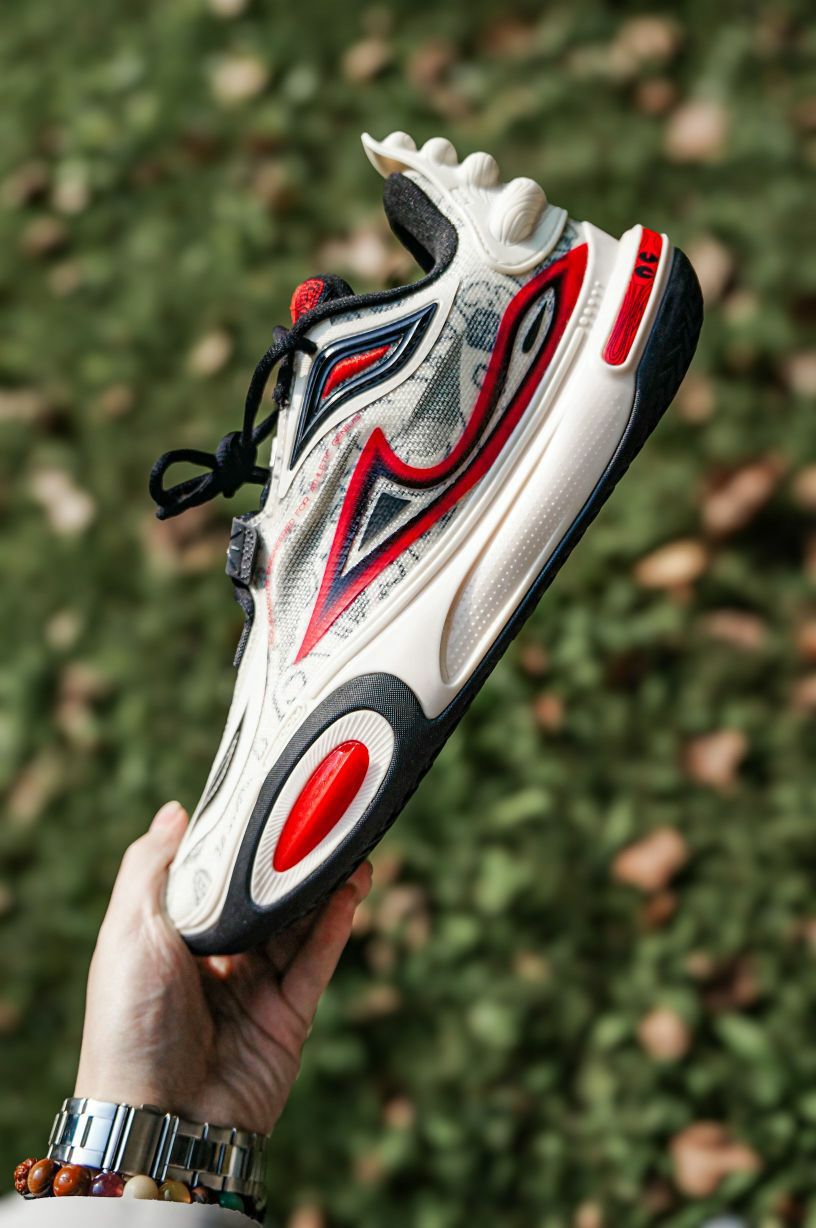可以看到全城11v2在鞋面上的设计语言表达是挺用心的,从线条上看粗线条细线条的变化运用,网纱后的虚化线条运用,logo处的实线运用,将变化节奏运用到了极致。再就是点线面的结合运用,鞋带孔和前掌放侧翻的红色点缀,鞋身大面积的乳白色,加上之前说的线条运用,三者结合成了经典的点、线、面结合形成美感。 通体的配色灵感可能来自我们京剧的红脸脸谱,国风味道浓郁,并且京剧脸谱的勾脸也是讲究点、线、面的结合,这种...