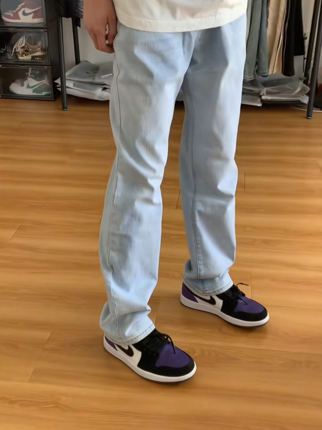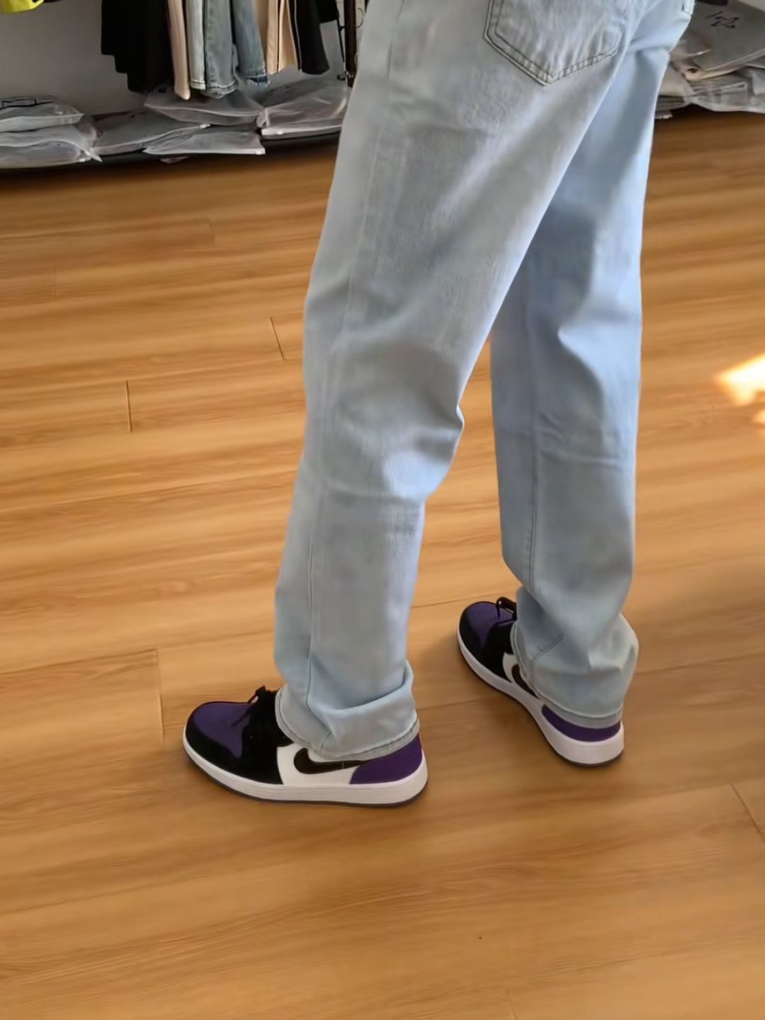 这双AJ1 Low Court Purple真的太百搭了!它的配色以经典黑、白、紫为主,无论是搭配牛仔裤、运动裤还是休闲裤,都能轻松驾驭。我试过用它搭配一条浅色牛仔裤和白色T恤,再加上一件黑色牛仔外套,整体感觉超有街头感,又不会显得过于花哨。如果你喜欢日系风格,搭配一条吊脚卡其裤和宽松衬衫,也能轻松营造出随性又时尚的感觉。