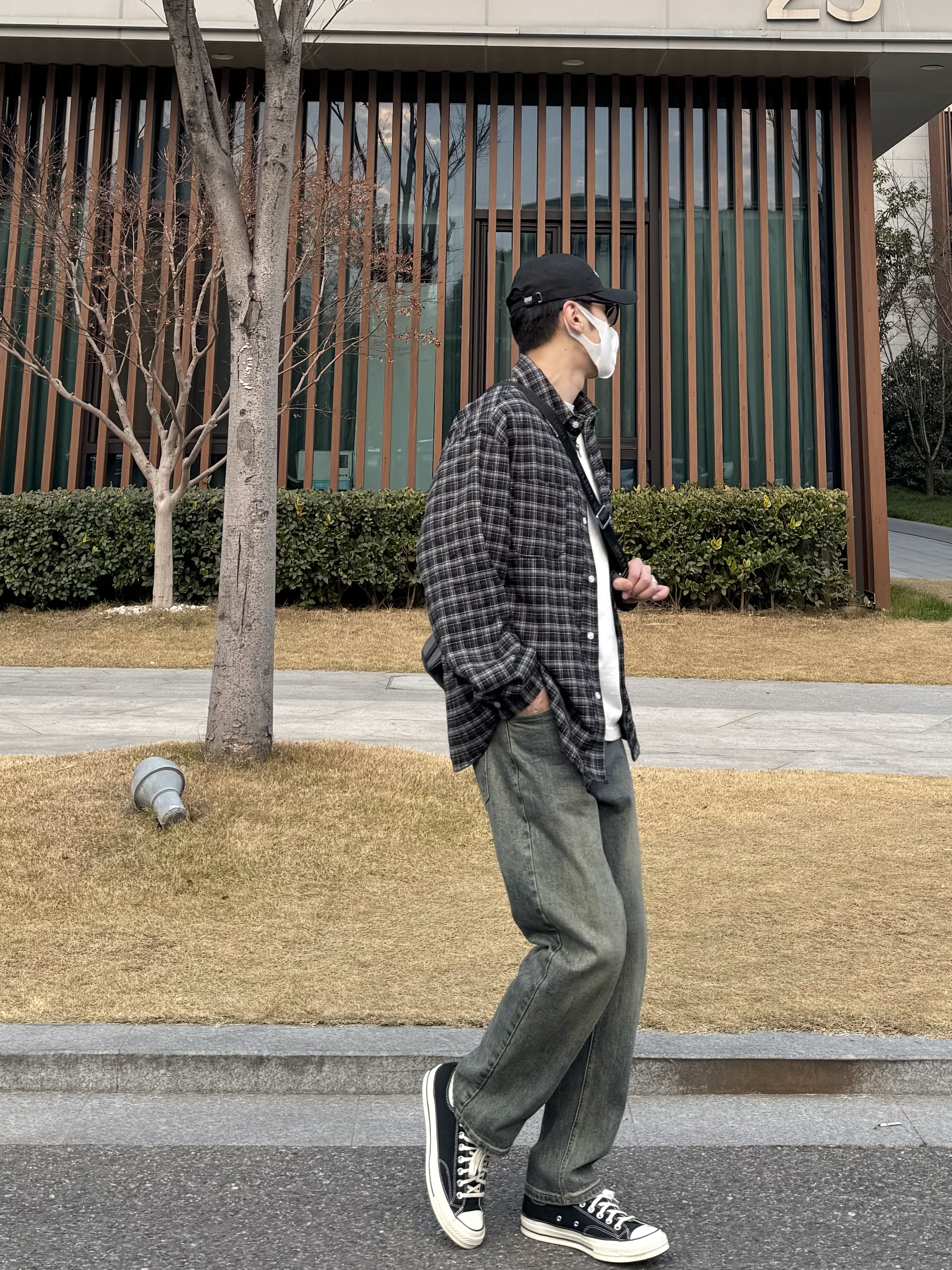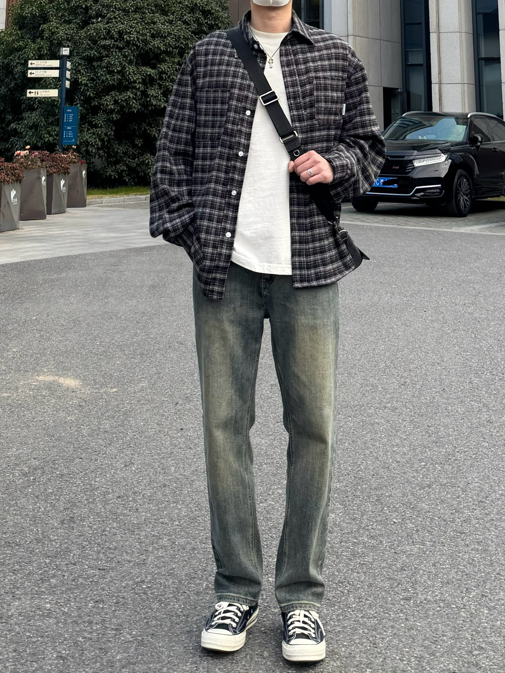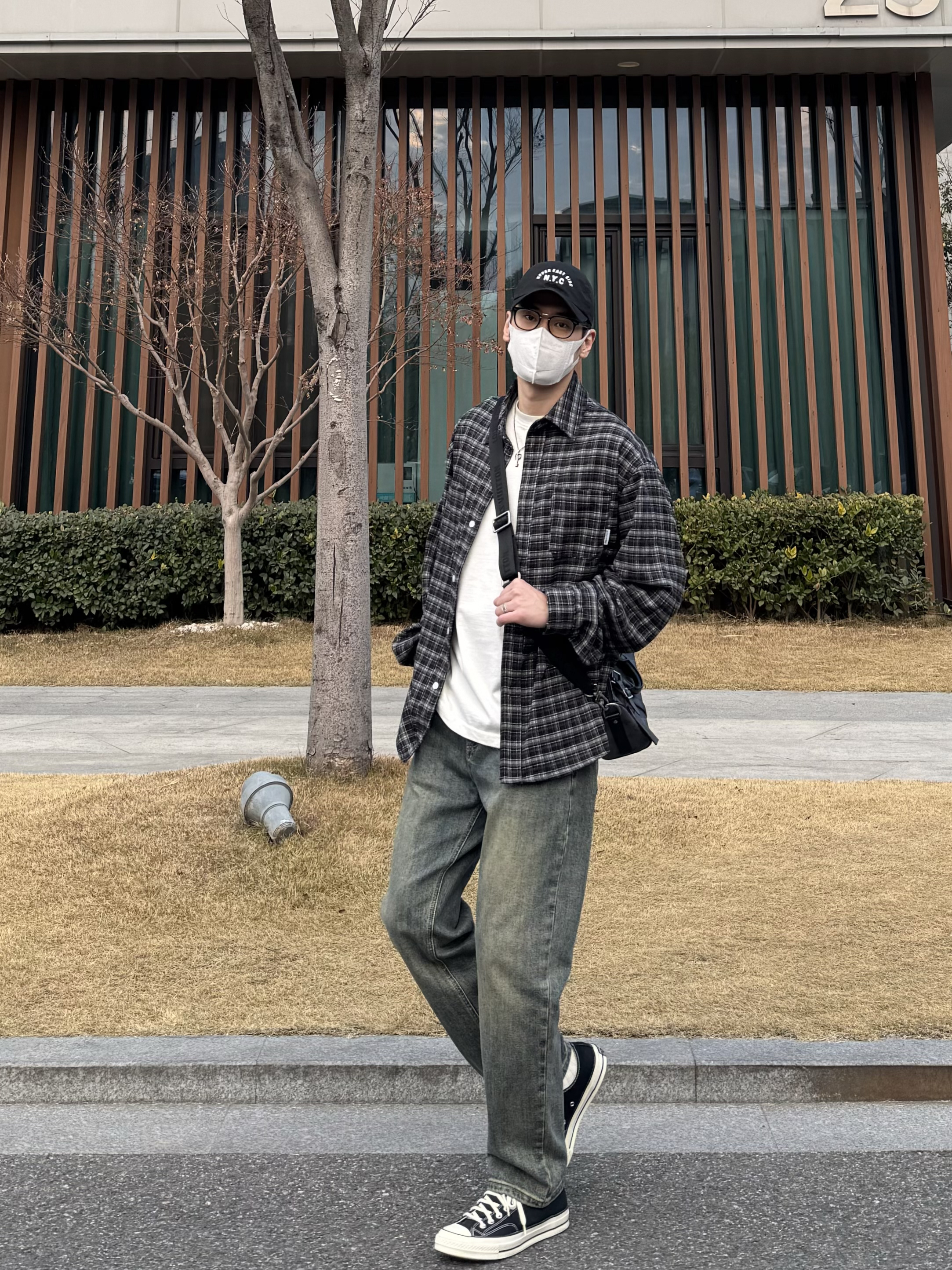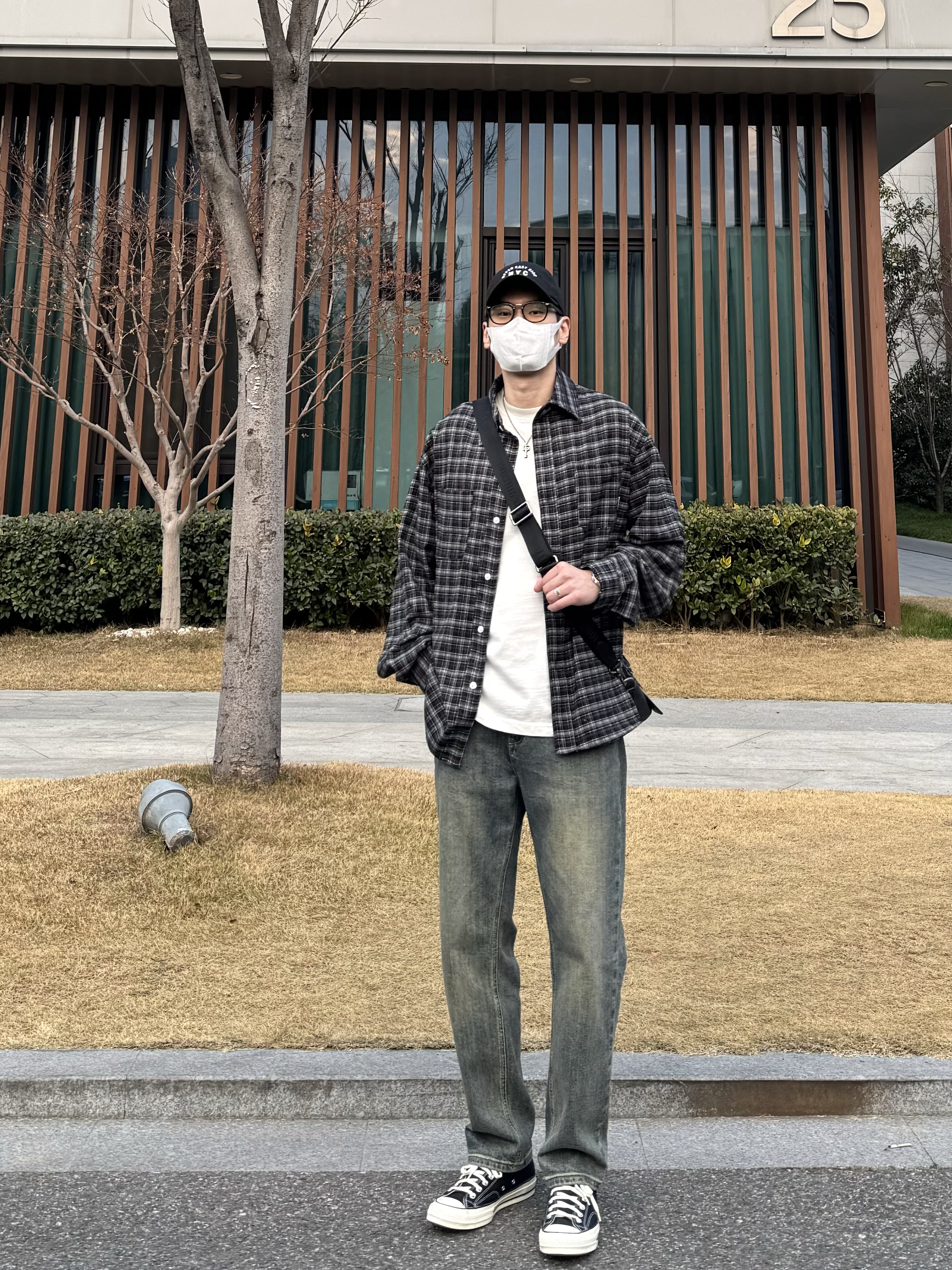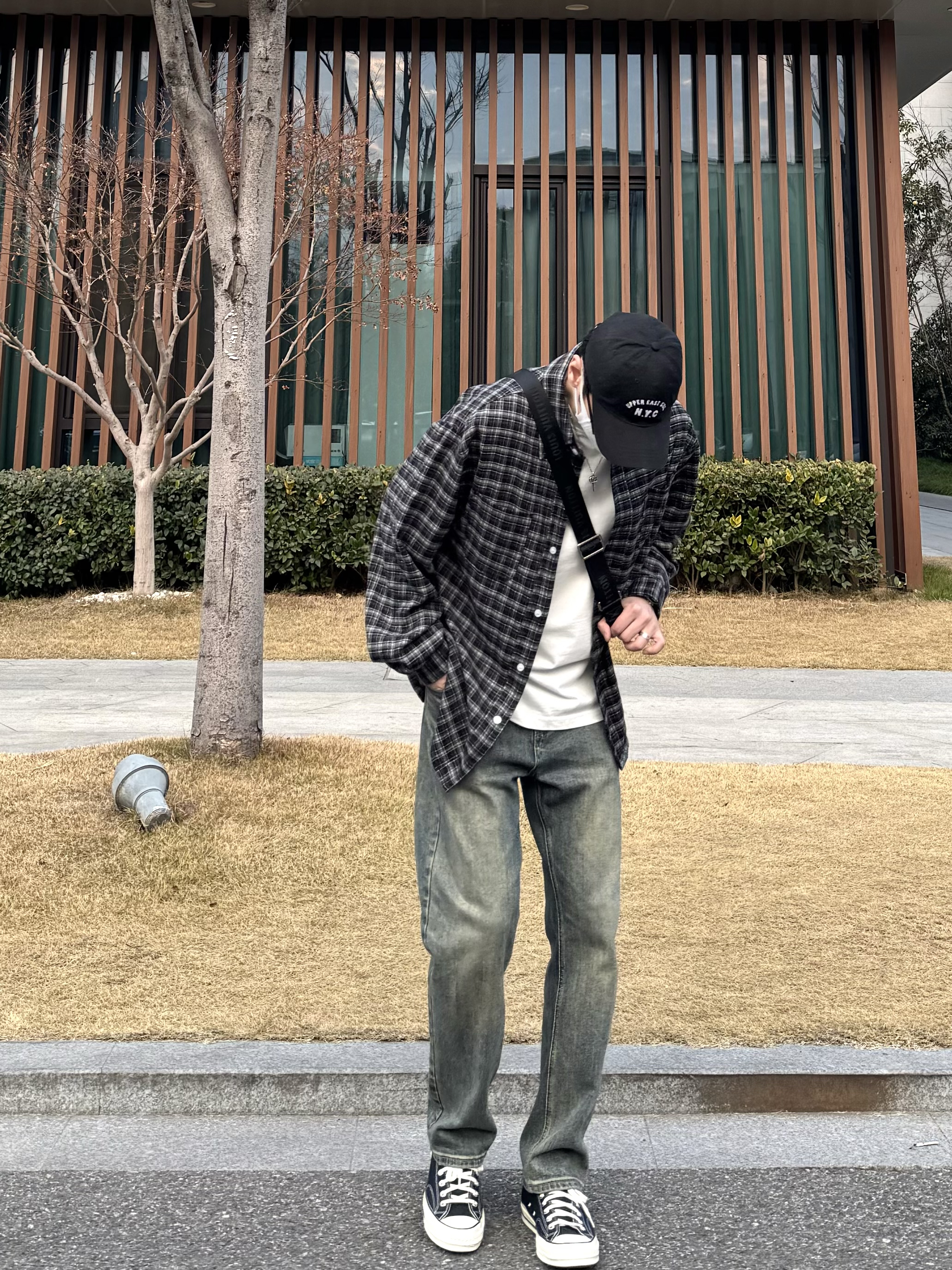 今天这套上衣穿了一件少年感十足的黑色宽松廓形磨毛格子衬衫 ⬇️ 裤子选择简约大方的蓝色直筒水洗牛仔裤 ⬇️ 鞋子上脚经典百搭的匡威1970s黑白 ⬇️ 最后背一个精致的皮质斜挎包 - 今日搭配 衣服裤子:NICE LILI 鞋子:匡威1970s黑白