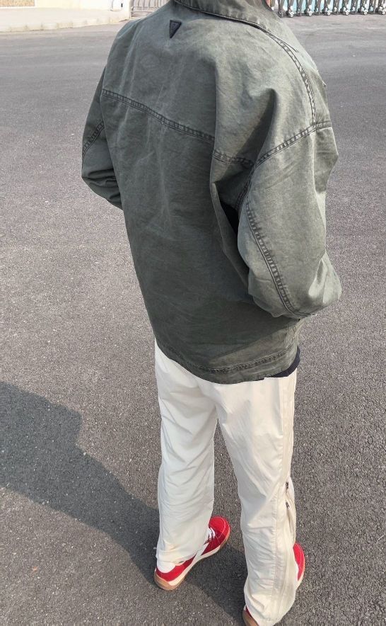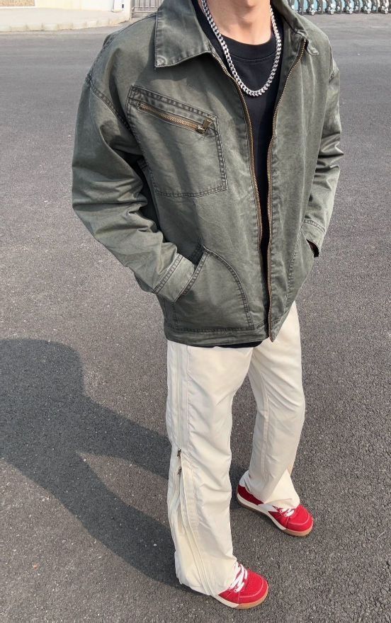 宝子!这套穿搭闭眼入!军绿色工装夹克,做旧设计个性拉满,金属拉链超有质感。搭配简约黑T,米白色拉链长裤,随性中透着精致。再加一双红鞋点睛,出街秒变焦点,谁穿谁帅,潮流氛围狠狠拿捏!