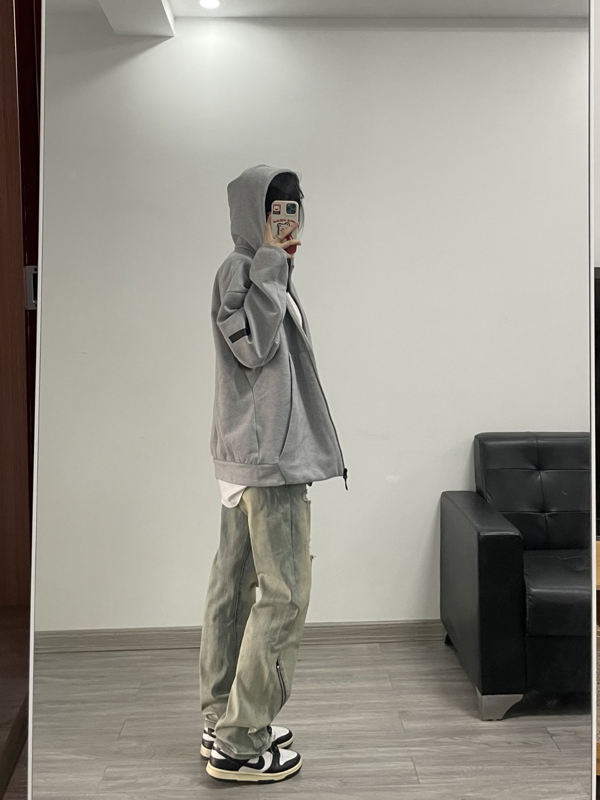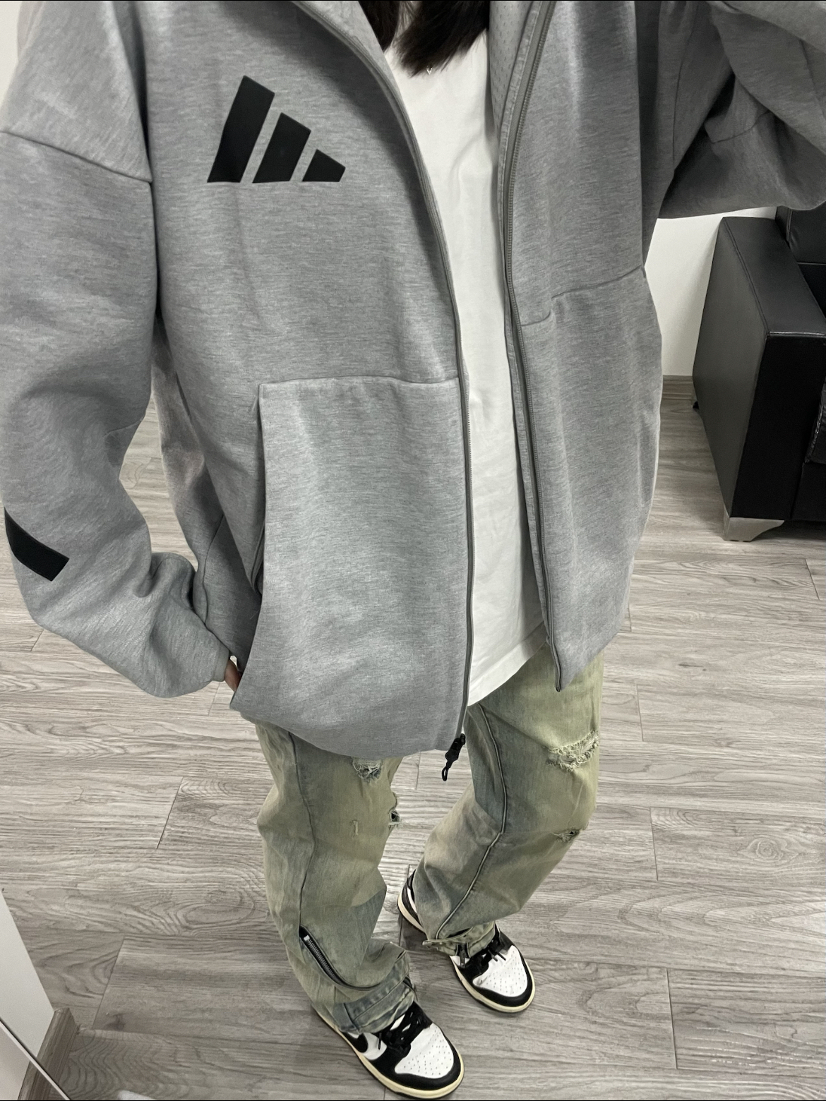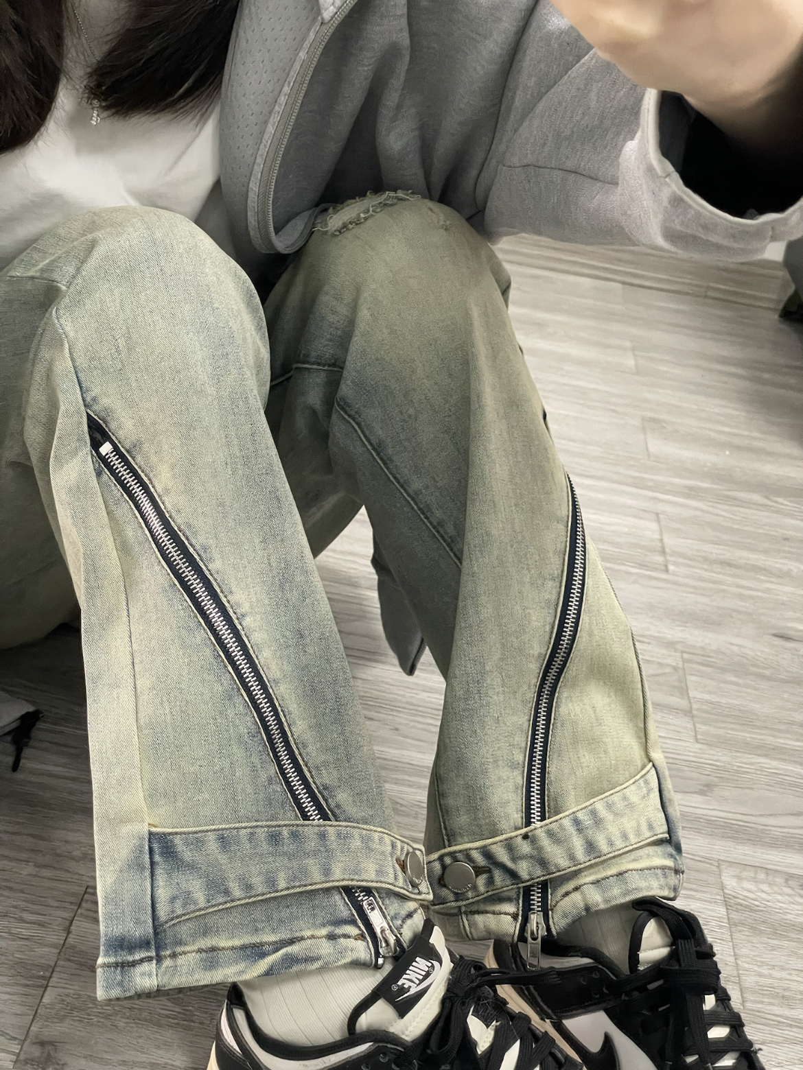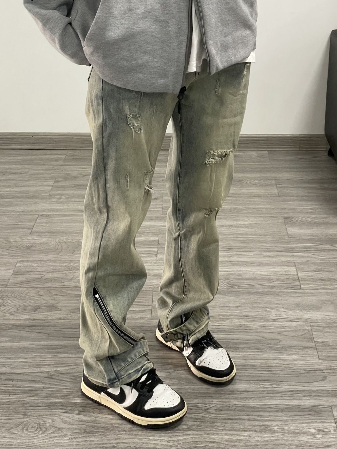 今天上身一件灰色连帽卫衣外套 内搭白色T恤 简单又休闲 搭配了一条美式复古的黄泥色牛仔裤 裤腿还做了特别的拉链分割设计 颜色很正 直筒的版型显瘦穿着也很舒服 随意搭配短袖或者外套都很好看!!!