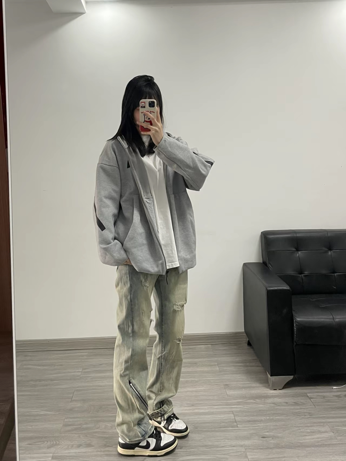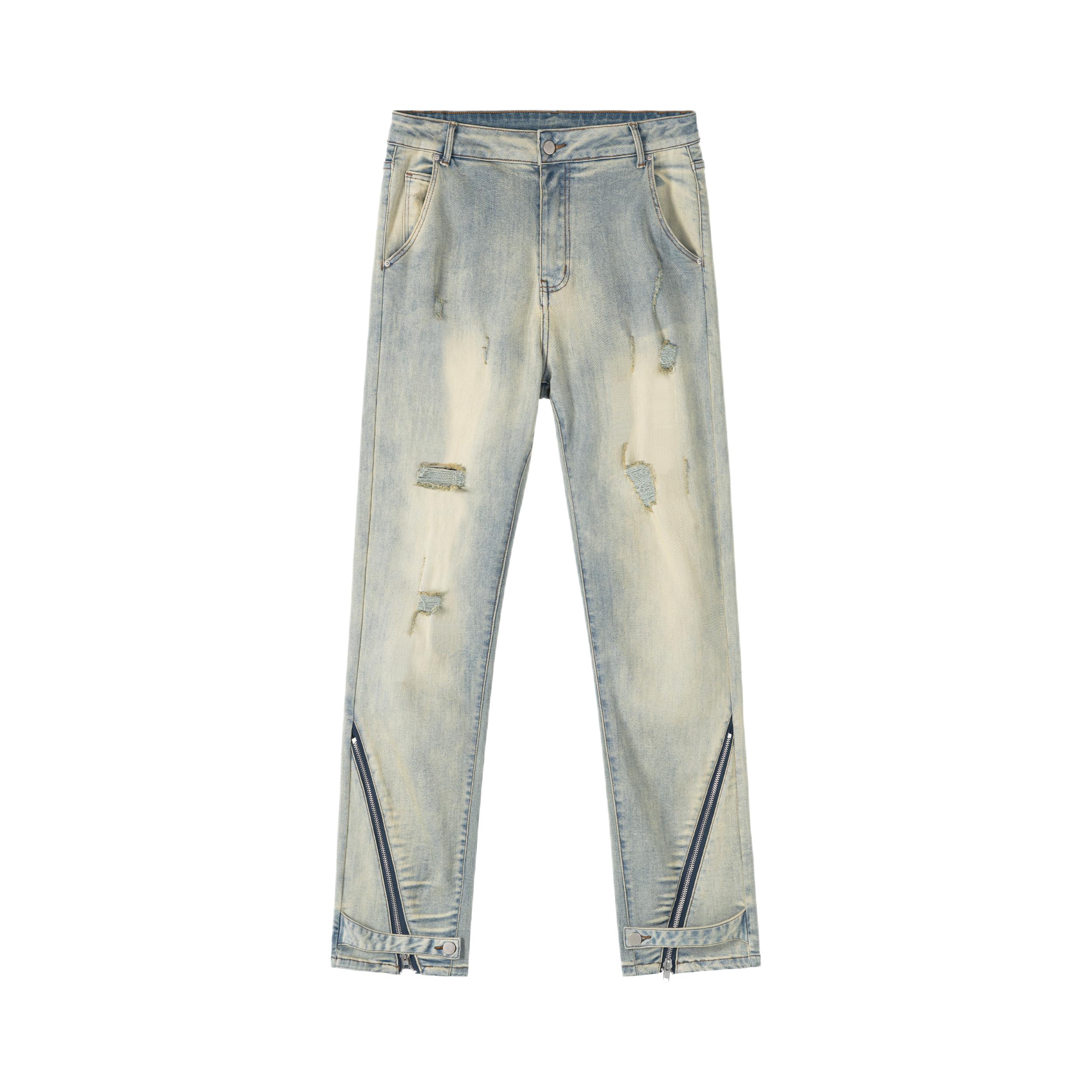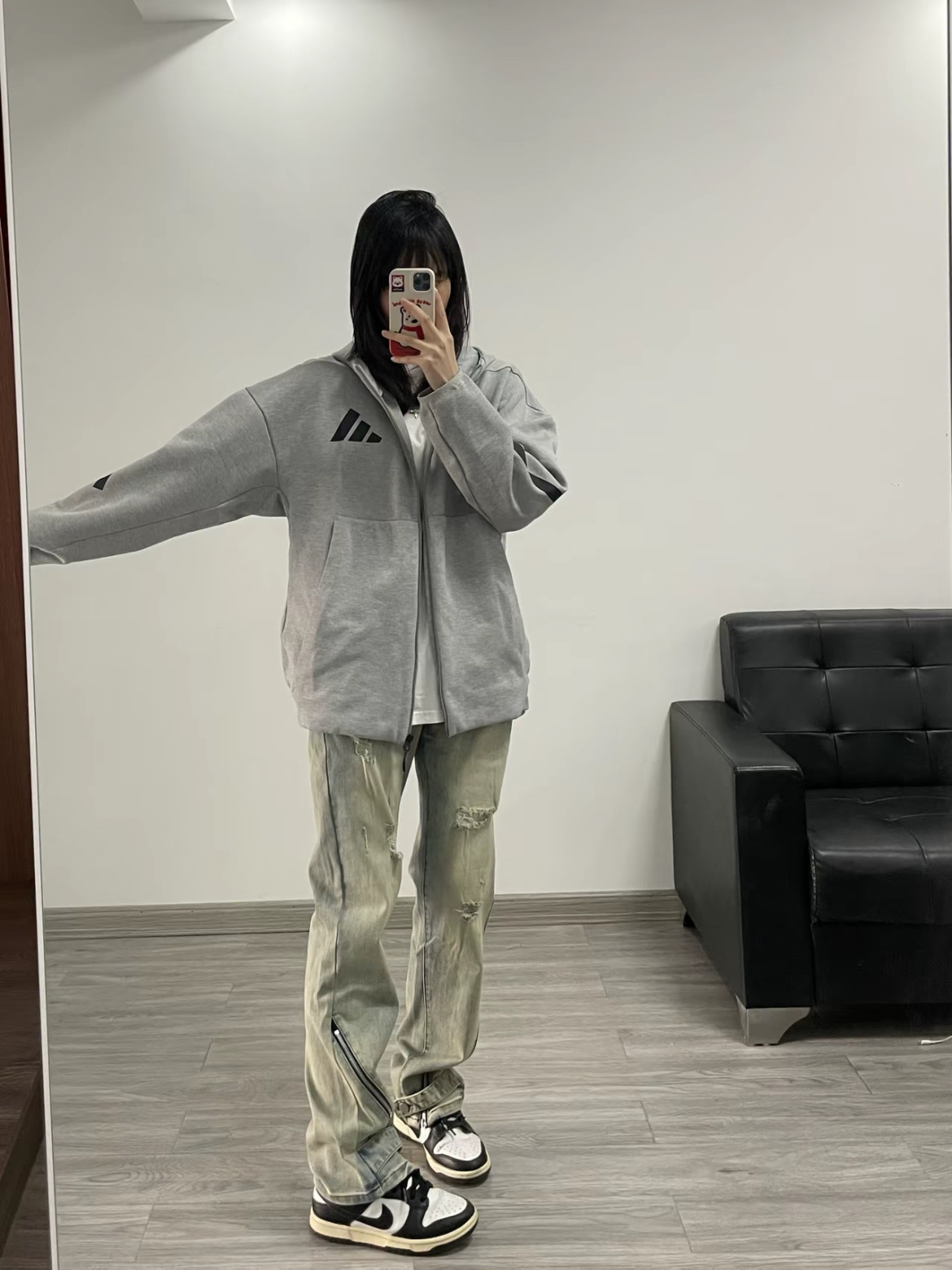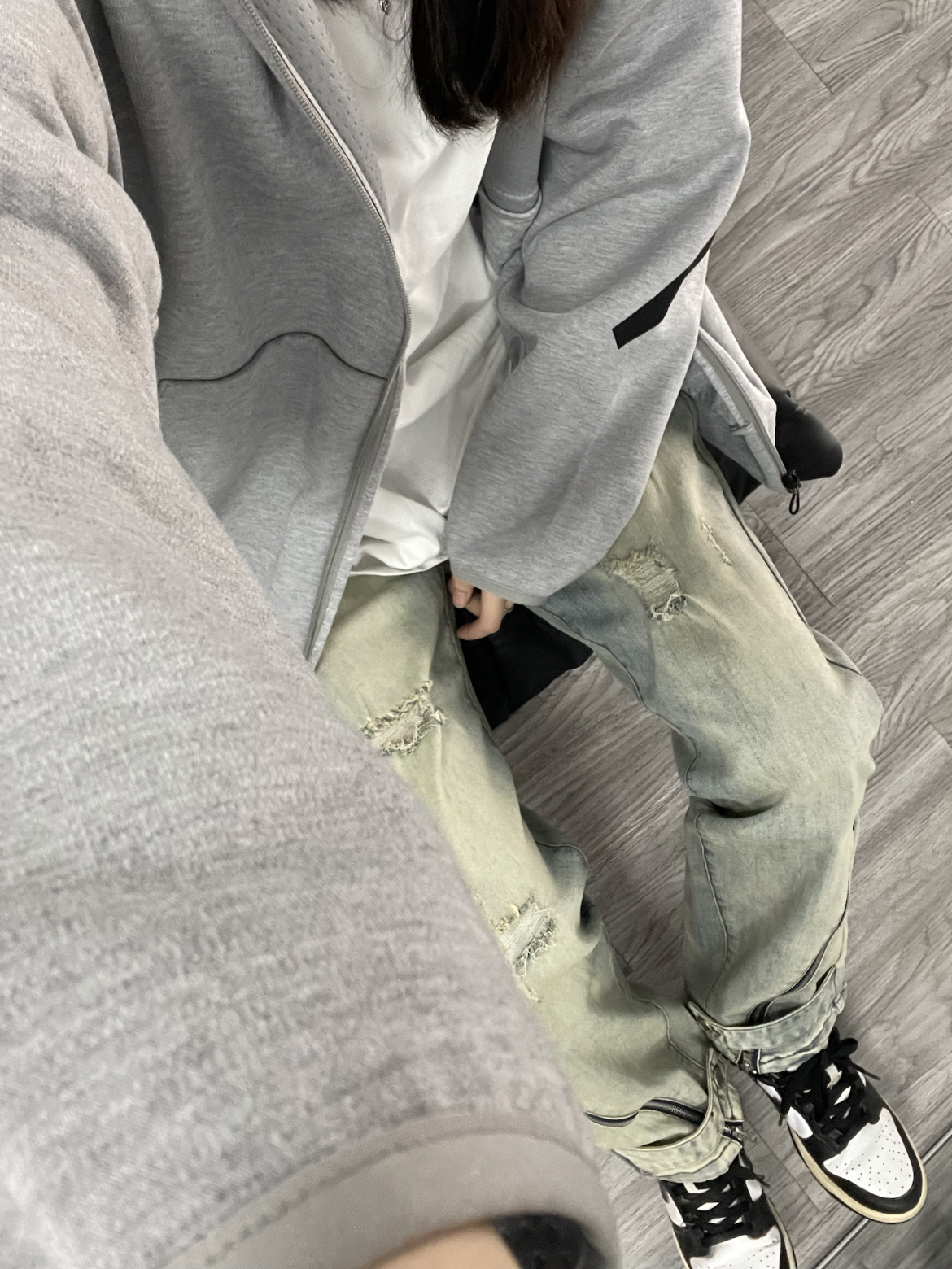 今天上身一件灰色连帽卫衣外套 内搭白色T恤 简单又休闲 搭配了一条美式复古的黄泥色牛仔裤 裤腿还做了特别的拉链分割设计 颜色很正 直筒的版型显瘦穿着也很舒服 随意搭配短袖或者外套都很好看!!!