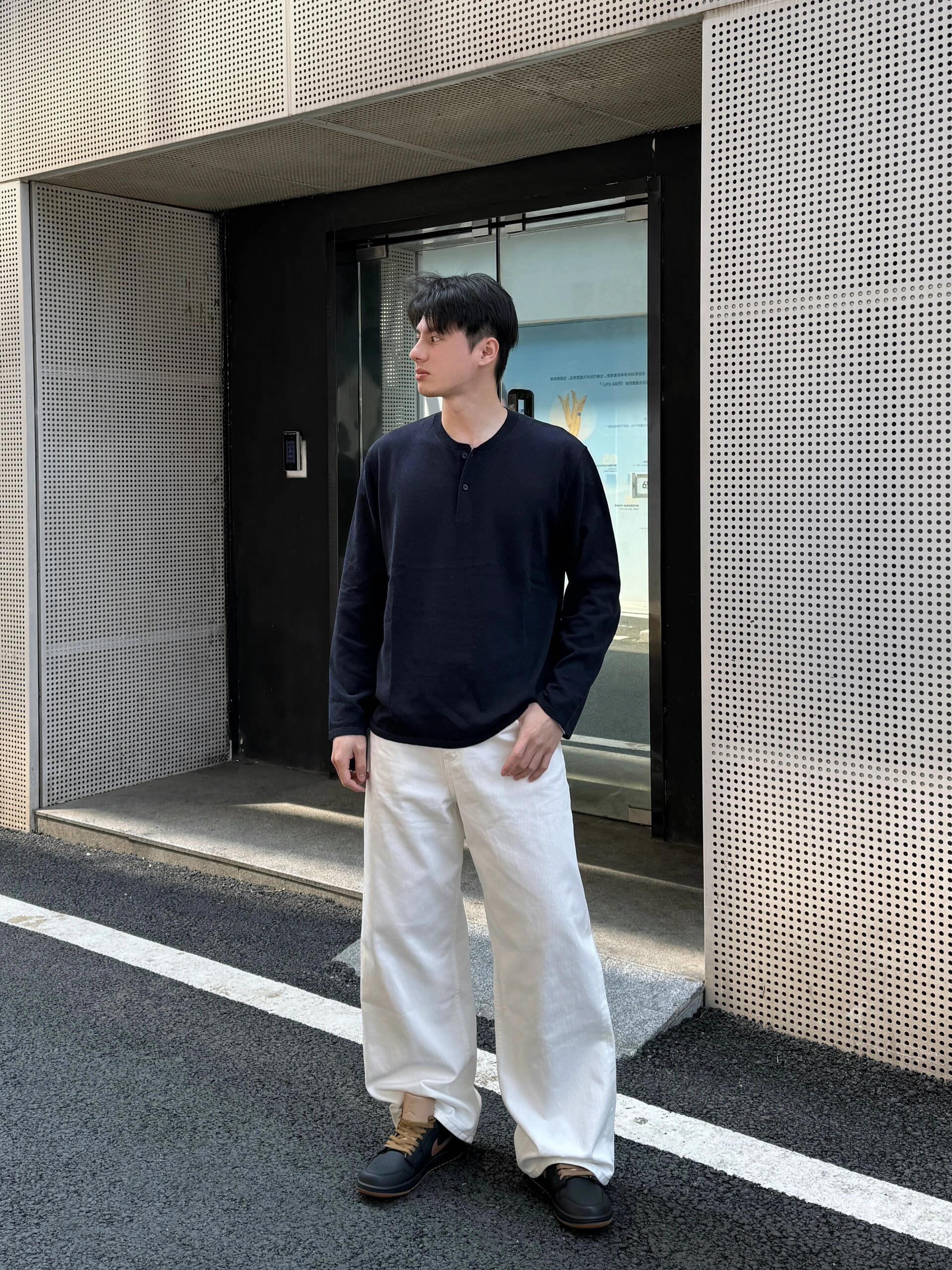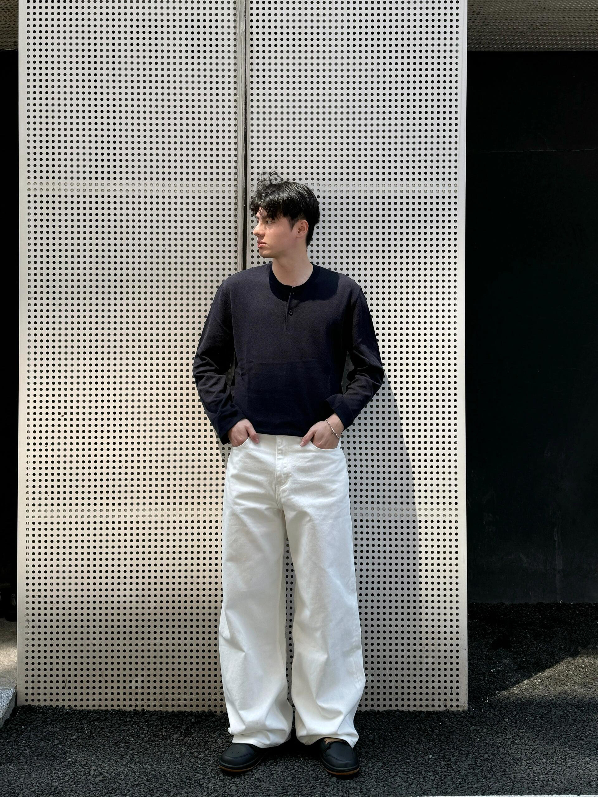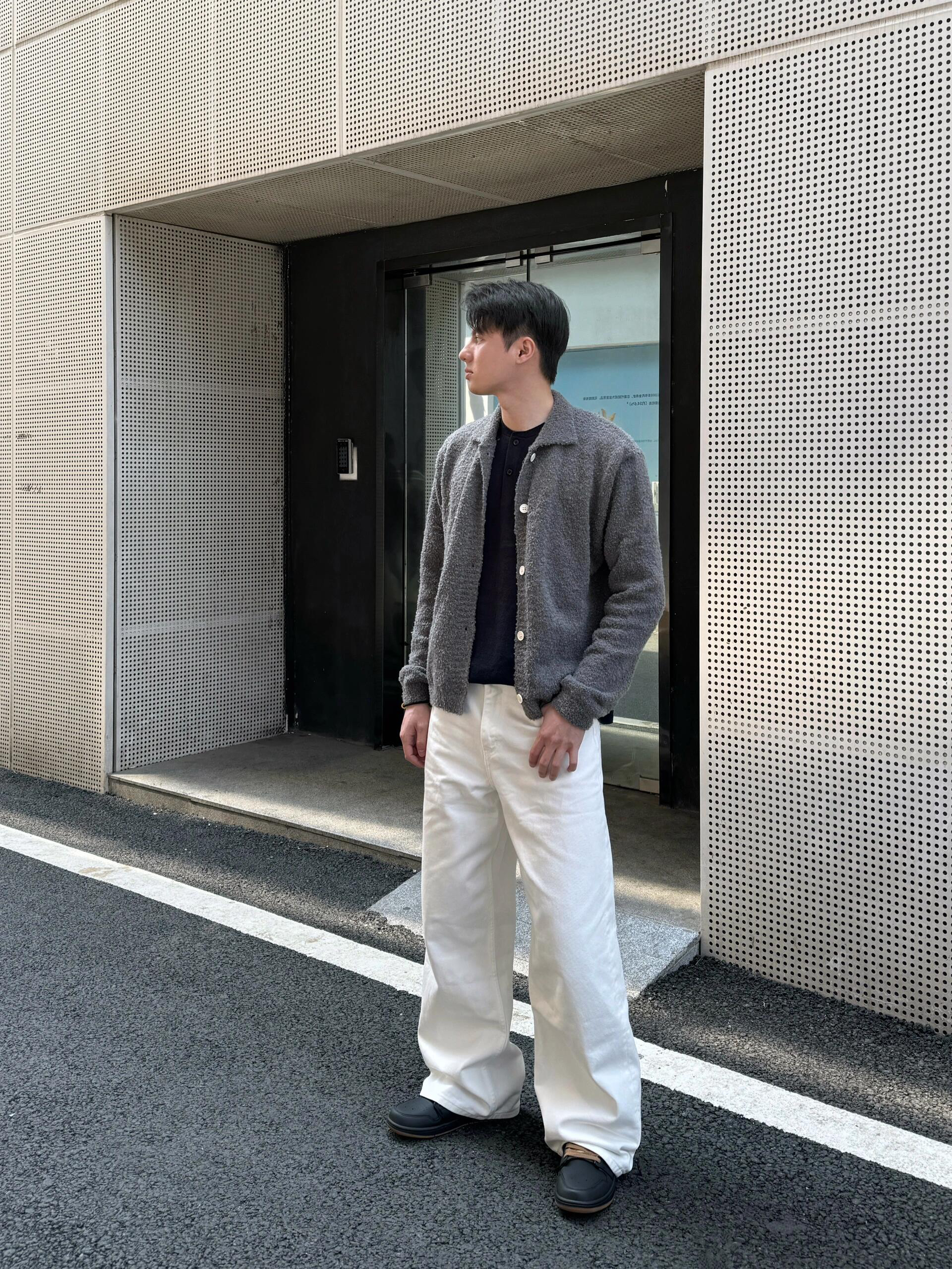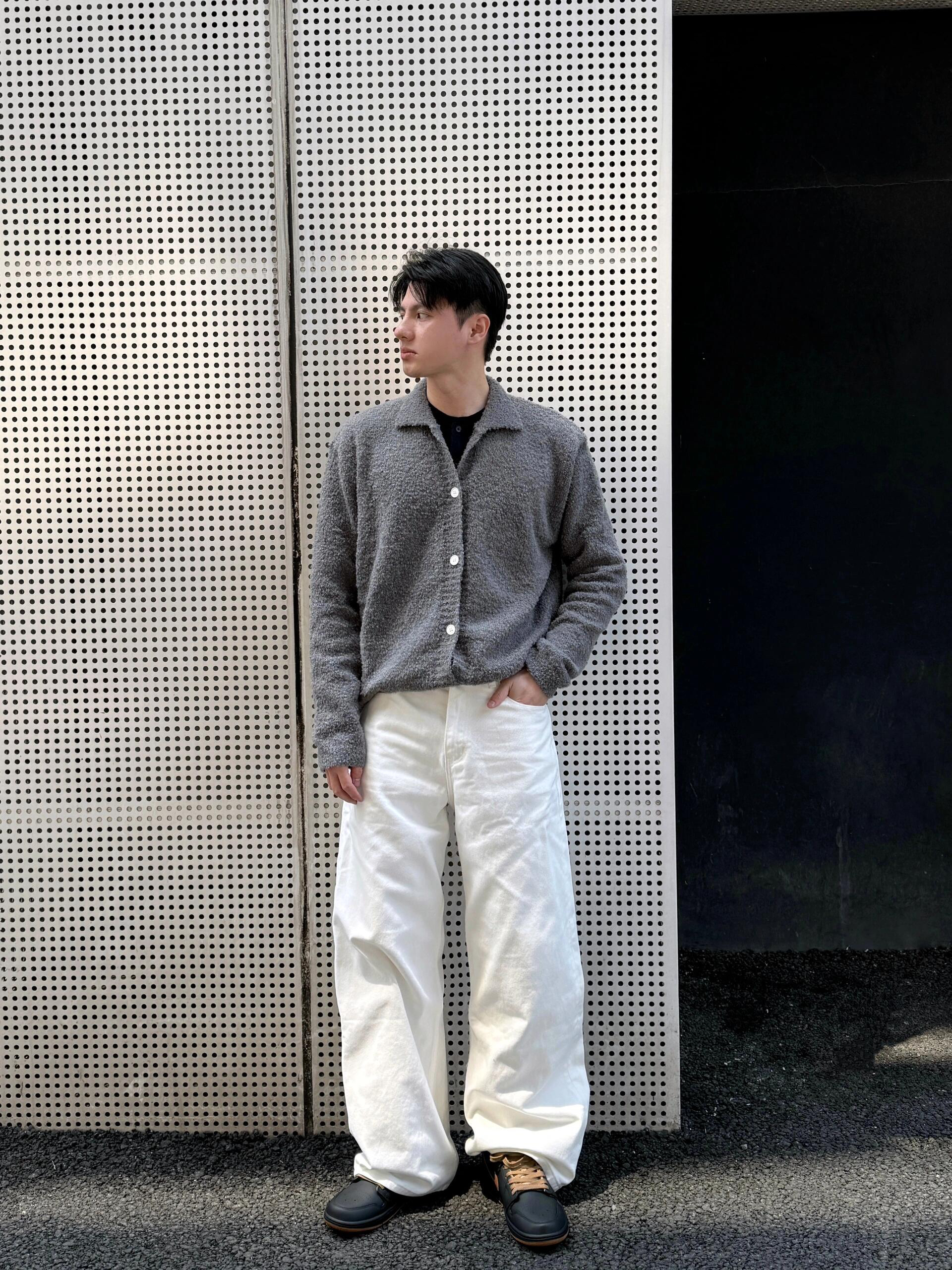 毛衣搭配依旧是春季通勤穿搭天花板 今日上身格雷系灰色毛衣开衫就很有氛围 软糯毛衣上身舒适感跟颜值都非常高 暖和也很耐看 内搭亨利领长袖也是帅气住了 单穿叠穿都可以 白色牛仔裤也是春夏必备的搭配利器 baggy版型宽松不挑人 随便穿出穿搭松弛感 为夏天准备的通勤鞋子也安排上 穿不了德比鞋穿这对黑色板鞋也是相当不错 有设计感并且很好搭就对了