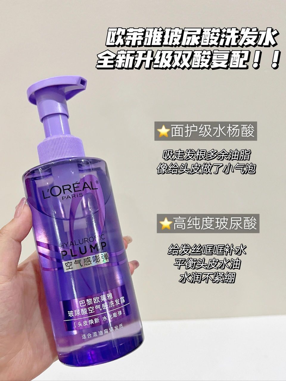 要我说2025的紫微星⭐是欧莱雅新升级紫瓶的紫吧 🙇🏻♀️洗发界“紫”妃回宫了 对咱细扁塌星人可太友好了! - 要不说欧莱雅你是会🆙升级的 ✨增加了面护级水杨酸 直接把头皮小小油脂拿下! ✨加上高纯度玻尿酸深入发丝 头皮水润不紧绷 去油不去水算是被它玩转了 - 先来说说我怎么选择洗发水吧 ✔️首先先看它的玻尿酸浓度! 欧莱雅这款可谓是玻尿酸洗发水届的老祖宗!! 99%高纯度玻尿酸这哪根发丝不被填...