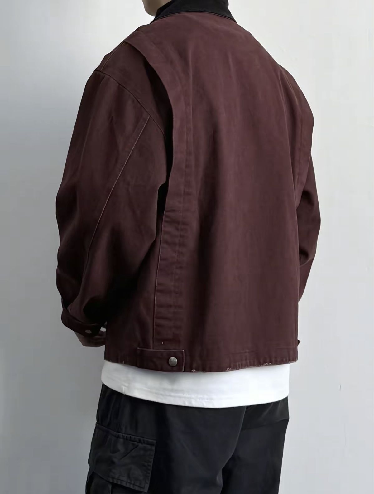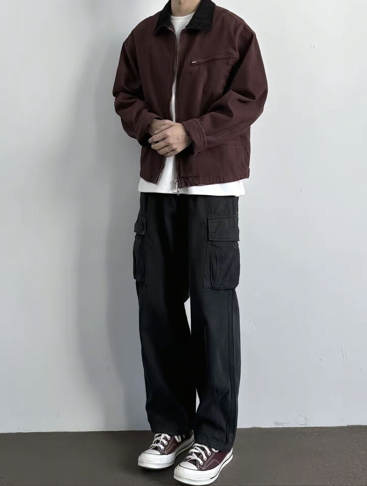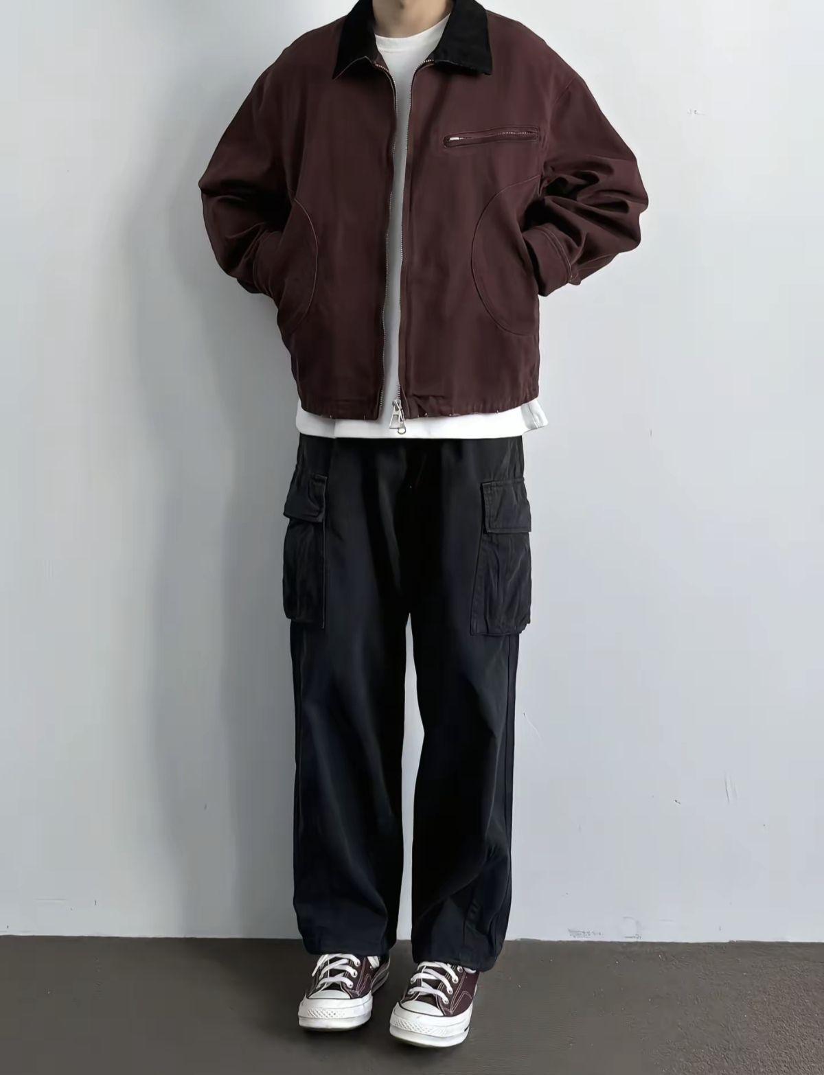 酒红色夹克真的太绝啦!🤎翻领设计+利落剪裁,复古又不失潮流感,随便搭件白T就超有层次~下装配黑色工装裤,宽松版型藏肉又随性,裤侧口袋设计秒添街头氛围!最后踩一双同色系匡威,整体色调统一又有细节,日常出街、逛街约会都超合适~