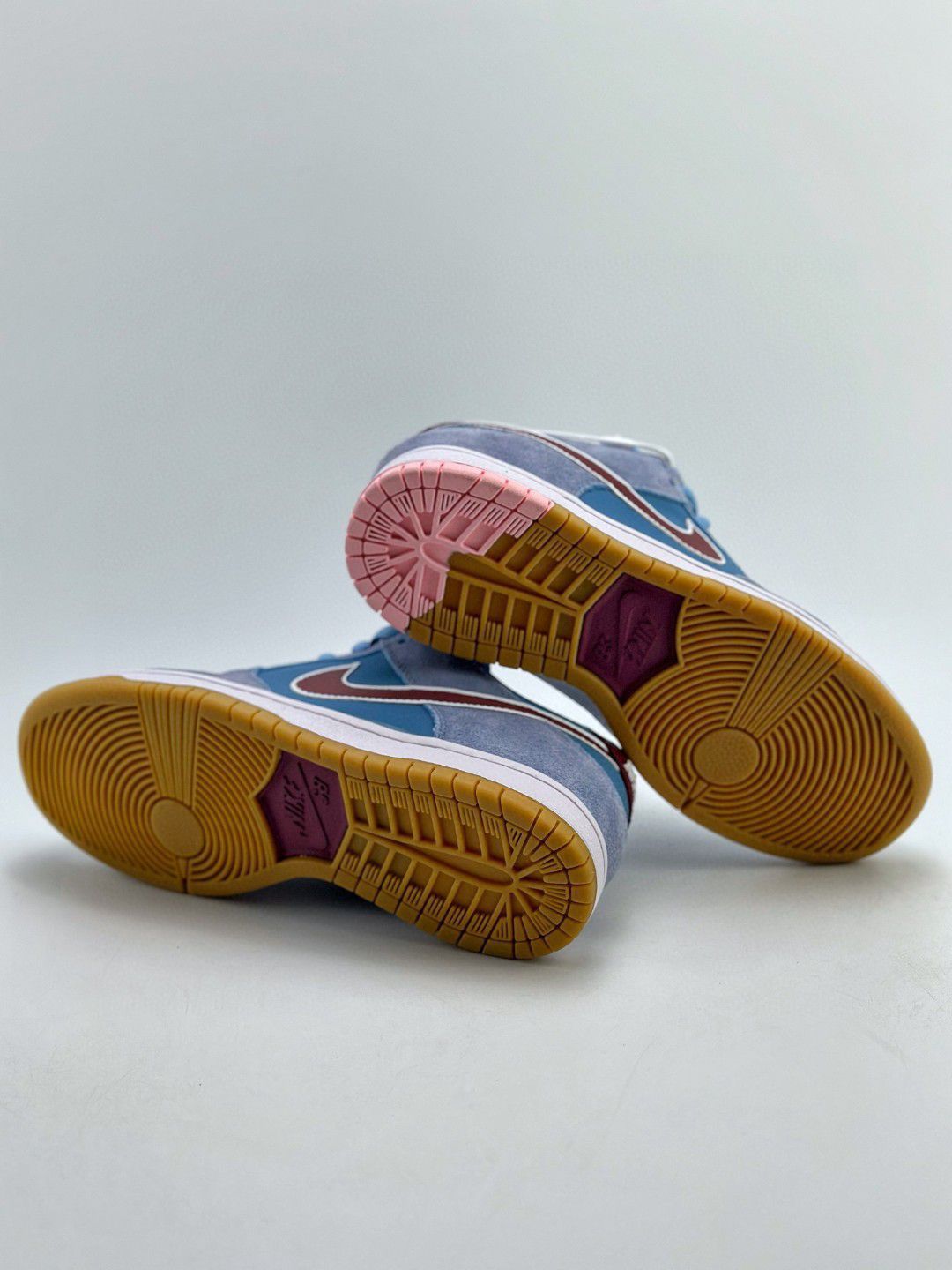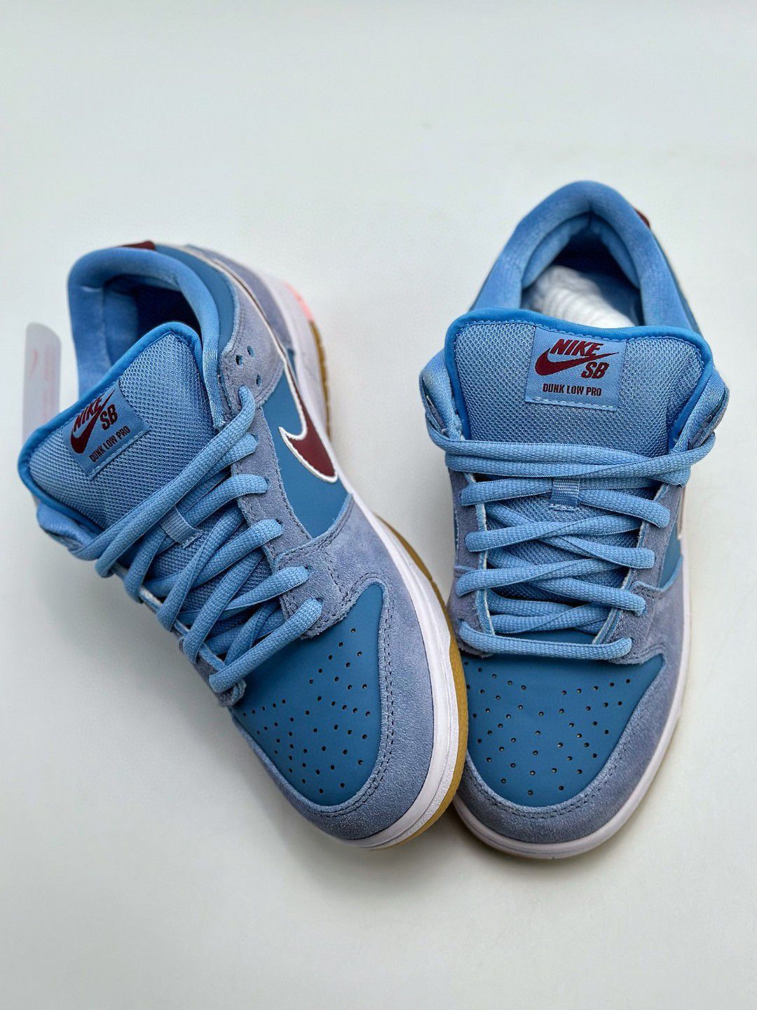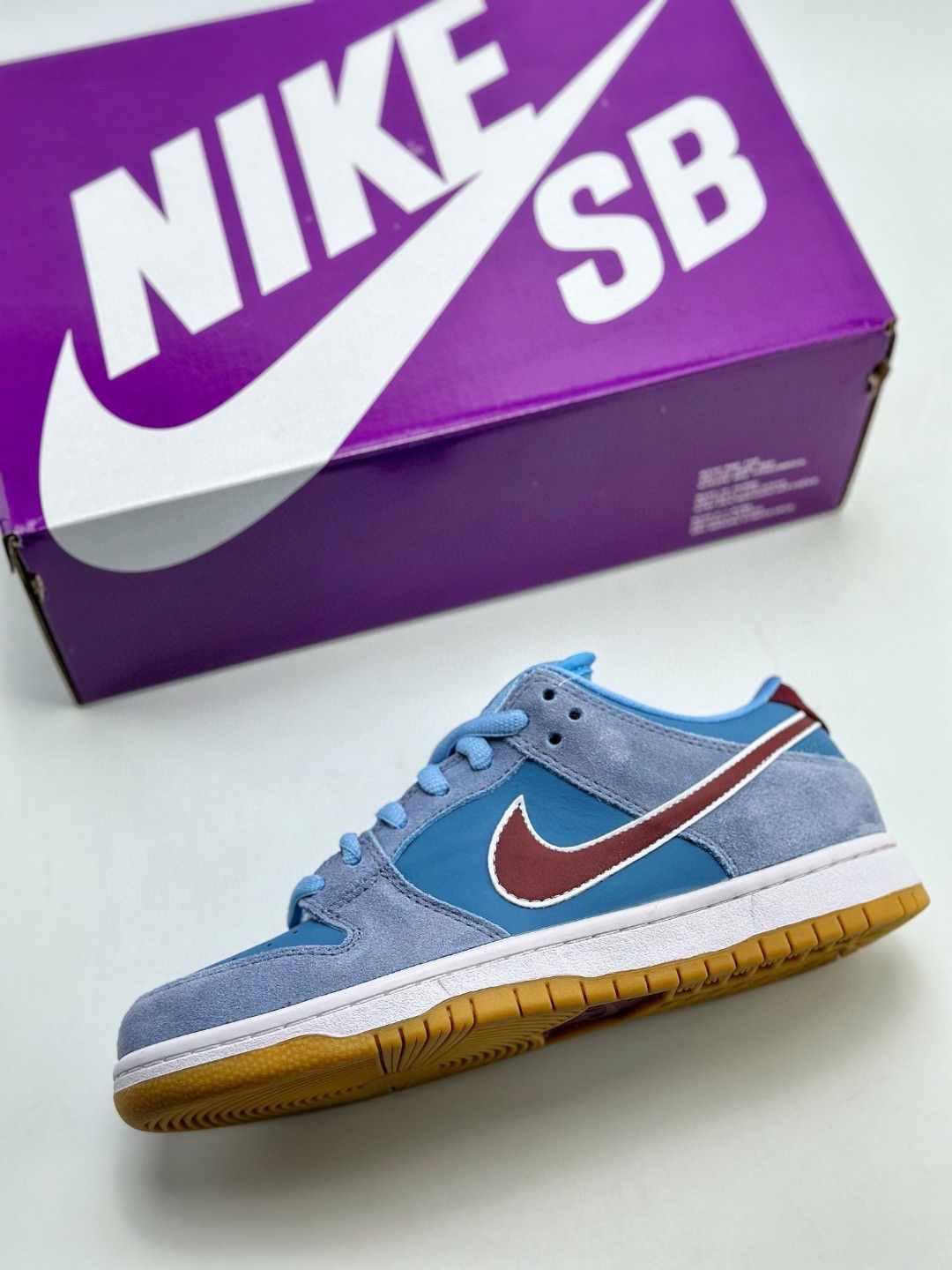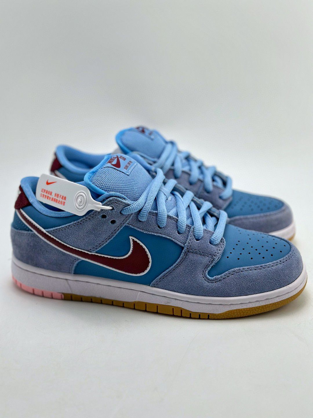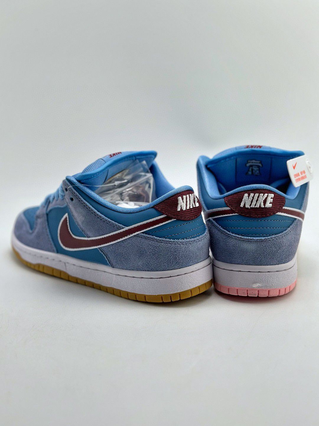 NIKE SB Dunk Low PRM 蓝色 费城人 泡泡糖 极力推荐👏 🌼这双鞋 鞋舌加厚处理,脚踝两侧鞋子的内里有海绵 填充,鞋垫外置Z00mAir气垫的设置,可以 说舒适性没有问题! 🌸鞋身材质为翻毛麂皮混合鞋面的牛巴层革。 鞋身 侧方的Nikeswoosh则是PU革材质! 质感非常好💞