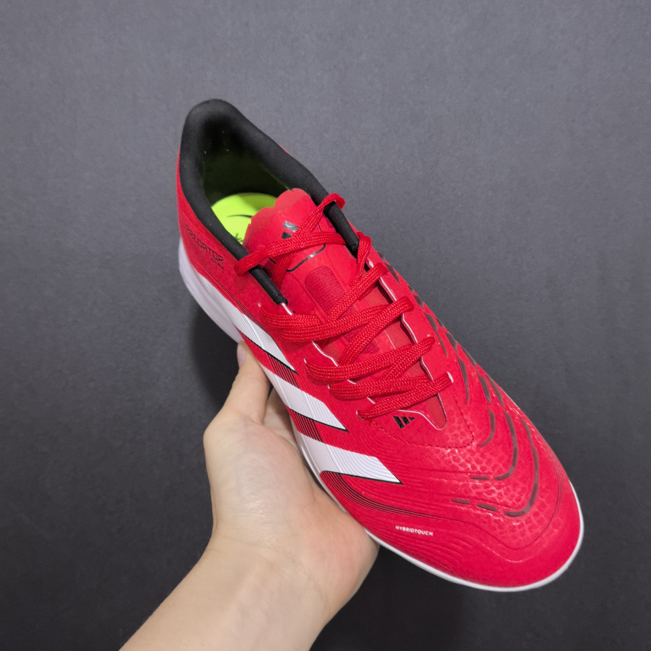 一.外观设计 1.新年红配色:2025年推出的新年红配色,鞋身火红,搭配白色三道杠条纹与后跟设计,既突出品牌属性,又契合中国新年红红火火的美好寓意,在球场上十分吸睛。 2.经典猎鹰元素:鞋领侧边有Predator和EST.1994标注,致敬猎鹰诞生年份,彰显品牌历史与文化内涵。 二.性能表现 1.鞋面科技:采用Hybridtouch2.0鞋面材质,轻薄柔软,触感丝滑,能为脚部提供舒适的包裹感,同时...