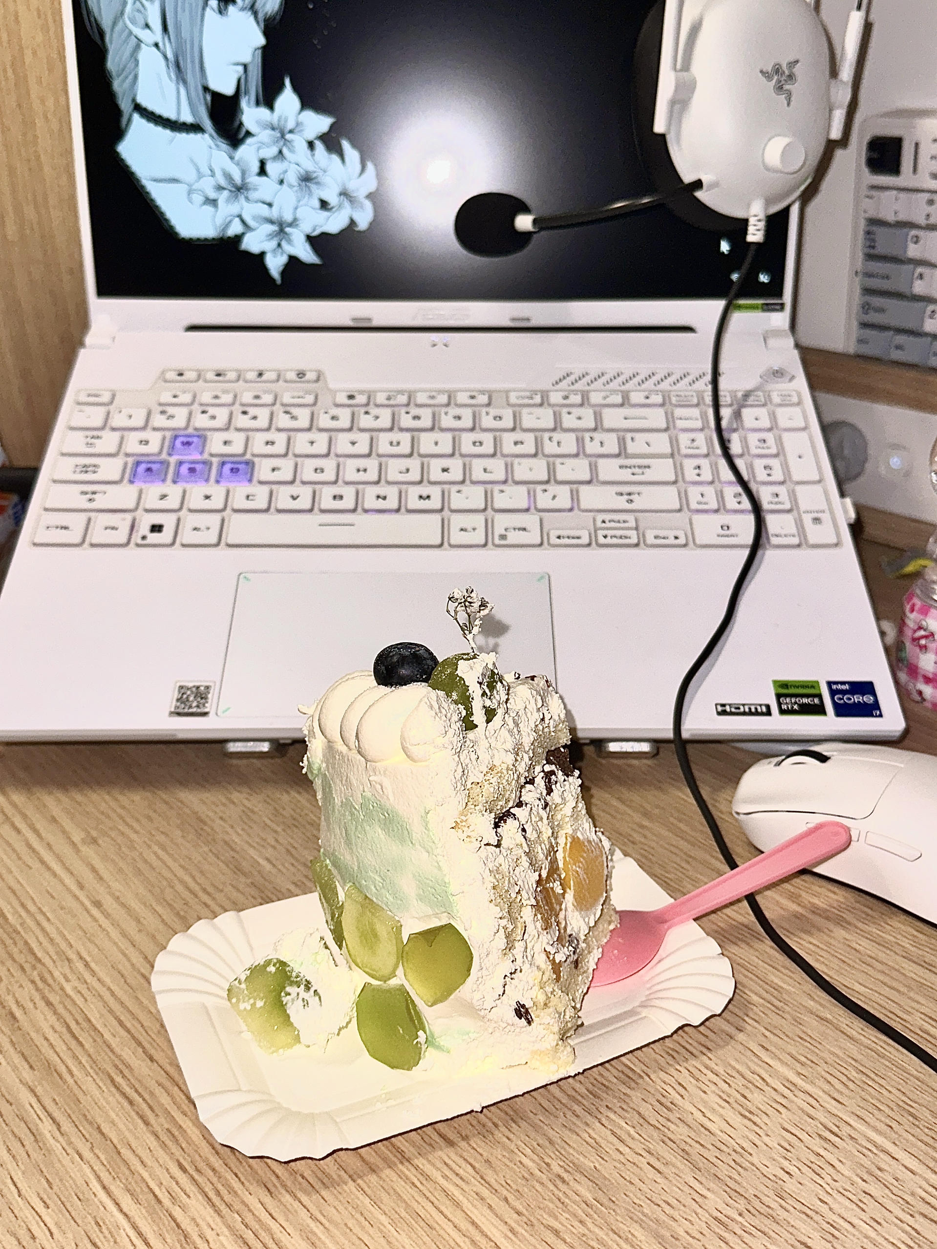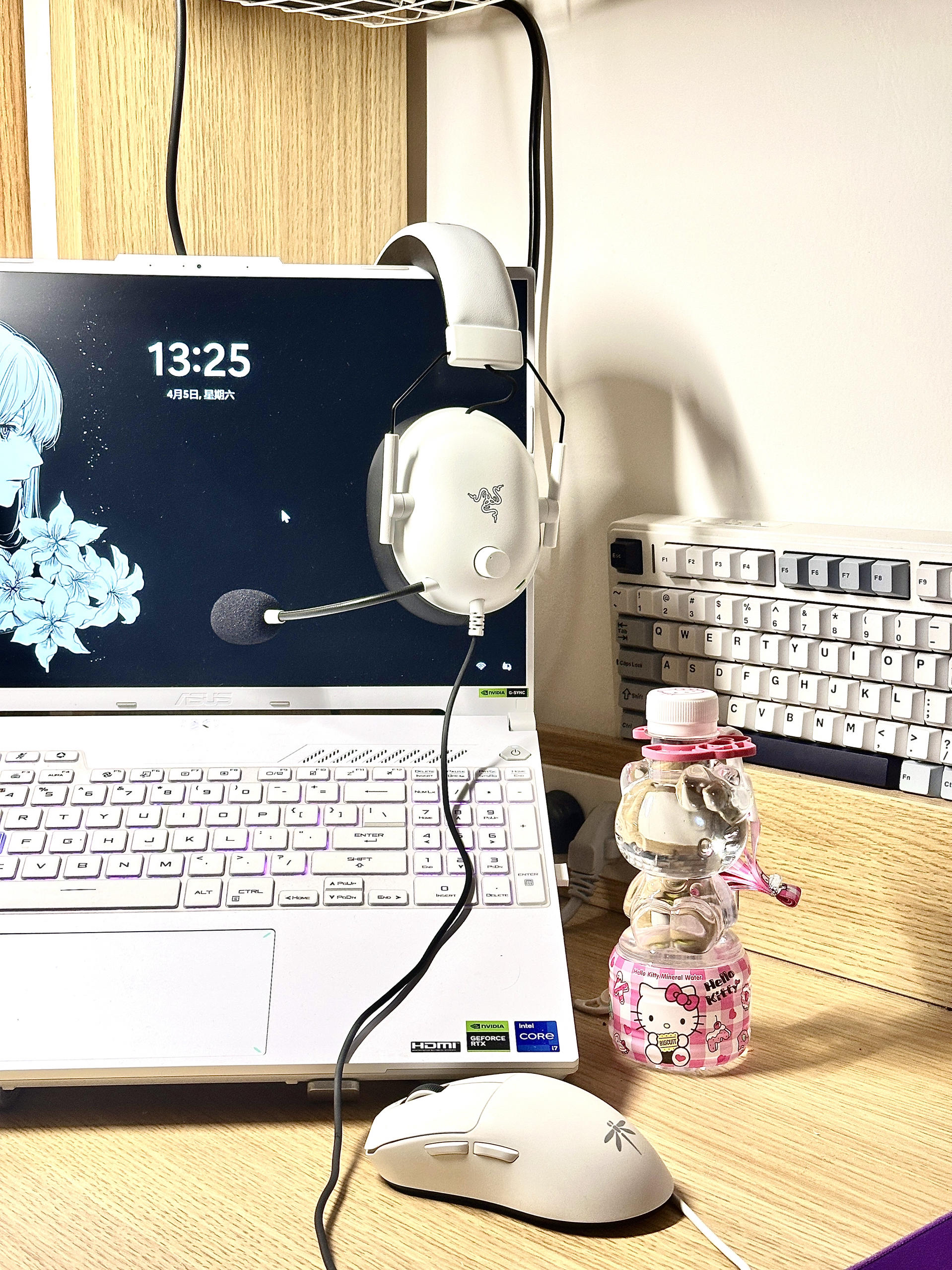 首先是白色机身的华硕天选5pro啦 流畅的白色机身高颜值轻薄游戏本真的好好看诶🫣 然后是打瓦必备的雷蛇有线耳麦,听脚步👣不在话下 黑白的配色跟电脑超级配诶 蜻蜓鼠标也超级好用 是款很轻盈的鼠标🖱️零延迟 声音也很清脆~ 最后是我的键盘啦 圆润的键真的超级可爱哦☺️