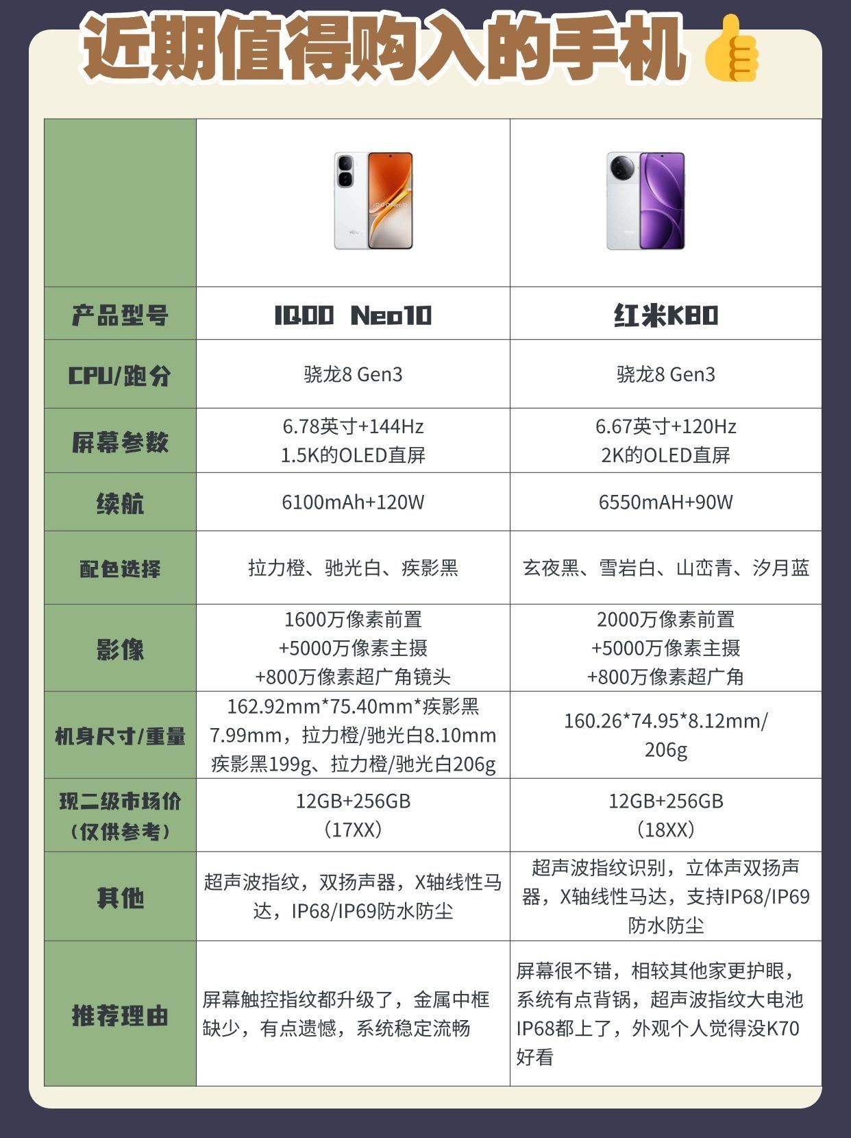 本篇笔记关联了iQOO Neo10 5G 手机 直驱供电 等效6100mAh电池 拍照 满血 旗舰芯 自研电竞芯片 闪充 超快 全网通 拉力橙、iQOO 13 5G 手机 自研电竞芯片 长续航 全网通 快充 2K Q10珠峰屏 无限稳帧 全场景疾速引擎 传奇版、Redmi/红米 K80 5G 手机 大电池 新国屏 拍照 防水 2K屏 搭载全亮度 DC 圆偏振光 超声波指纹 双旗舰 玄夜黑等商品,为用户提供真实的使用体验和购买参考。