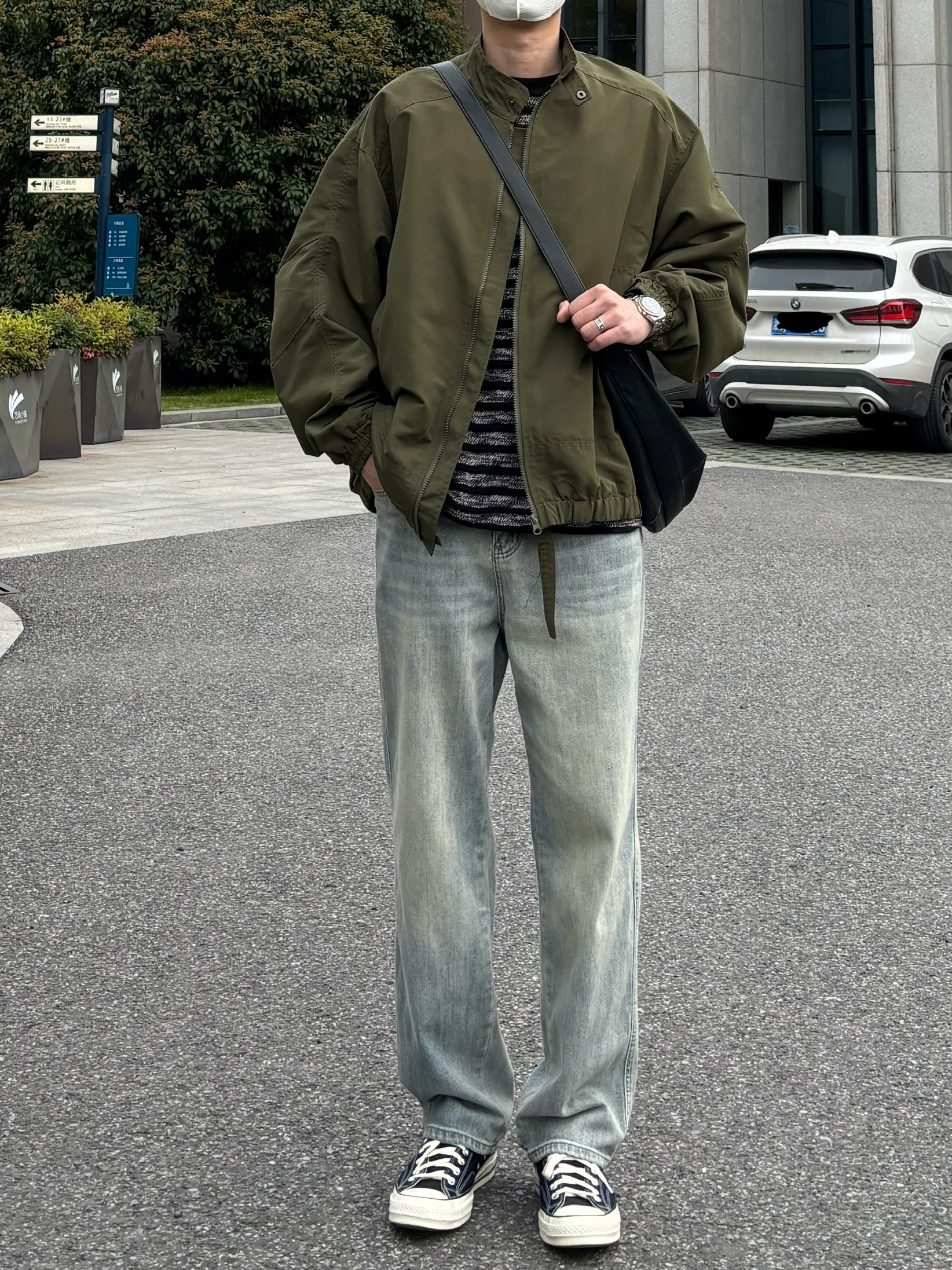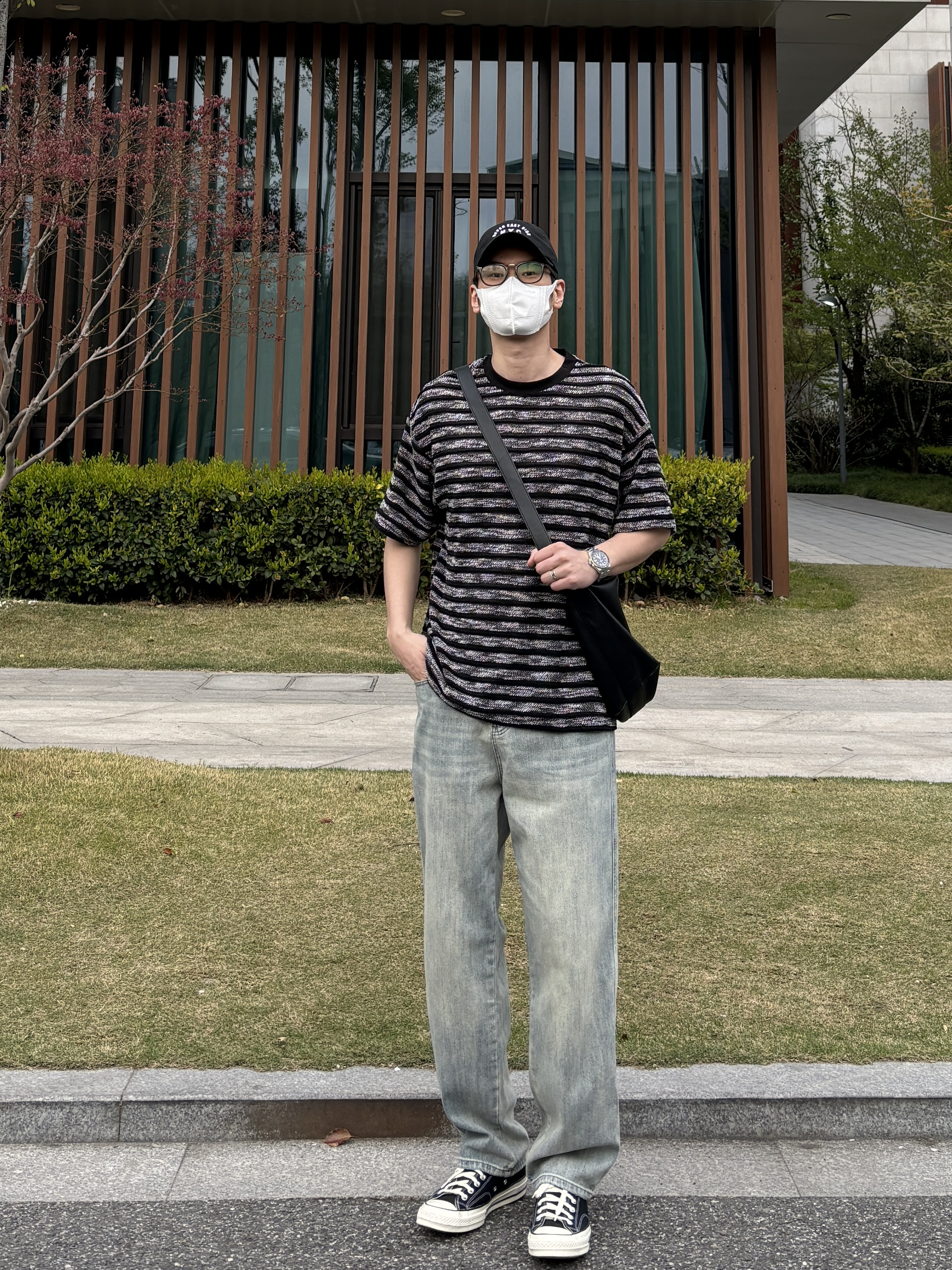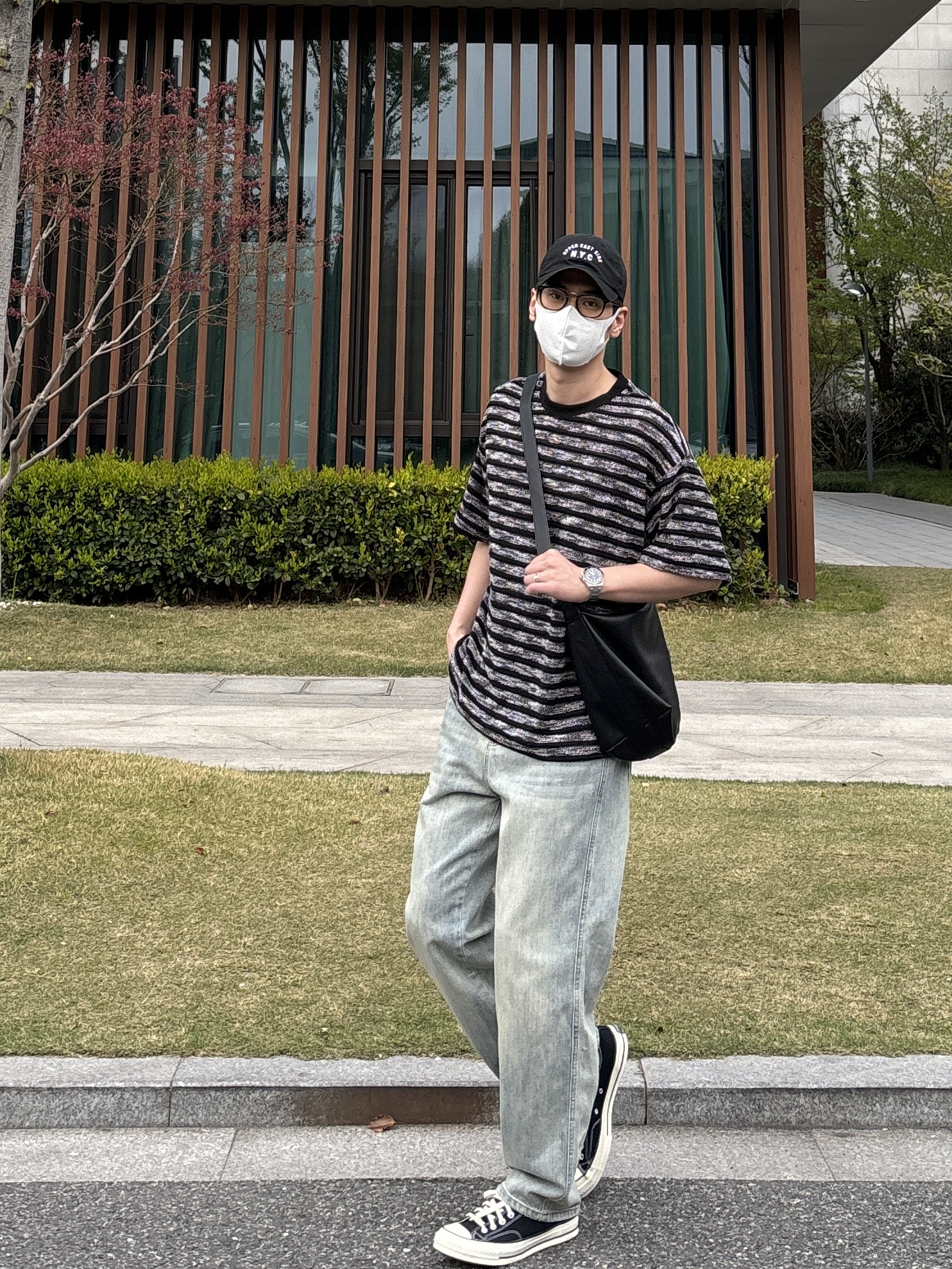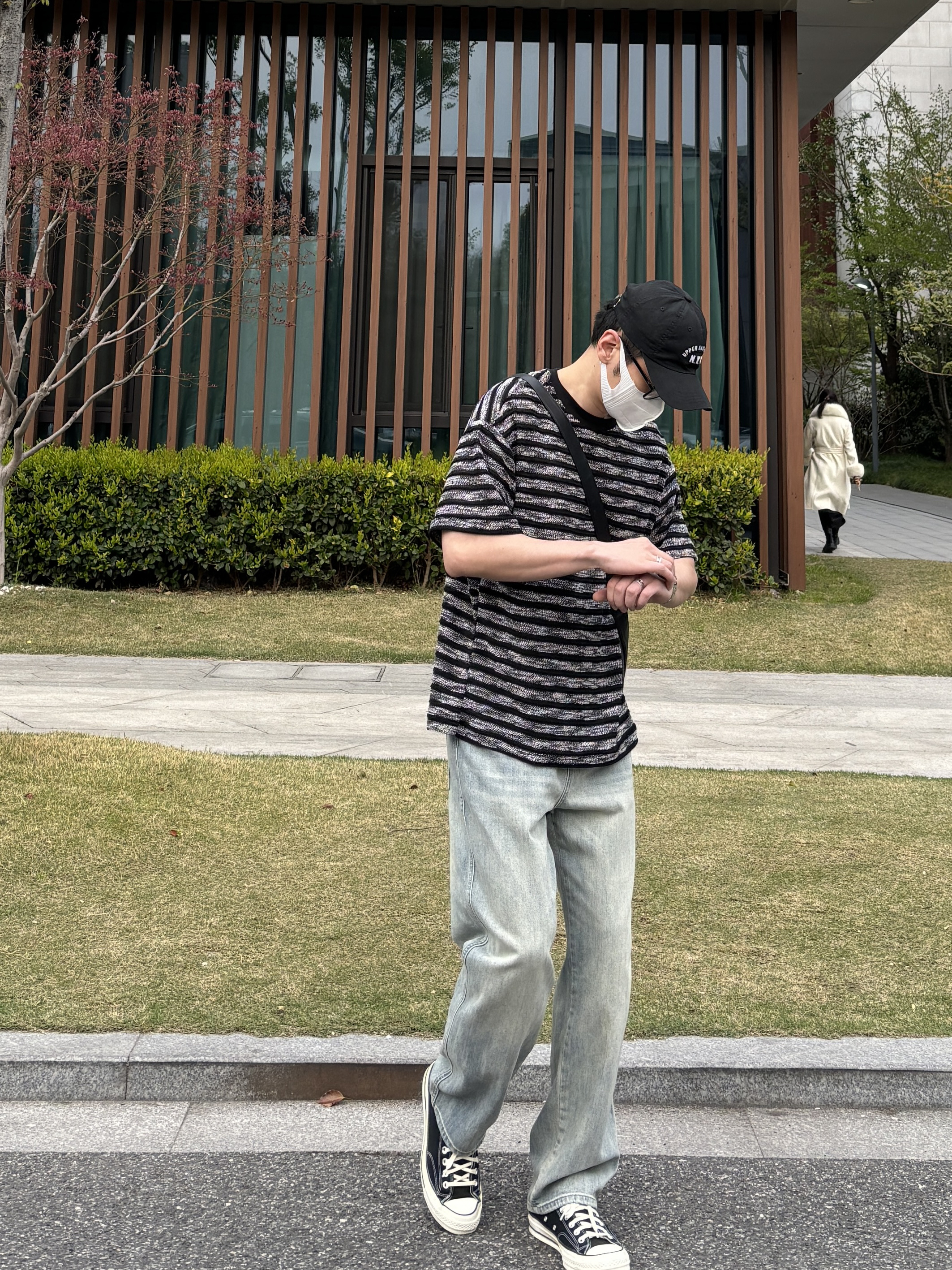 今天这套先用少年感十足的黑色编织条纹短袖做内搭 ⬇️ 裤子选择清爽干净的浅蓝色水洗直筒牛仔裤 ⬇️ 鞋子上脚简约百搭的匡威1970s黑白 ⬇️ 接着套上军绿色宽松廓形抽绳下摆立领工装夹克 ⬇️ 最后背一个大容量皮质斜挎包 - 今日搭配 衣服裤子:NICE LILI 鞋子:匡威1970s黑白