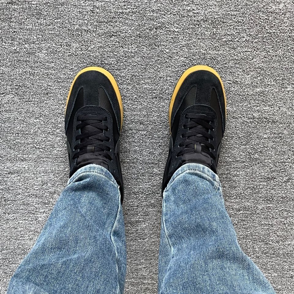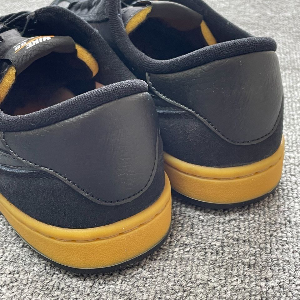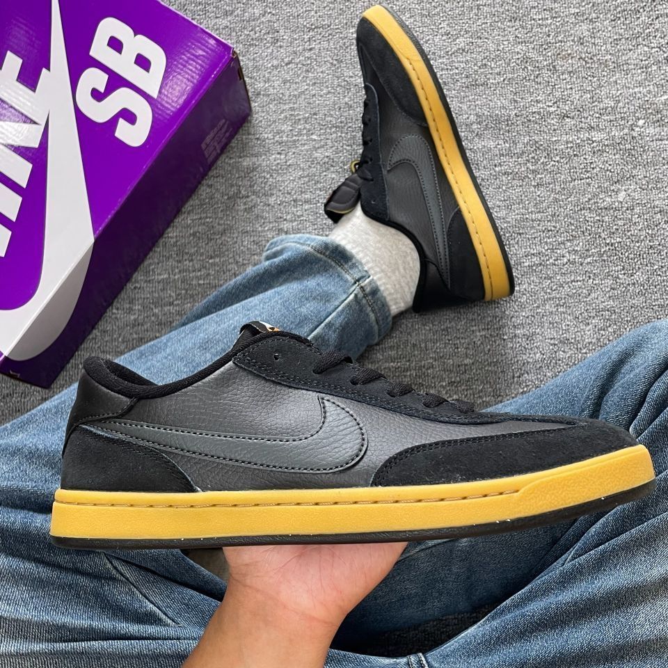 新款炫酷的黑色nike板鞋 这双有点黑武士的感觉,鞋面黑色皮革+麂皮的材 料配上黄色中底很醒目啊 橡胶薄底设计,春夏搭配的好鞋子我配的卫裤穿,也是很有休闲风的。