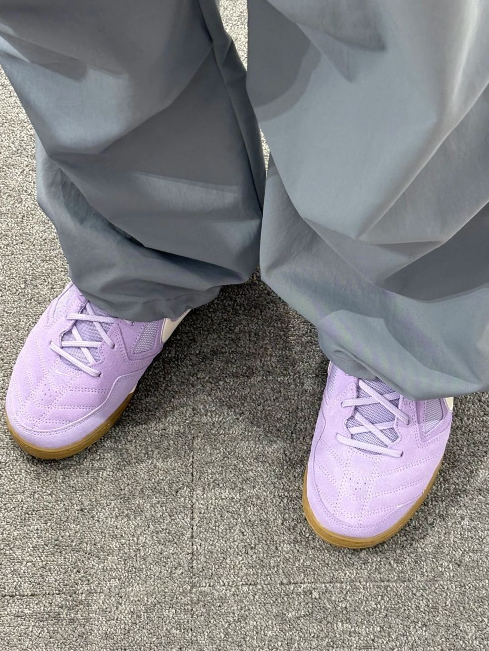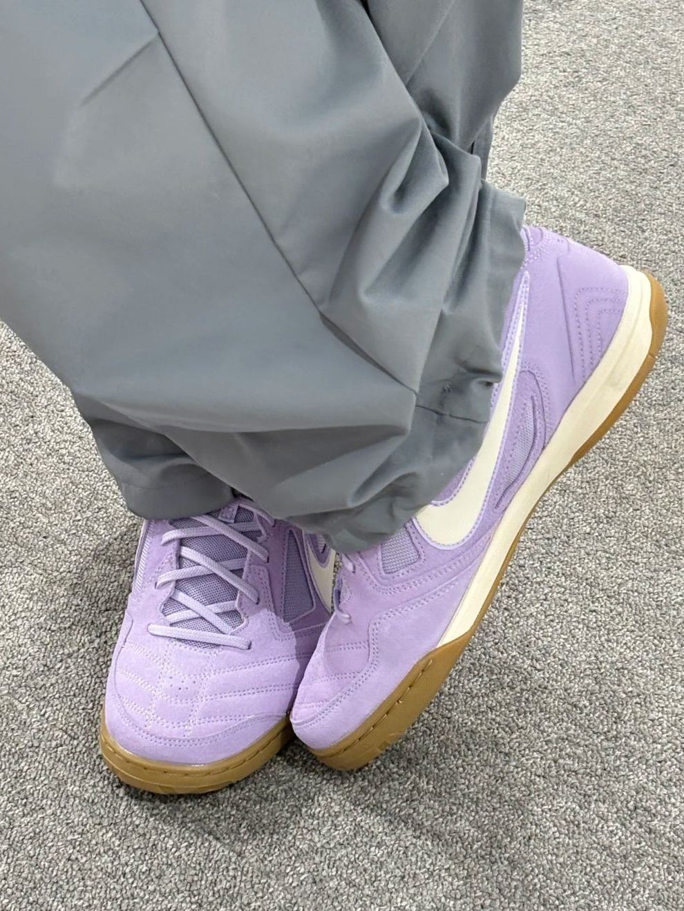 一双可以出街的复古足球鞋 功能性与潮流感兼具的Nike GATO 采用柔和的紫色鞋面搭配浅色鞋底, 形成清新明快的视觉对比, 透气材质保证了穿着舒适性。 整体造型简约时尚,没有冗余装饰。 与灰色裤子组合时, 通过低饱和度色系的协调搭配 呈现出轻松休闲的都市风格!
