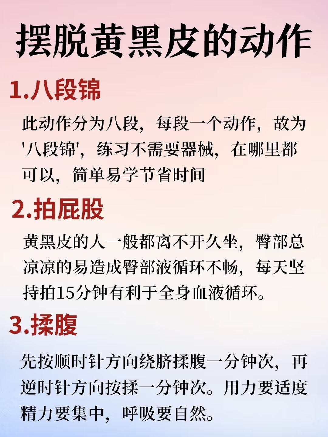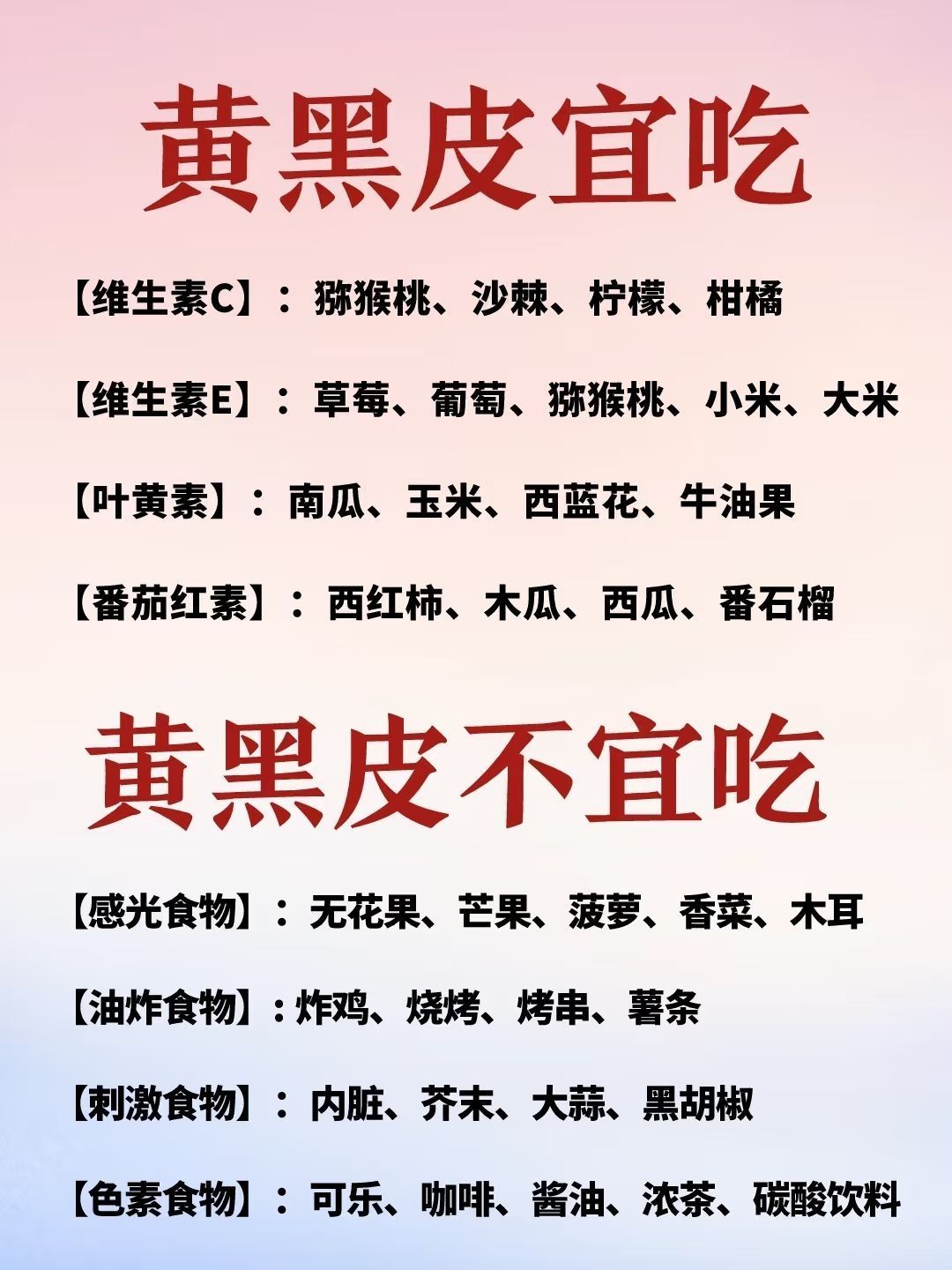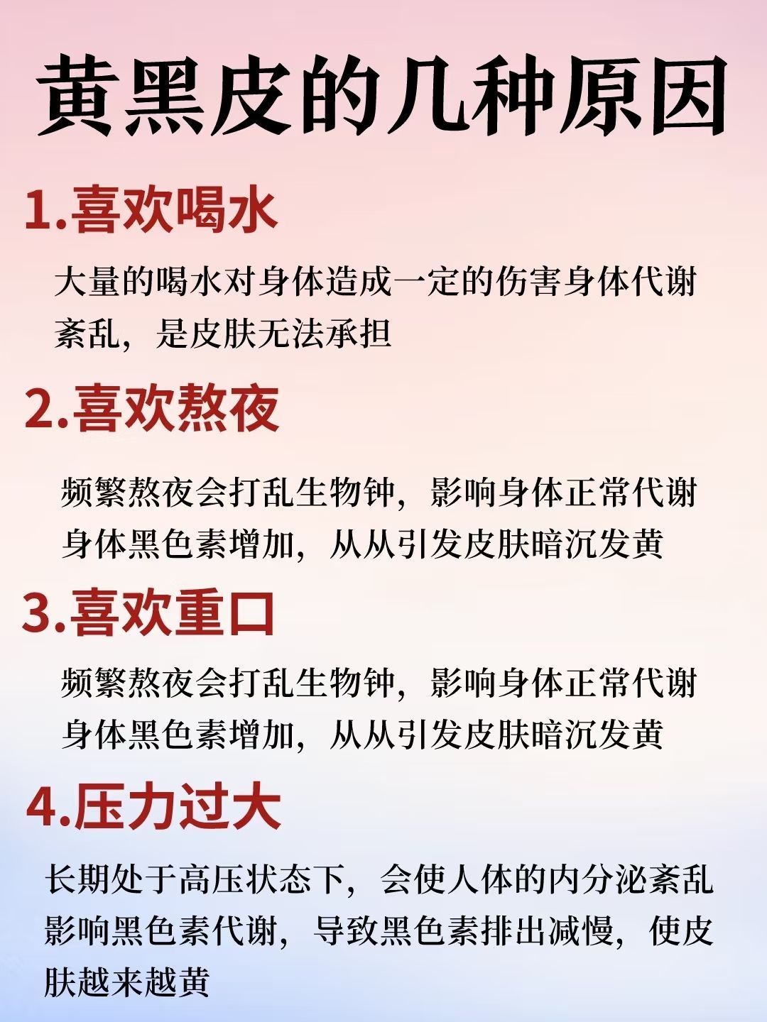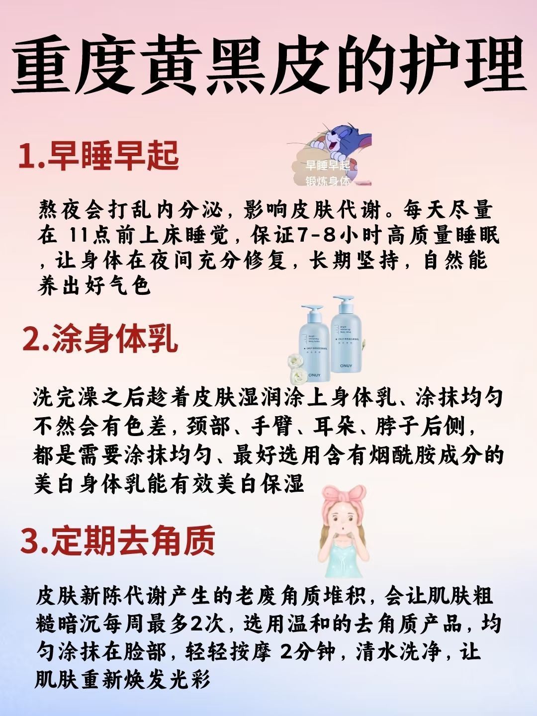 很多的年轻人在繁忙的工作压力下,外卖成了生活常客,加上平时不爱运动,还喜欢吃一些辛辣刺激的食物,久而久之,皮肤越来越黄了。刚开始皮肤只是有点暗沉,后面皮肤粗糙,黄气加重,这个时候才知道后悔,所有要有急事改善,下面给姐妹们分享一下黄黑皮的护理方法,有需要的可以参考一下 黄黑皮的日常护理 1.早睡早起 作息规律早睡早起,别熬夜,保证充足睡眠调节内分泌,建议晚上11点之前睡 2.去角质 角质是人体每天都...