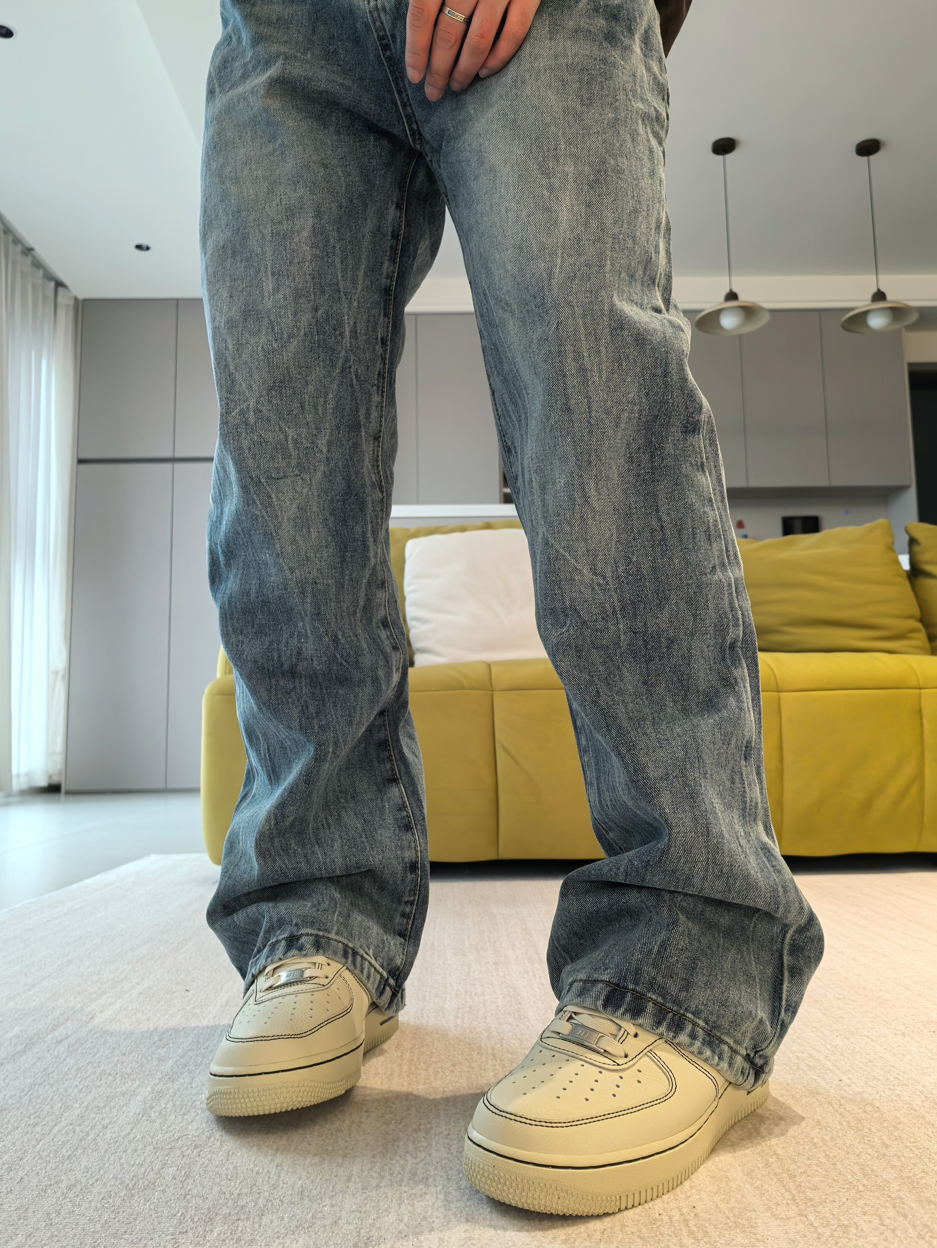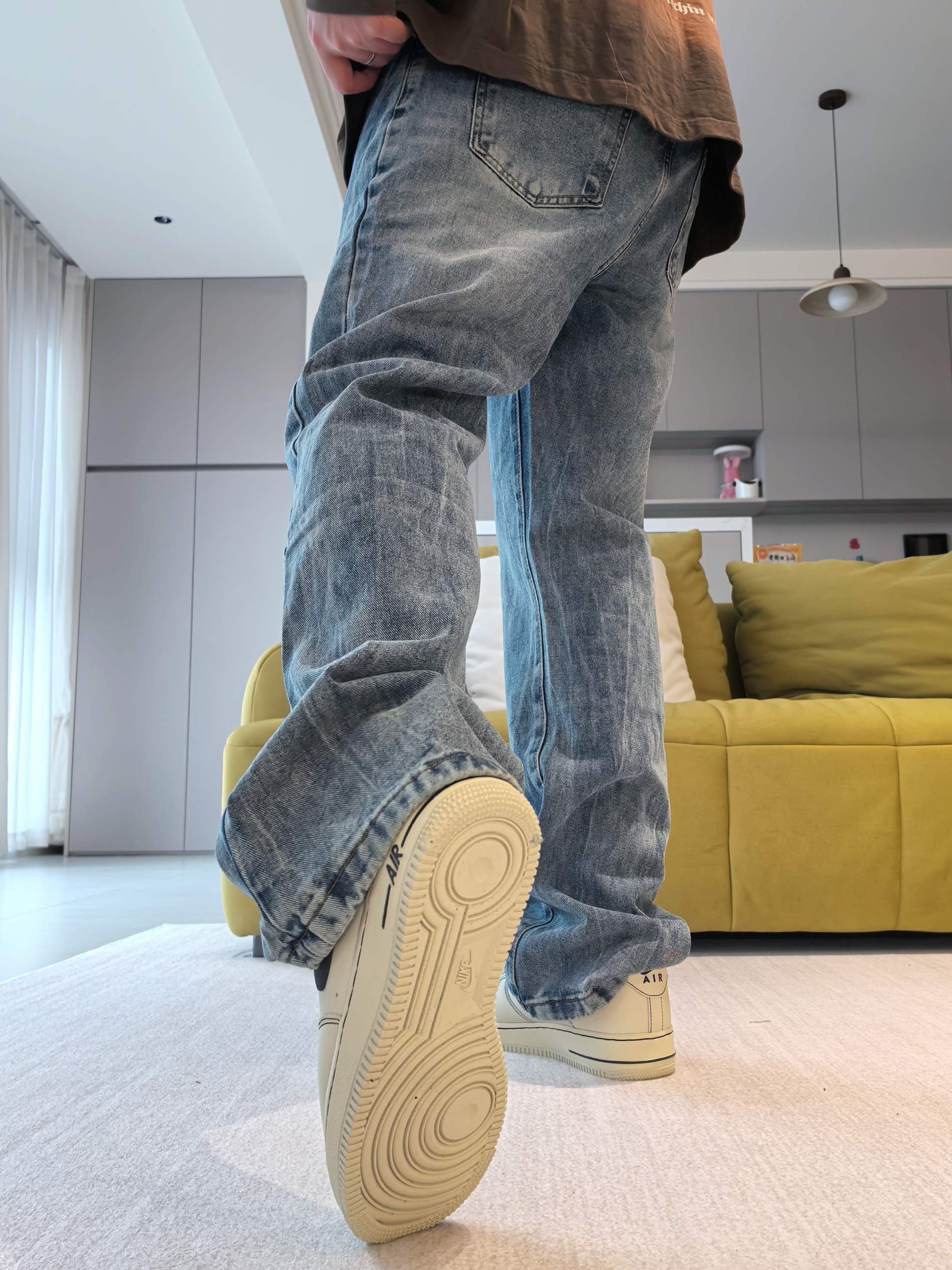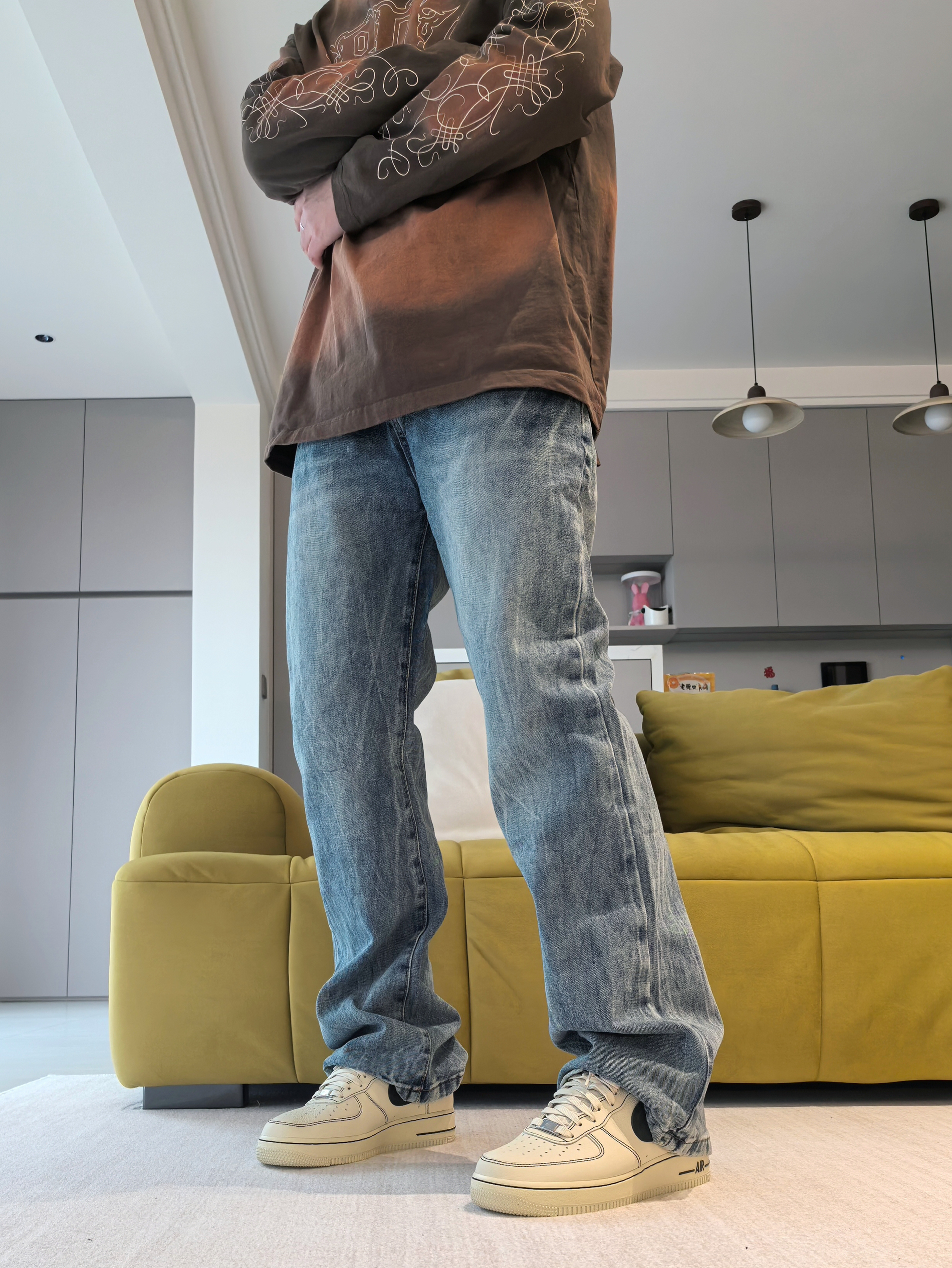 微喇风显腿长又显瘦 蓝色配色搭上一些细节纹路! 上身休闲感拉满~💥 ------ 普款AF1这次也不普通带有一点点特色显高级❕