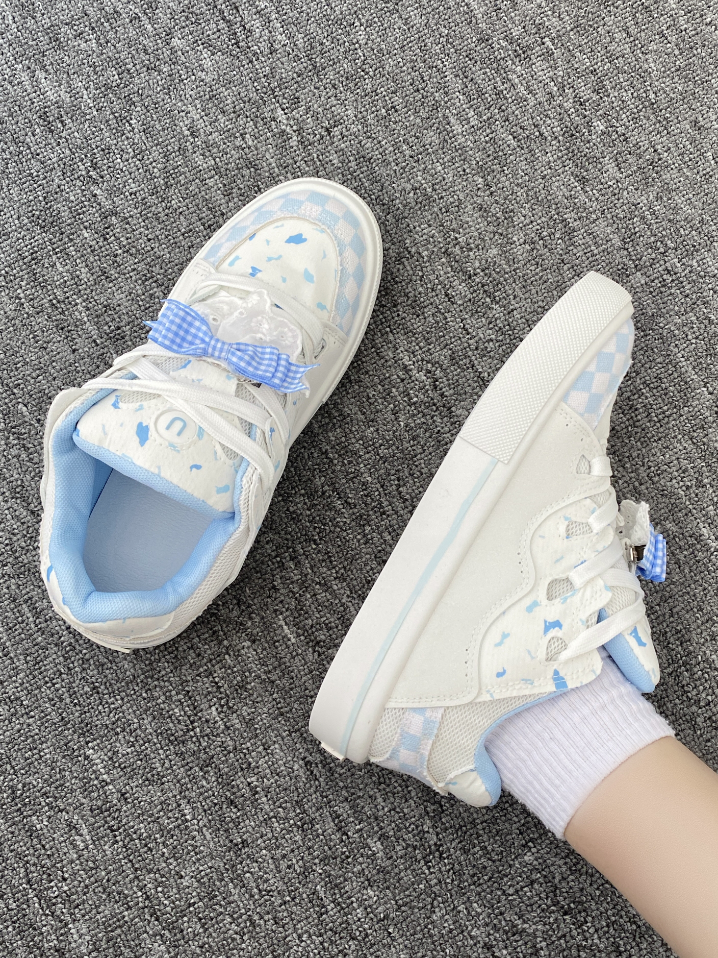 这双鞋太适合春天户外穿了很清新的蓝色 青春感拉满 橡胶鞋底防滑耐磨,鞋面材质柔软,不会磨脚。 而且这款小白鞋的风格也非常多样化,无论是休闲风、甜美风还是时尚风都很百搭