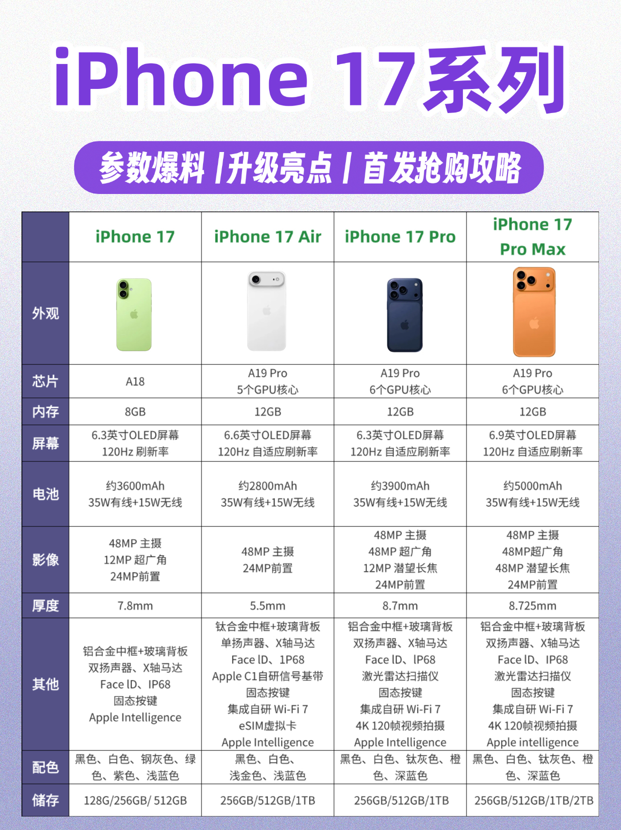 🍎四款机型参数爆料 1️⃣ iPhone17标准版——「经典微调」 ✅延续16竖排双摄,但摄像头模组与边框融合度更高 ✅6.7英寸超窄边框(仅2.5mm!) ⚠️重点升级:全系标配120Hz LTPO屏(终于!) - 2️⃣ iPhone17 Air——「就是轻薄」 🔥苹果史上的薄机型(5.5mm!比硬币🪙还薄) 🚀横向跑道单摄设计(神似谷歌Pixel9) ⚡铝合金中框+玻璃拼接材质(致敬经典iP...