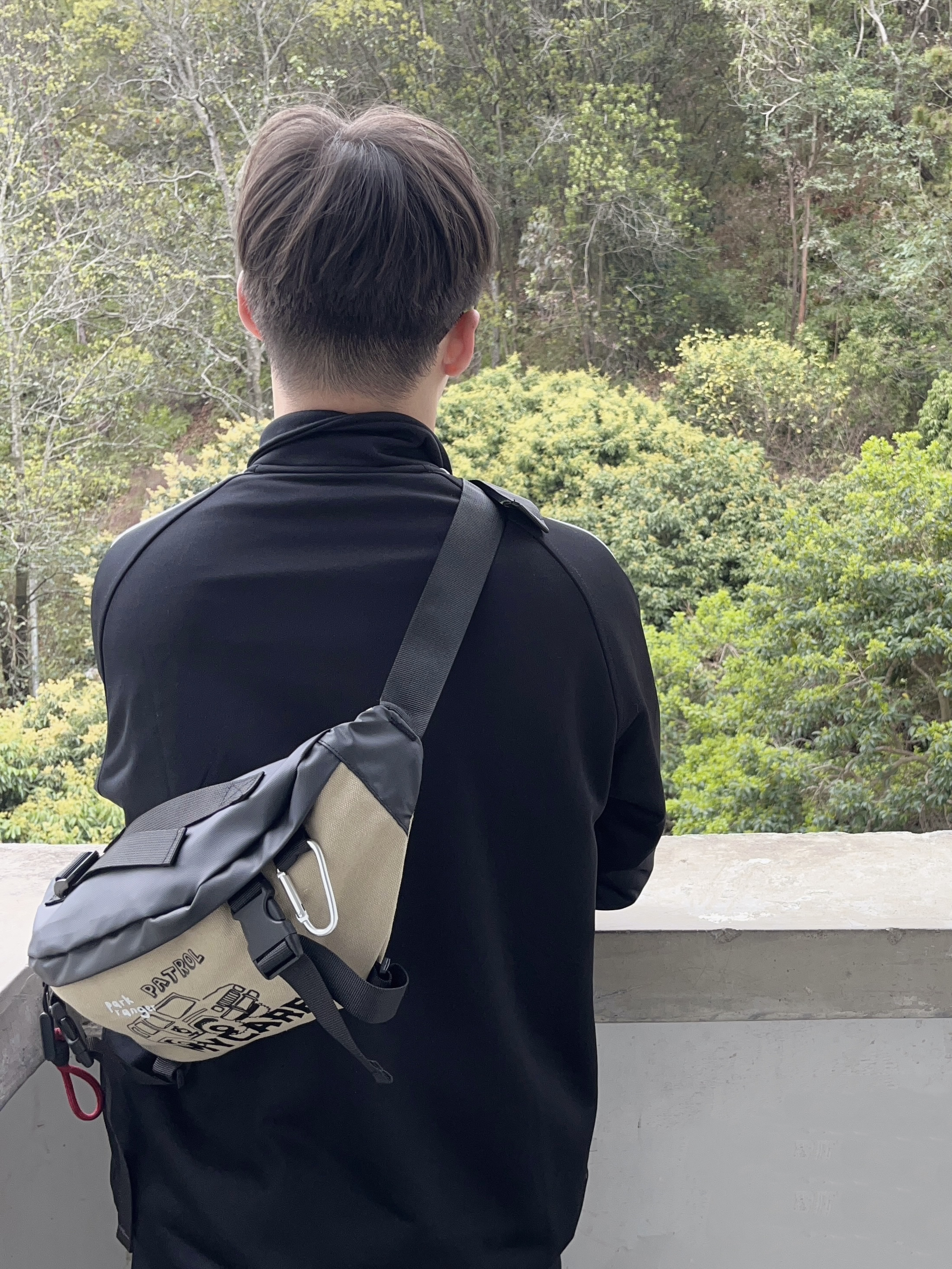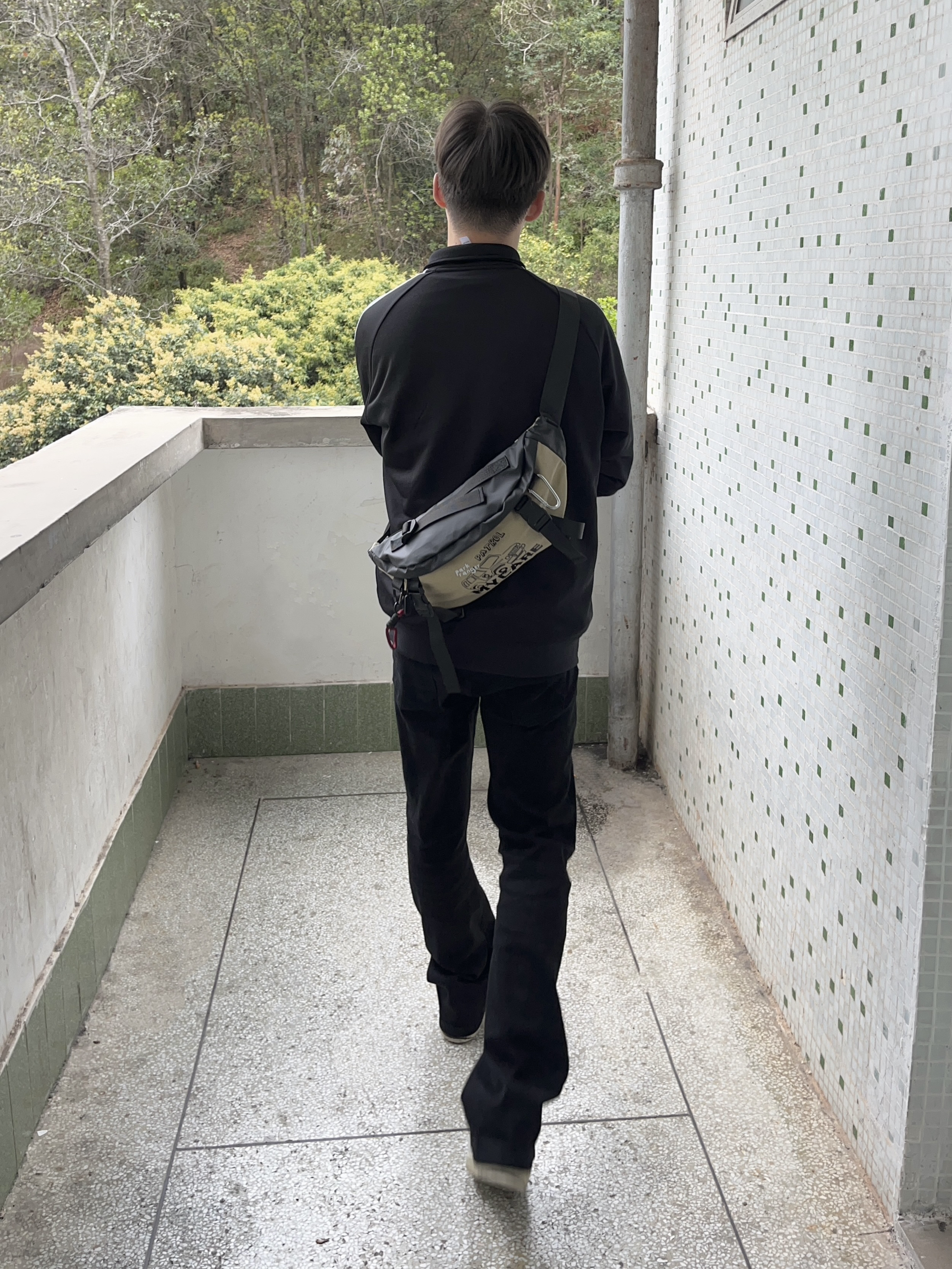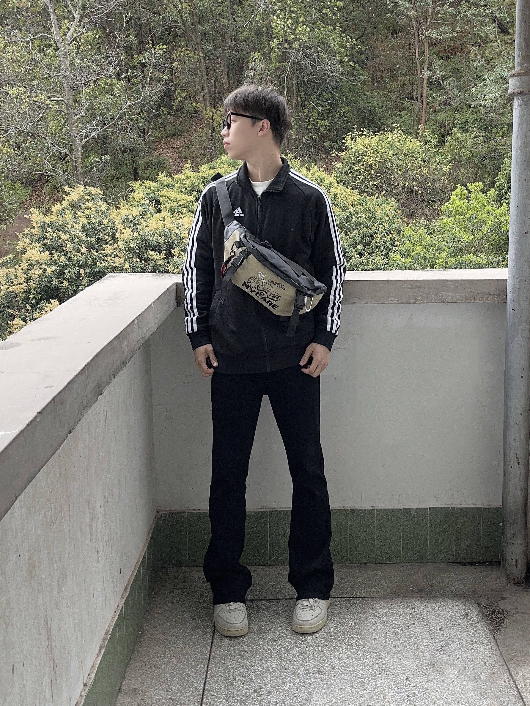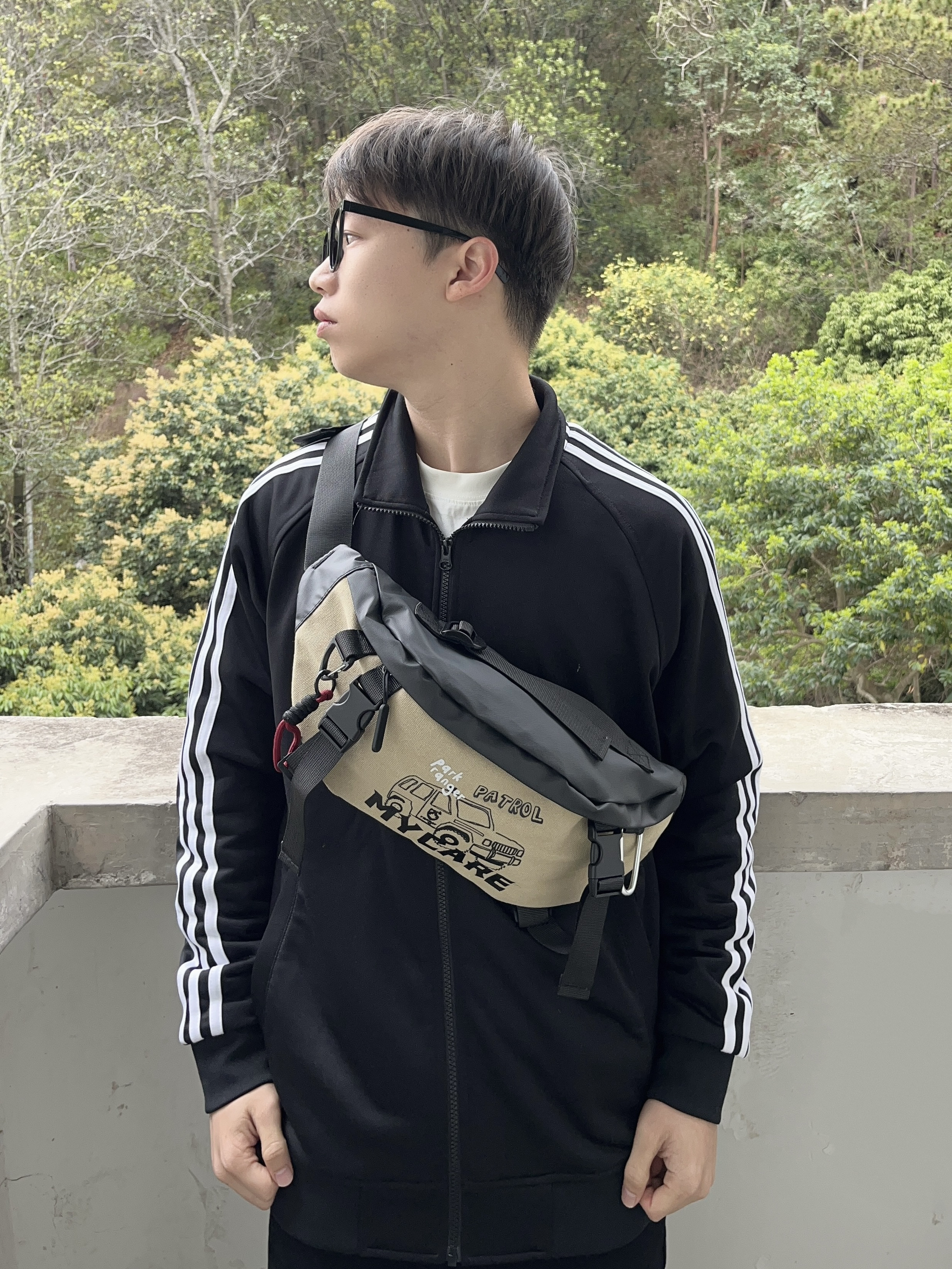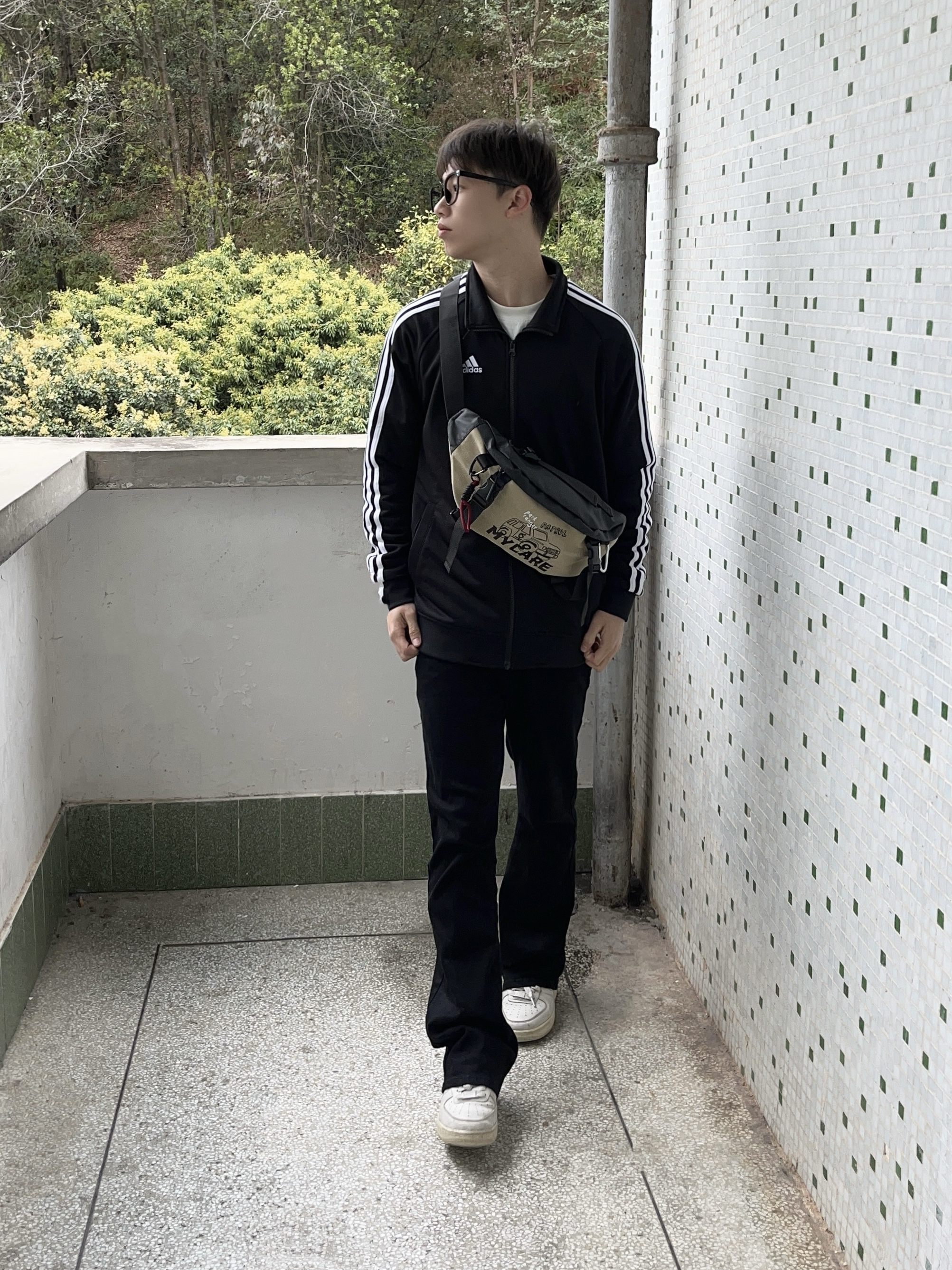 今日份穿搭分享look👀 衣服是黑色经典阿迪外套 搭配一条微喇直筒牛仔裤 背的是 COLINS KEIRS 家的军绿潮流斜挎包 涂鸦印花logo潮酷时尚 织物面料质感满满 容量轻便实用 即可单肩也能斜挎 一套搭配下来 春日户外出行穿搭技巧轻松get