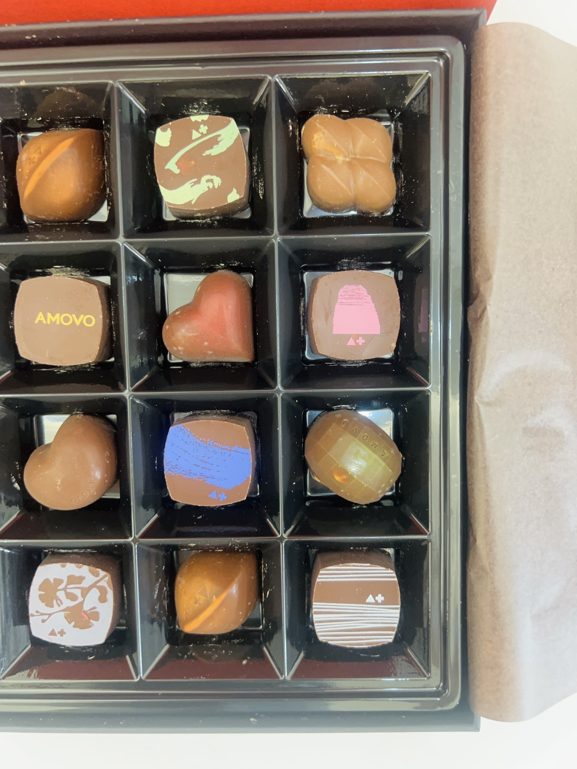 是介个魔吻家的巧克力 好几种不同的口味都是不同形状的 很浓郁的可可香 还有夹心蛮不错的 口感可以 一点都不觉得齁人 盒子包装精致 送礼都可