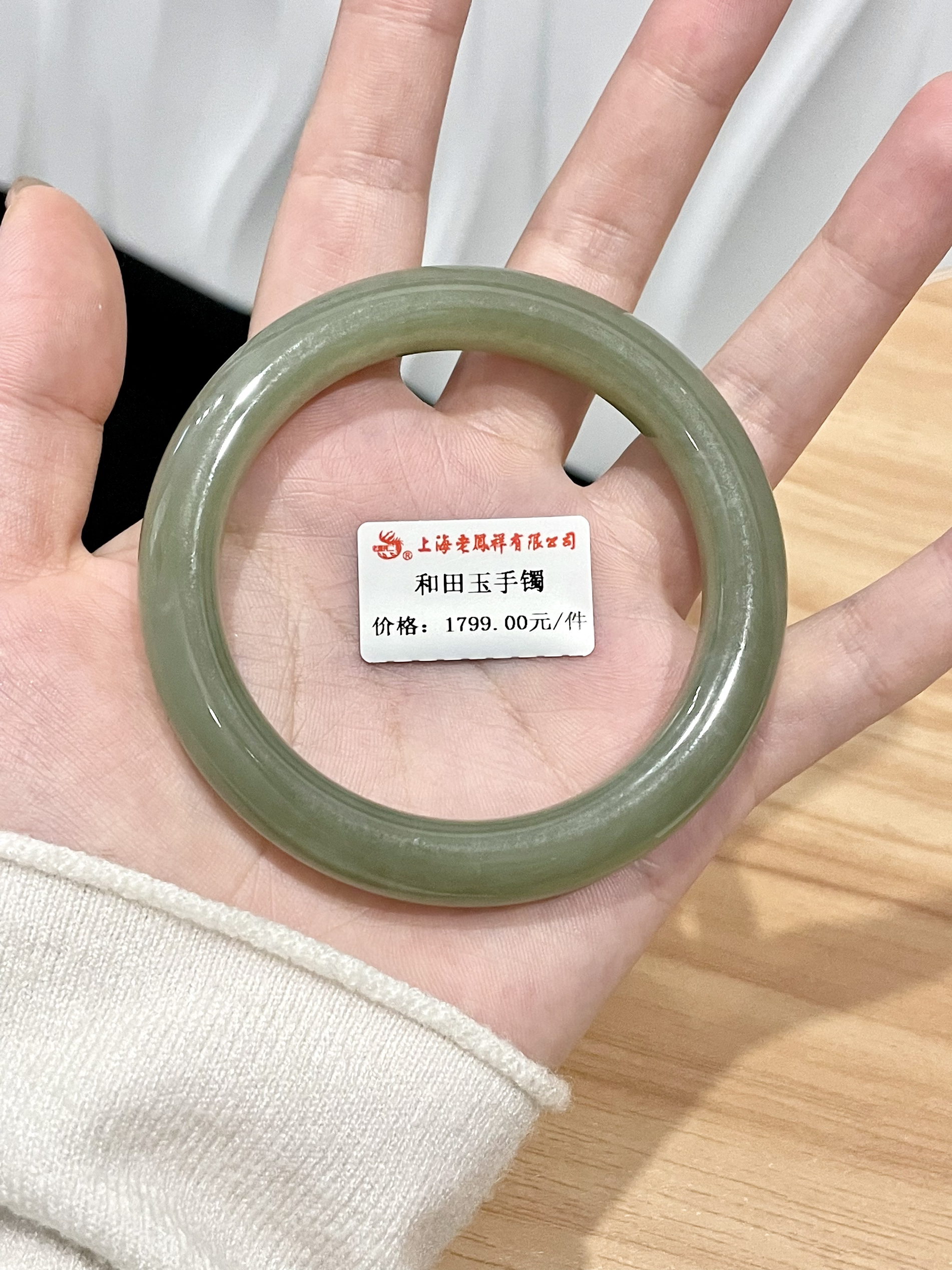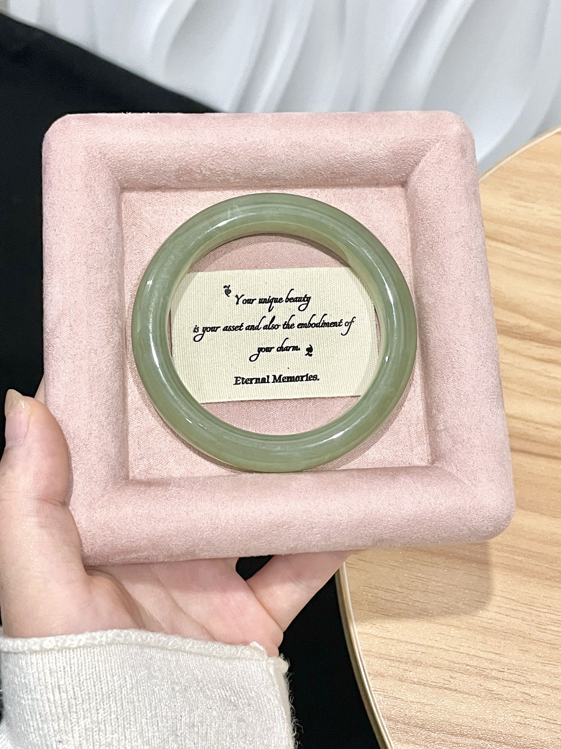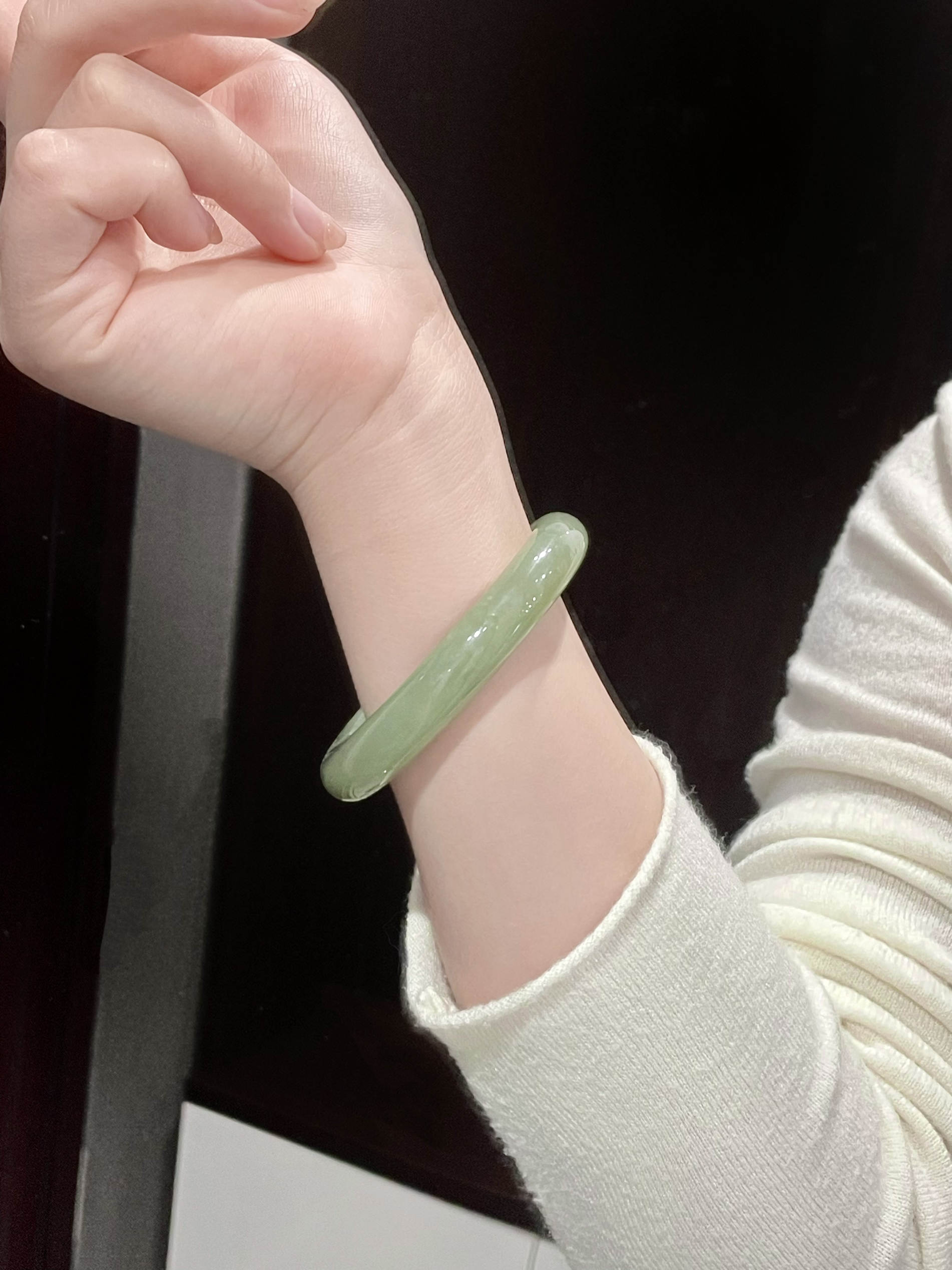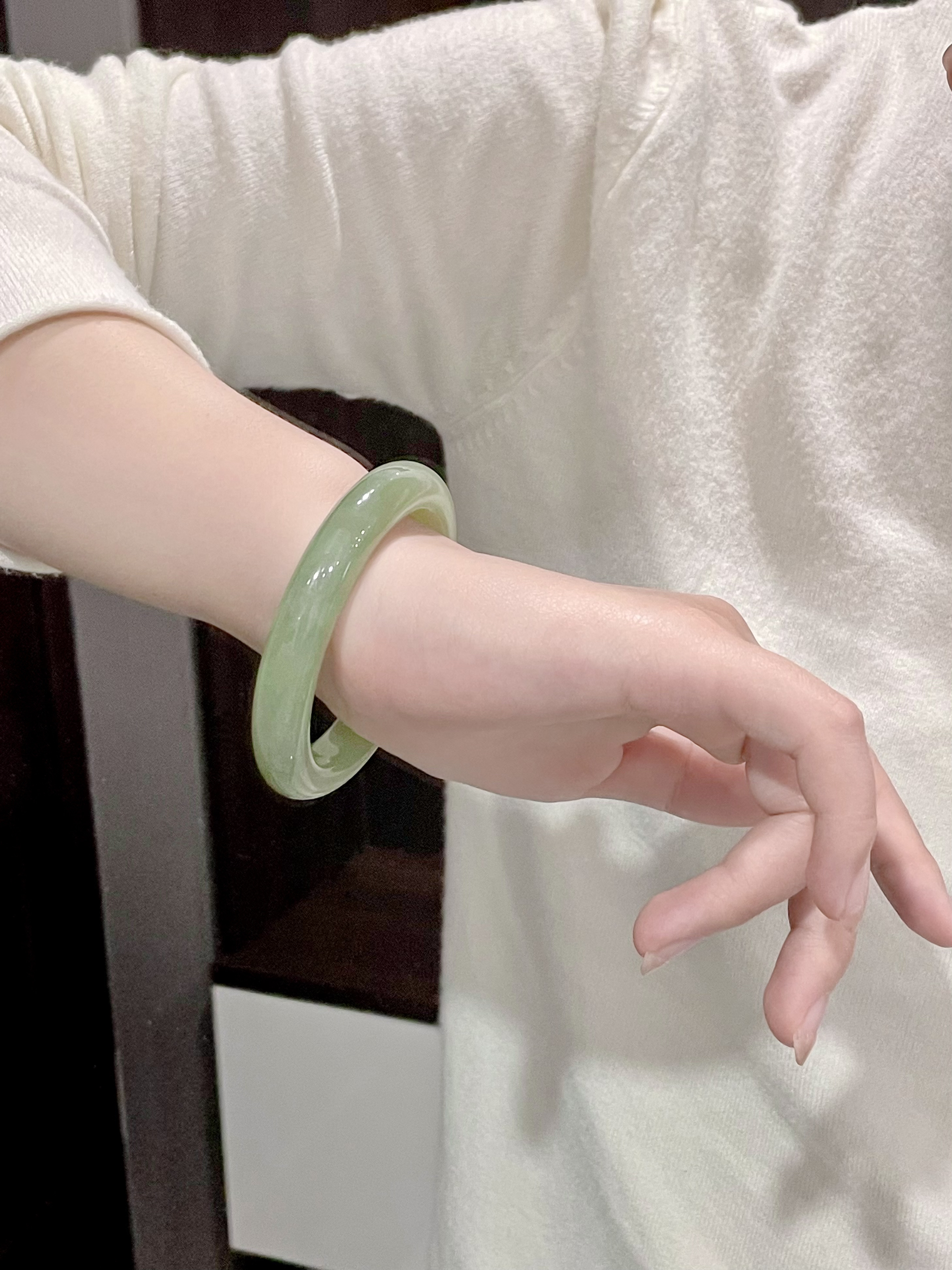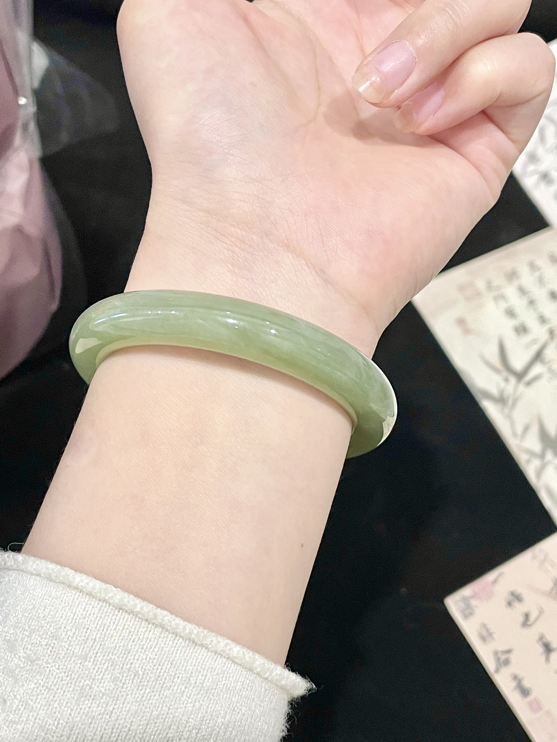 这清冷感和夏天也泰搭了吧 我挑选的这款和田玉手镯是青色滴 戴手上冰冰凉凉是温柔大方的感觉 我平时穿衬衫或者裙子戴着都适合 还寓意着:圆满平安~ 日常当作礼物给妈妈/女友也有面~