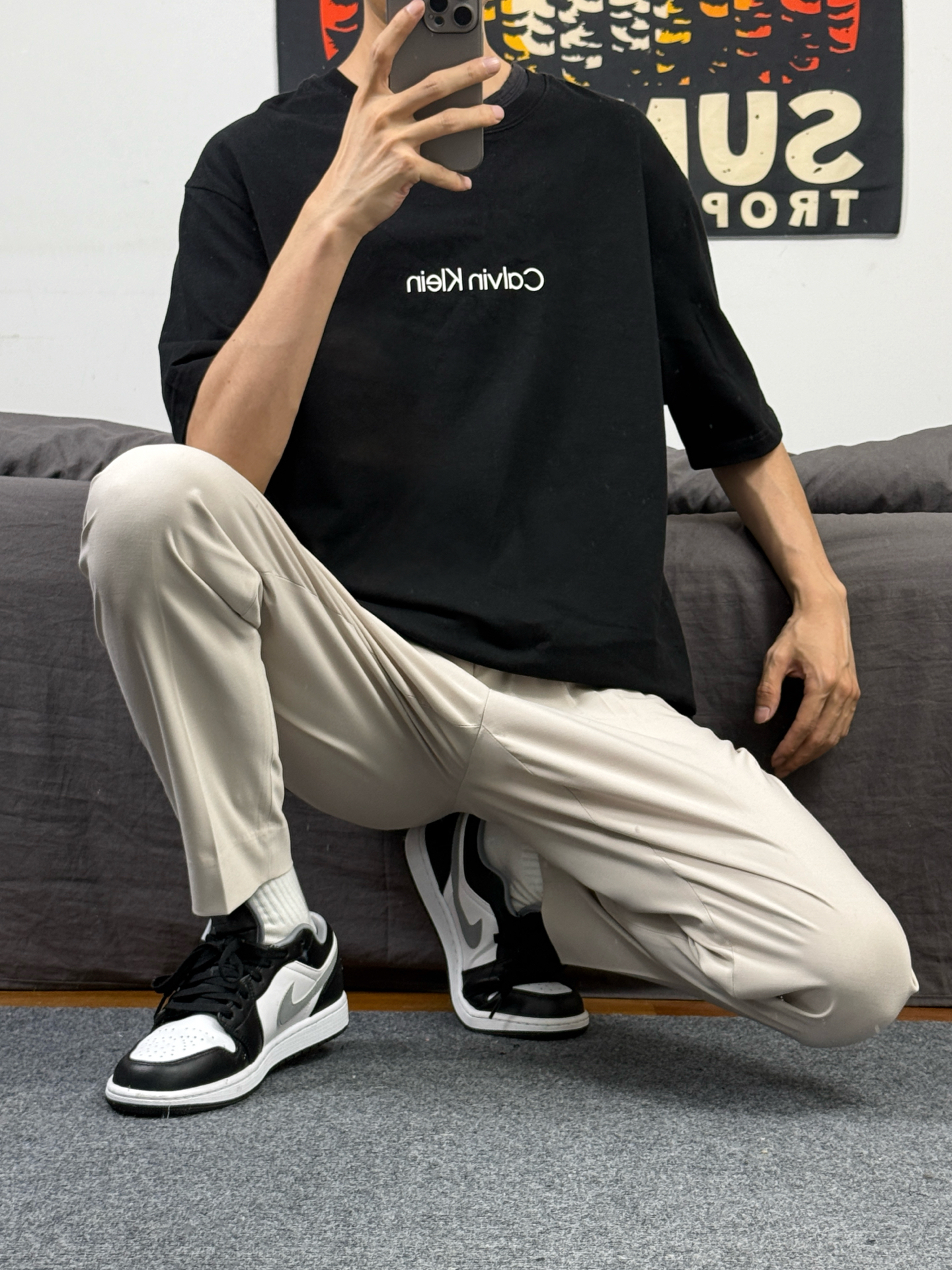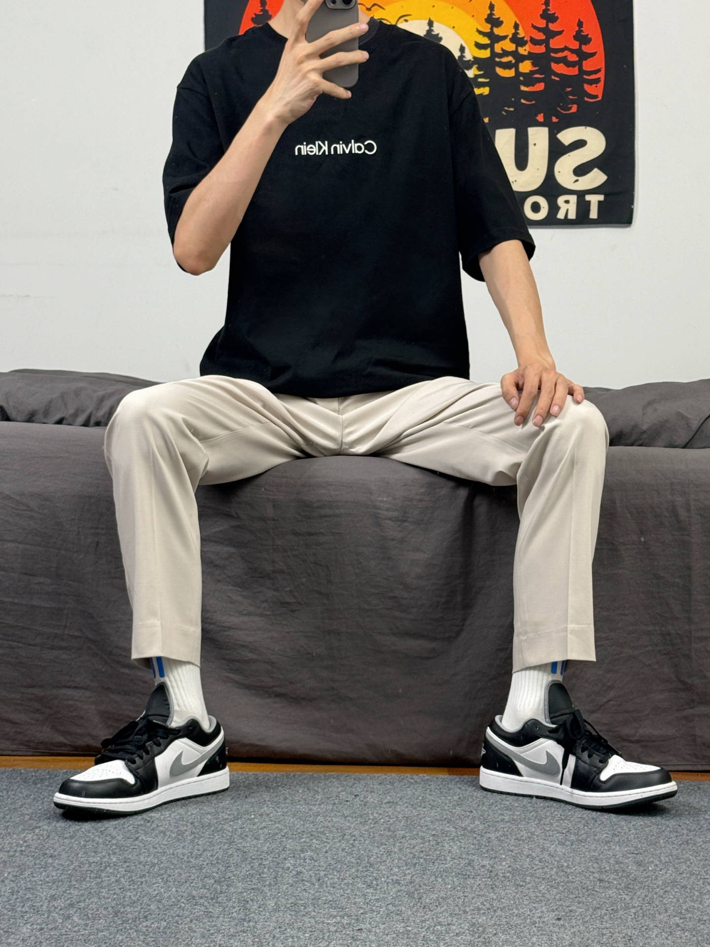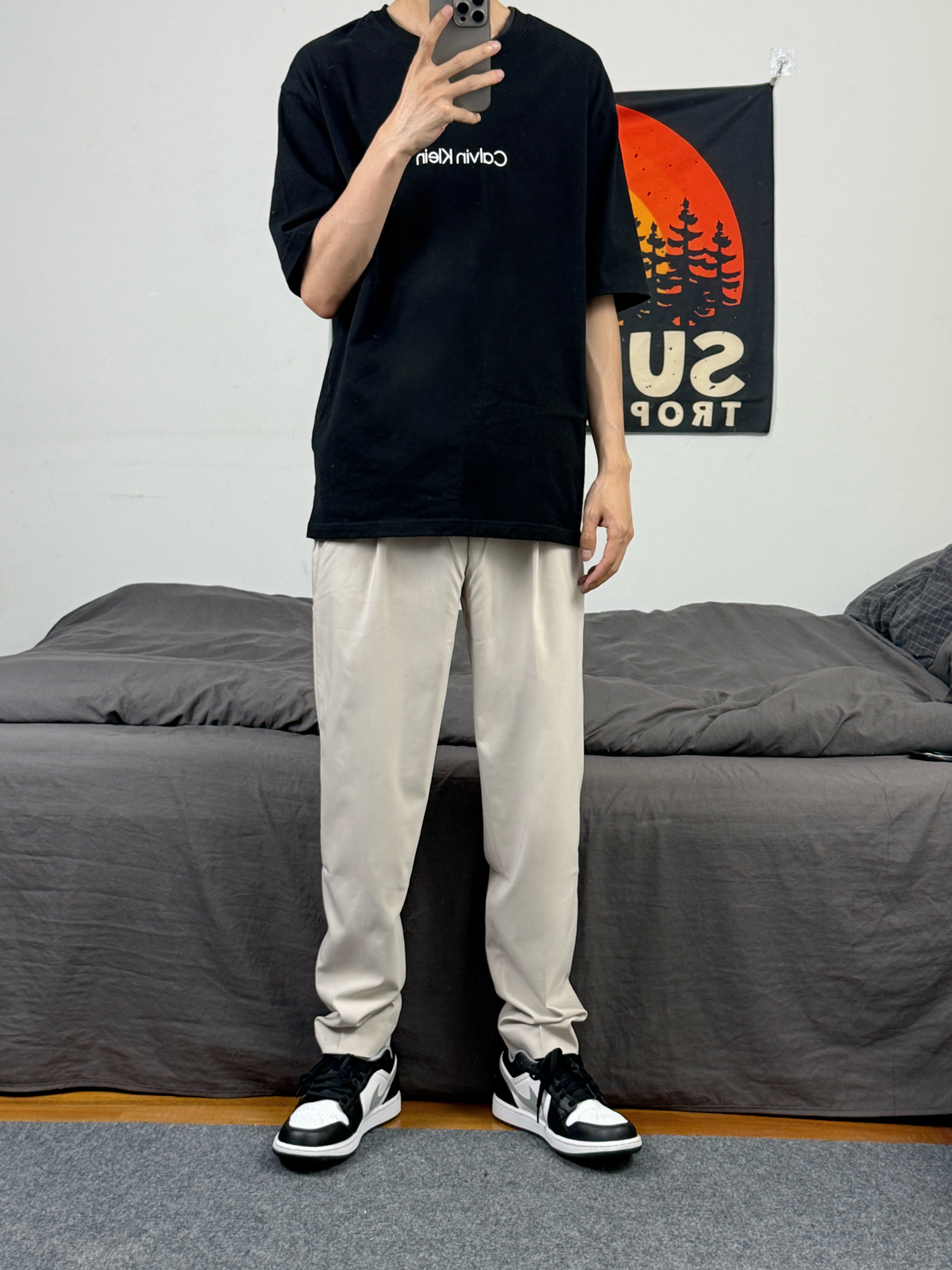 身高174体重48kg 今日上身 黑色短袖+西装裤+aj1影子灰 👕是ck家的黑色重磅短袖 简约版型,胸口有小logo设计 材质偏重磅,上身立挺还舒适 尺码偏大,上身s码宽松效果 👖搭配的 #九牧王男裤专家 家的休闲西裤 款式属于这种直筒版型 上身垂坠还有型 穿在身上特别的舒适 不管是日常穿搭 还是商务出行都能很好的驾驭 👟是aj1影子灰 #这条裤子包舒服的 #春日男生穿搭氛围感 #九牧王...
