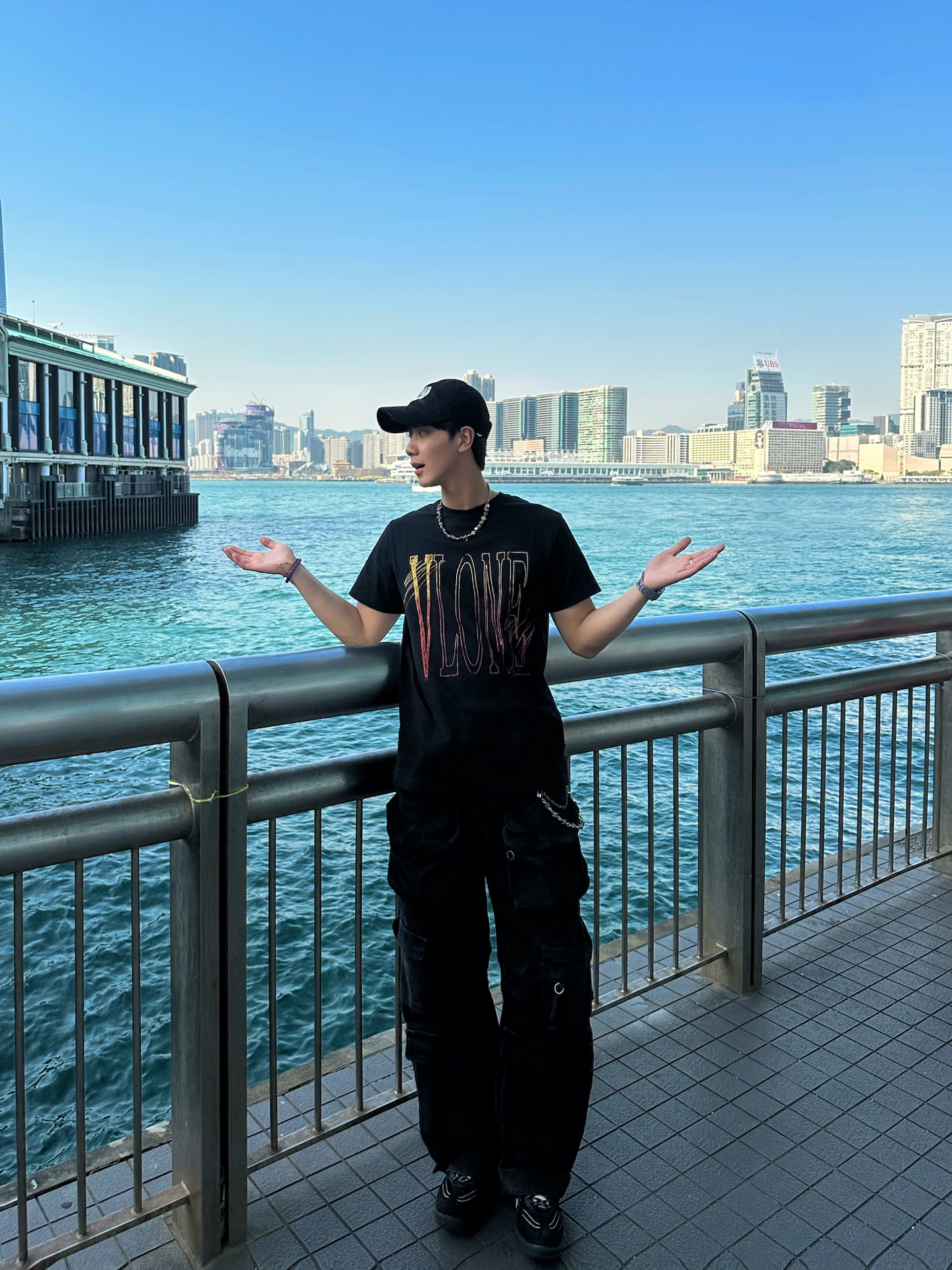 今日穿搭 上衣是来自 #VLONE 的龙舌兰日出🌅简便logo短袖 胸前和背后的印花都是非常经典的设计元素 只不过加上了渐变效果 在视觉效果上更佳吸引我 裤子选择一条zara的工装裤 非常百搭同时也超帅 这一套简简单单的一身黑穿搭就OK了 (图片源自网络侵删)