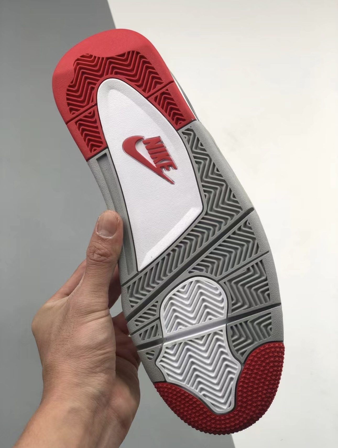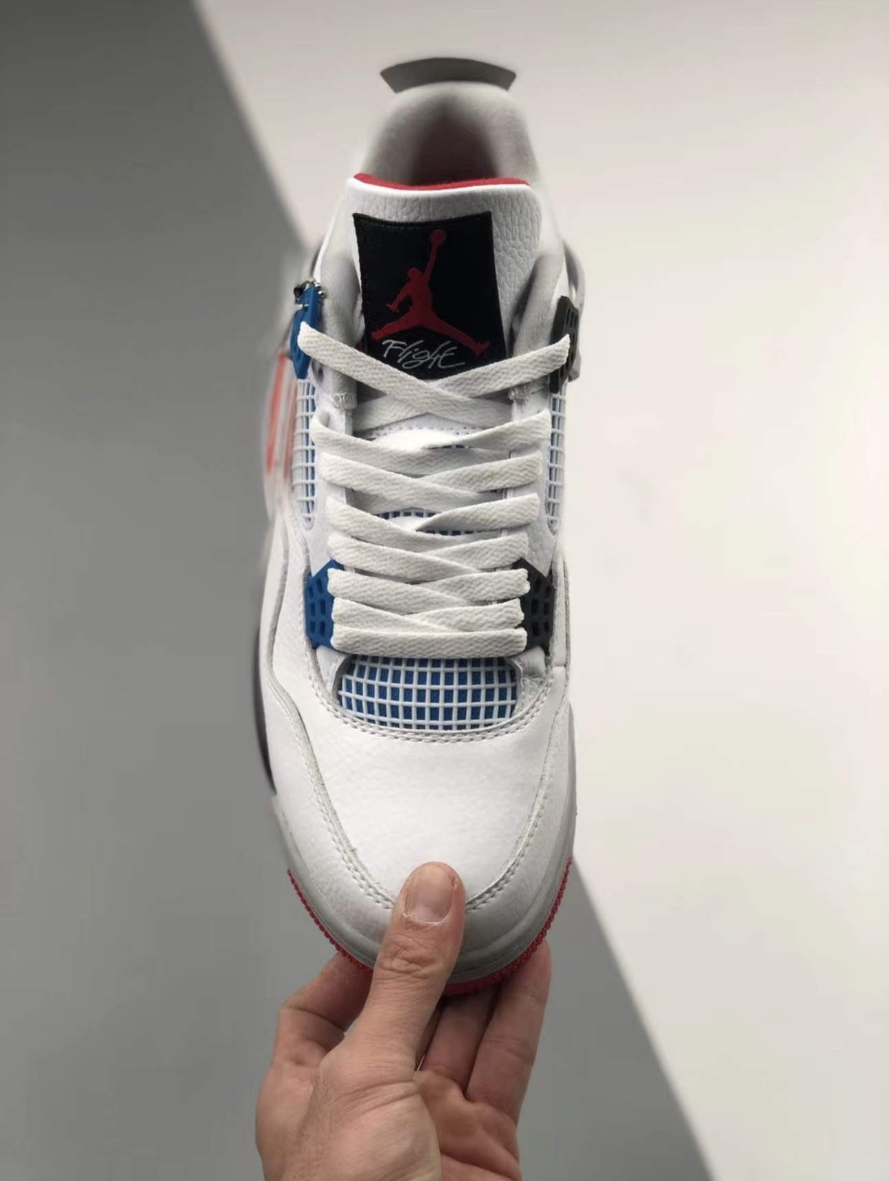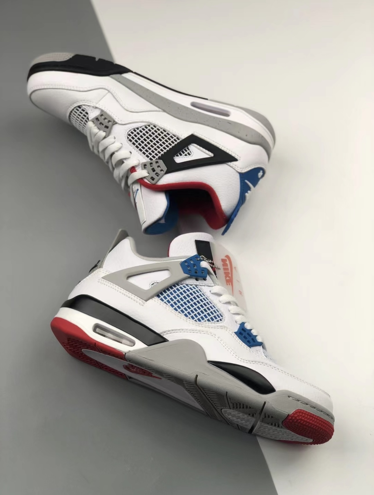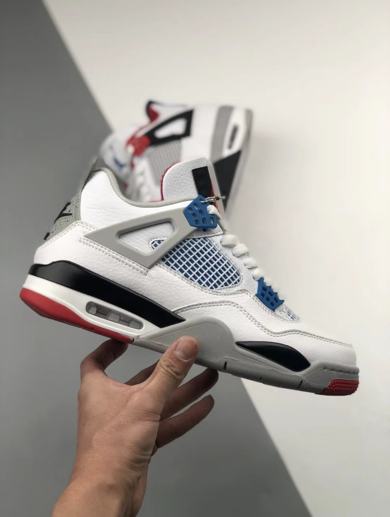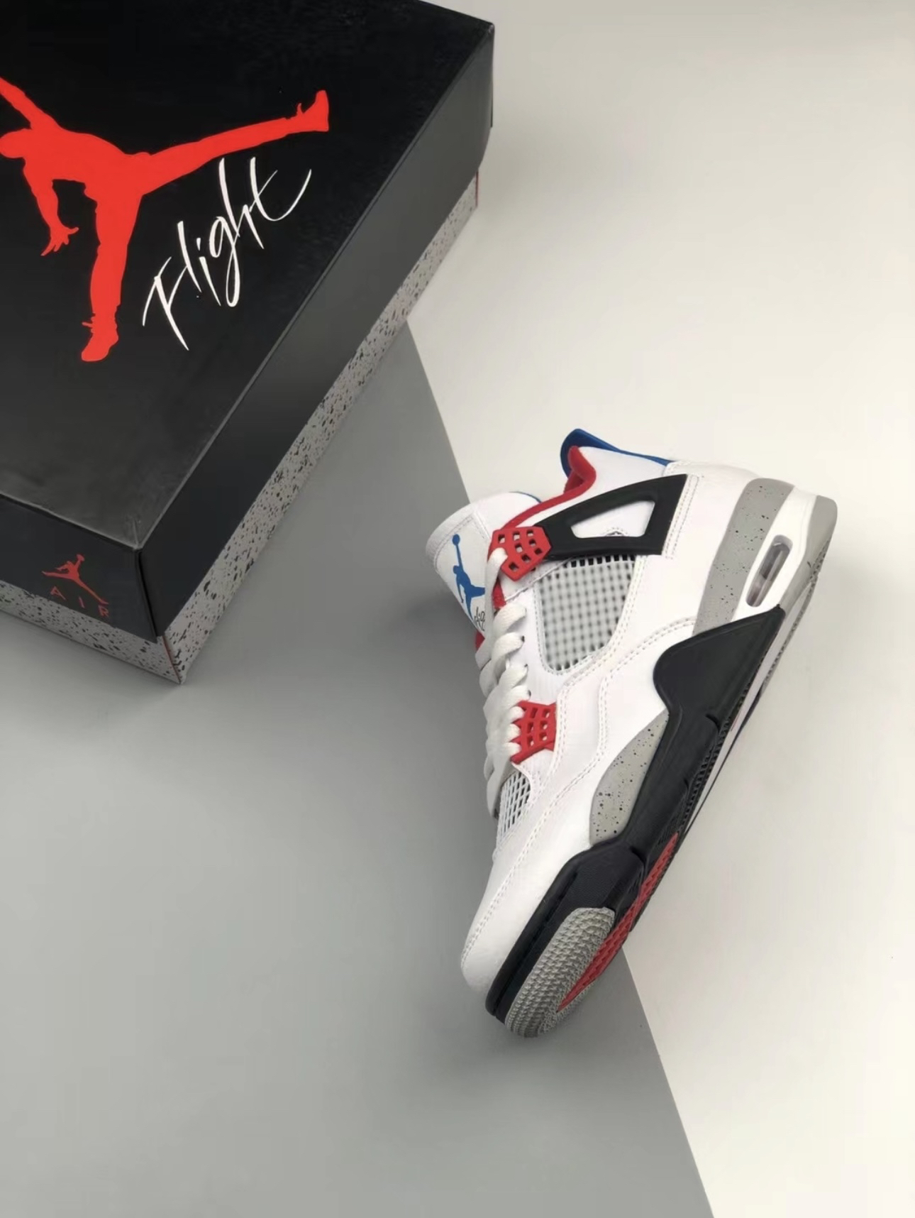 这款AirJordan4大胆运用了不同颜色组合,采用蓝色和红色鸳鸯设计,让人眼前一亮鞋舌、鞋带扣、鞋后跟、鞋底、鞋垫等全部采用鸳鸯配色,全皮革的鞋舌打造!还添加了水泥灰的配色!让整双鞋看起来更有质感! 鞋身是偏厚的有一定的包裹感、鞋底防滑耐磨!