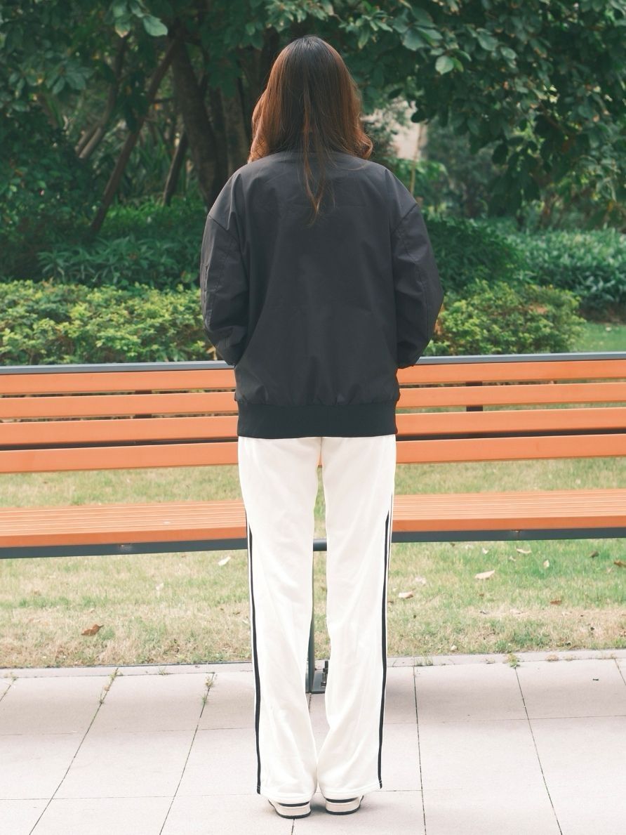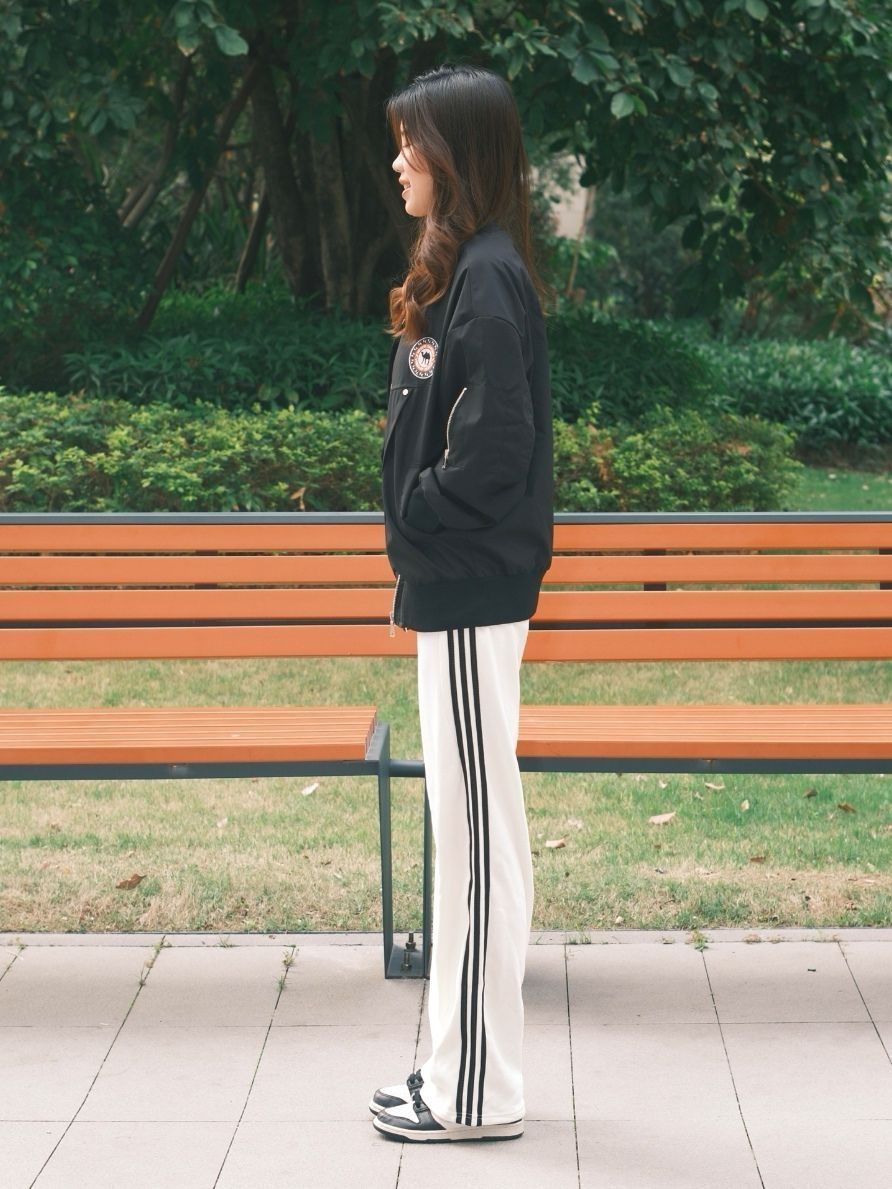 😚黑色夹克外搭酷感十足,内搭简约打底,下身白色运动裤瞬间提亮整体。 👖裤子材质透气不闷汗,宽松裤型随便动都自在,搭配休闲鞋,氛围拉满。 🚶无论是逛公园还是约闺蜜下午茶都合适,春天就该这么穿,松弛又好看! 图源网络侵删