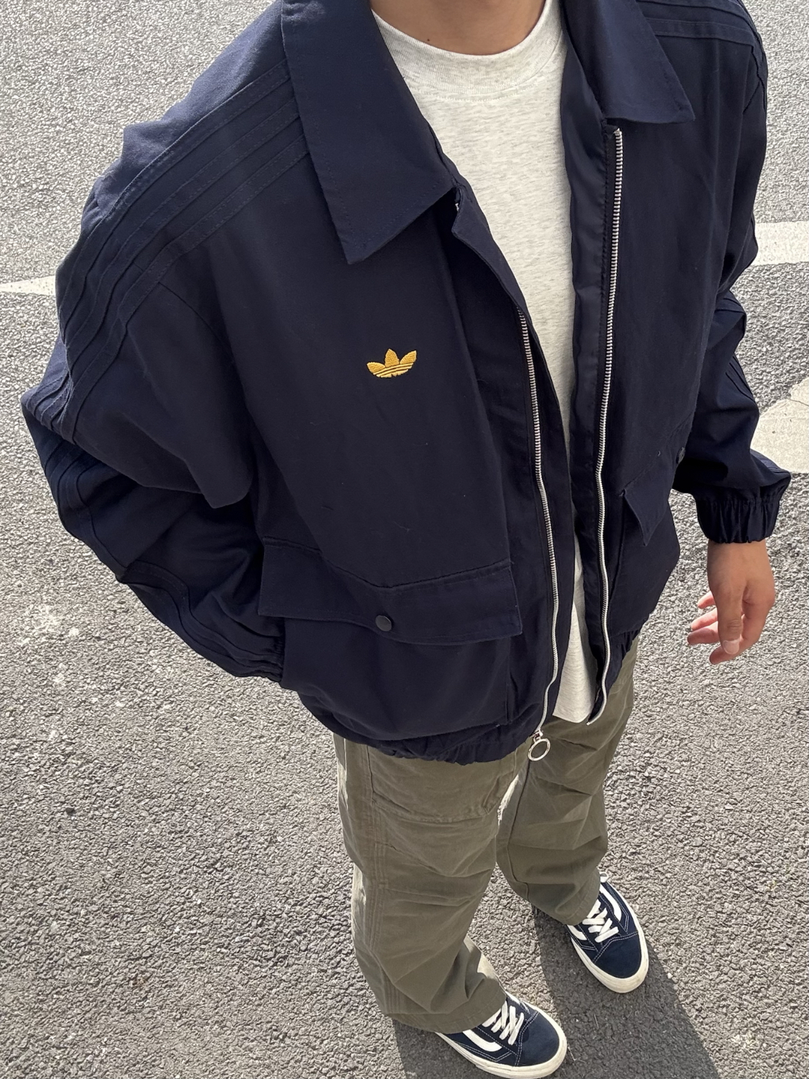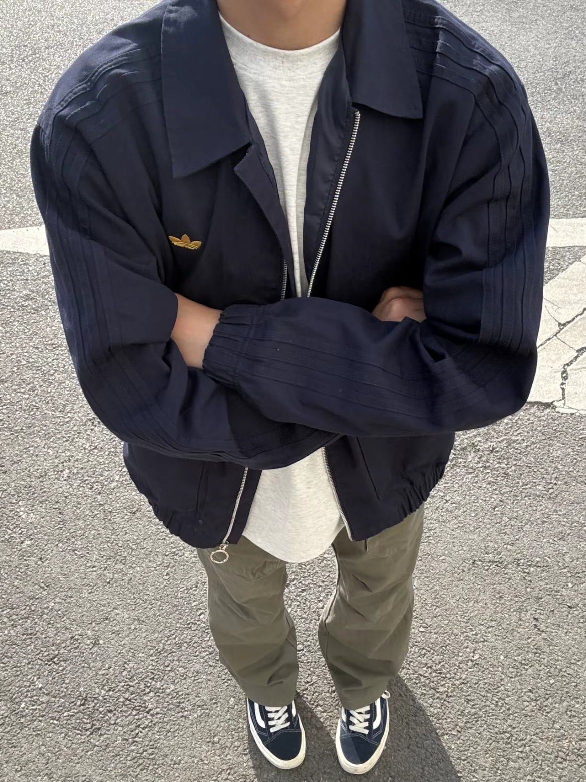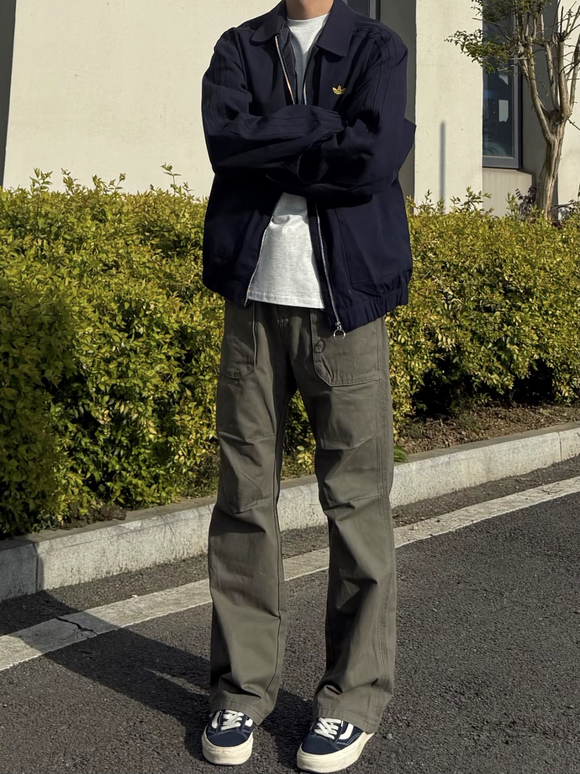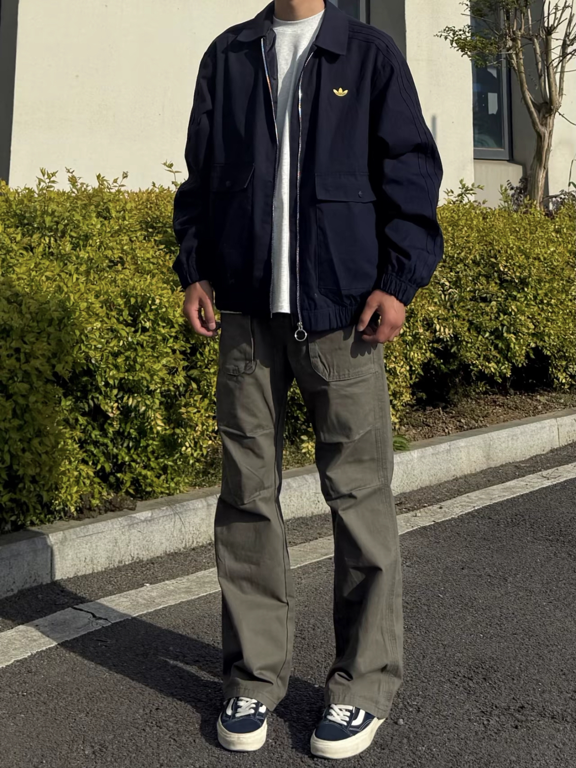 看看今天这身,上身一件阿迪达斯的翻领夹克外套,经典百搭的藏青色,怎么穿都好看。搭配一条 多口袋工装牛仔裤,低调简约的灰绿色。美式复古的风格,直筒宽松版型,穿起来修身显腿长。再搭配一双板鞋,包帅的一身穿搭!!
