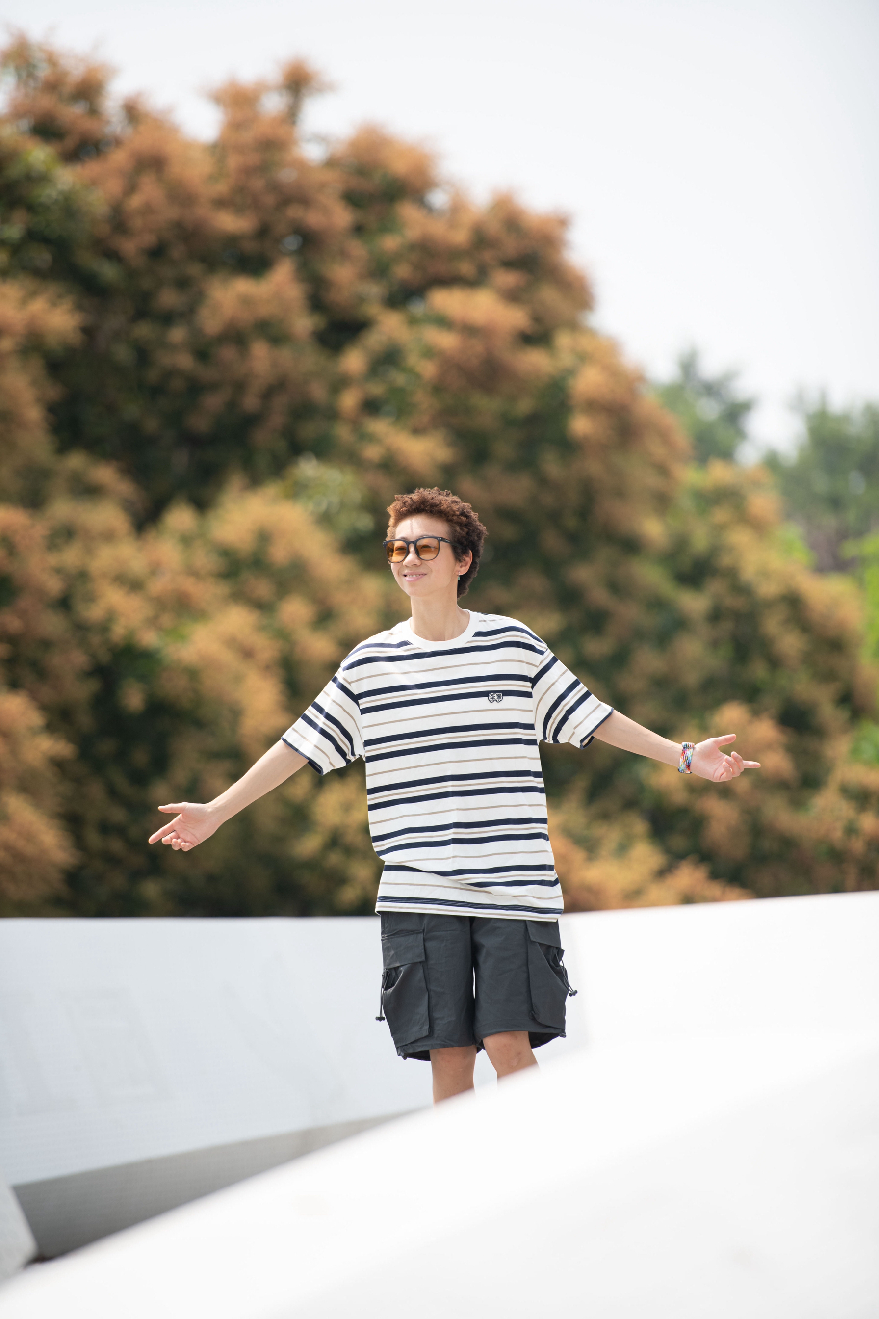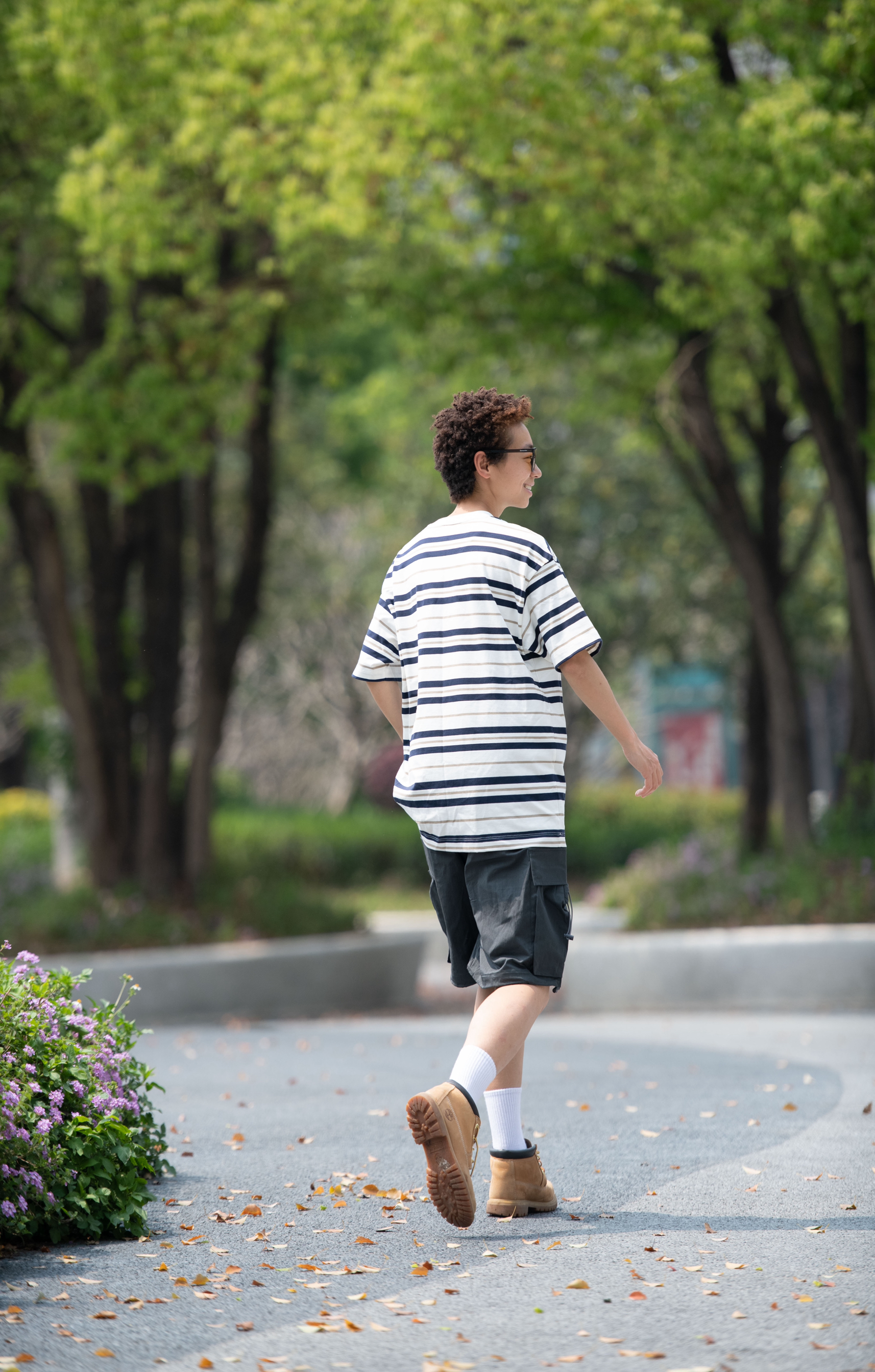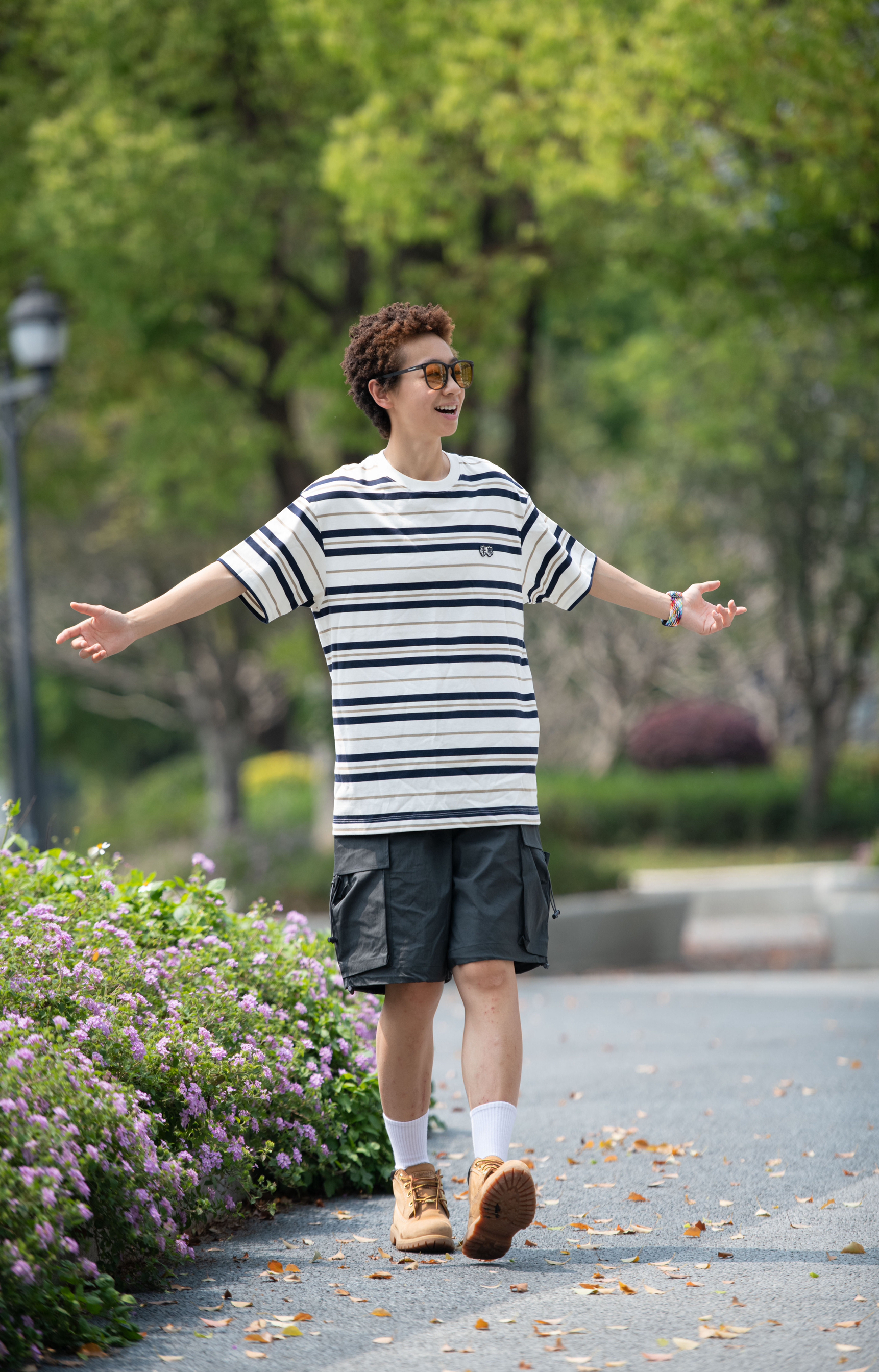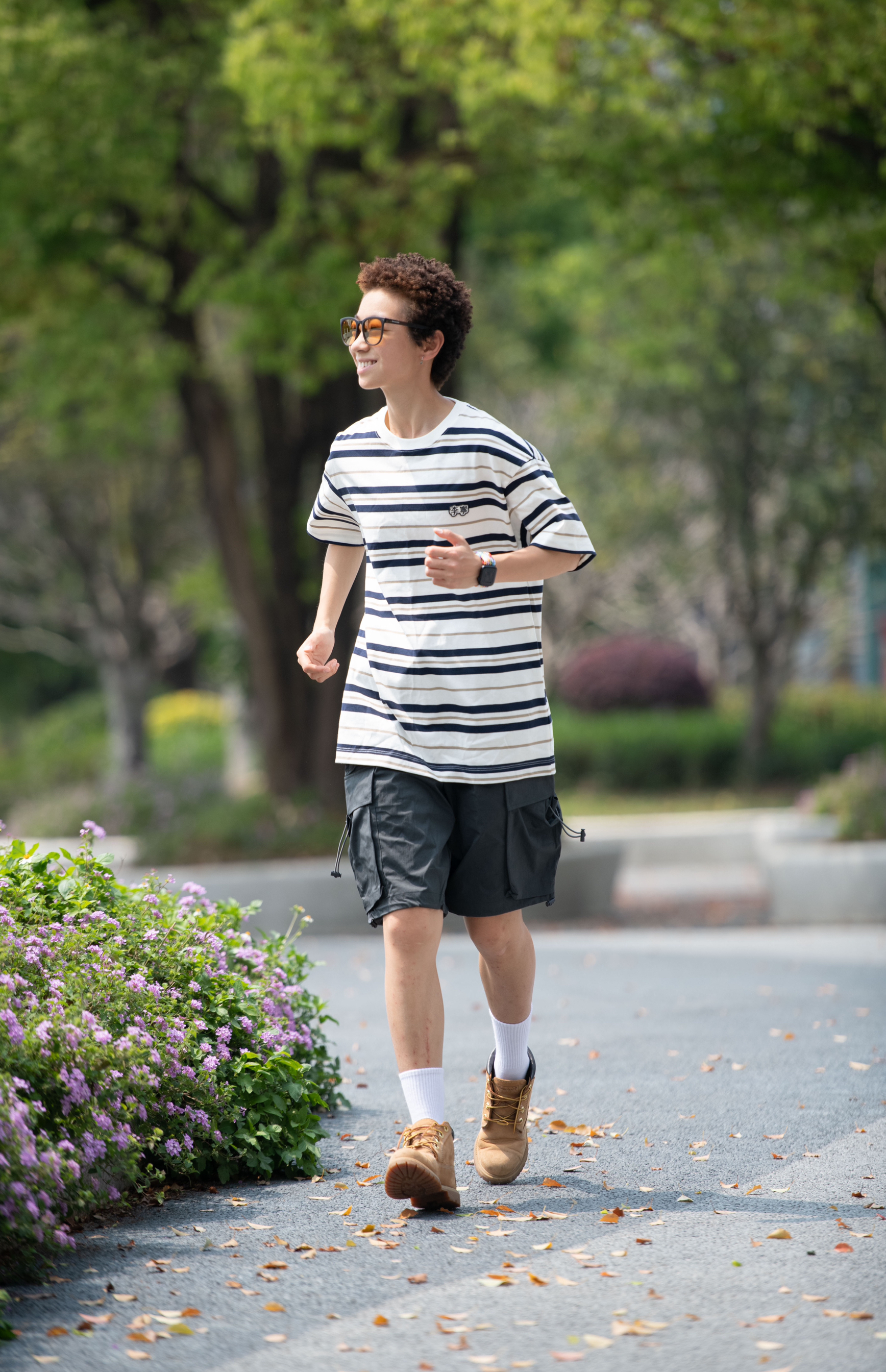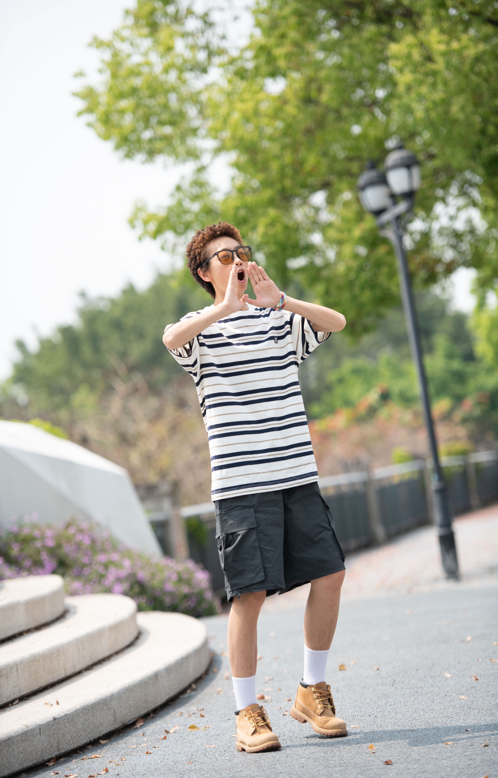 哈喽 欢迎来到哇哇哇穿搭分享频道! 172CM|55KG|👔:M L👖:m|👟:39码 谁说条纹只能“基础”? 今日份户外出游上身穿个 李宁米白色条纹T恤自带氛围感耶 下半身穿个黑色哒工装裤 穿上俺的大黄靴 行走在夏天街头 少年感拉满