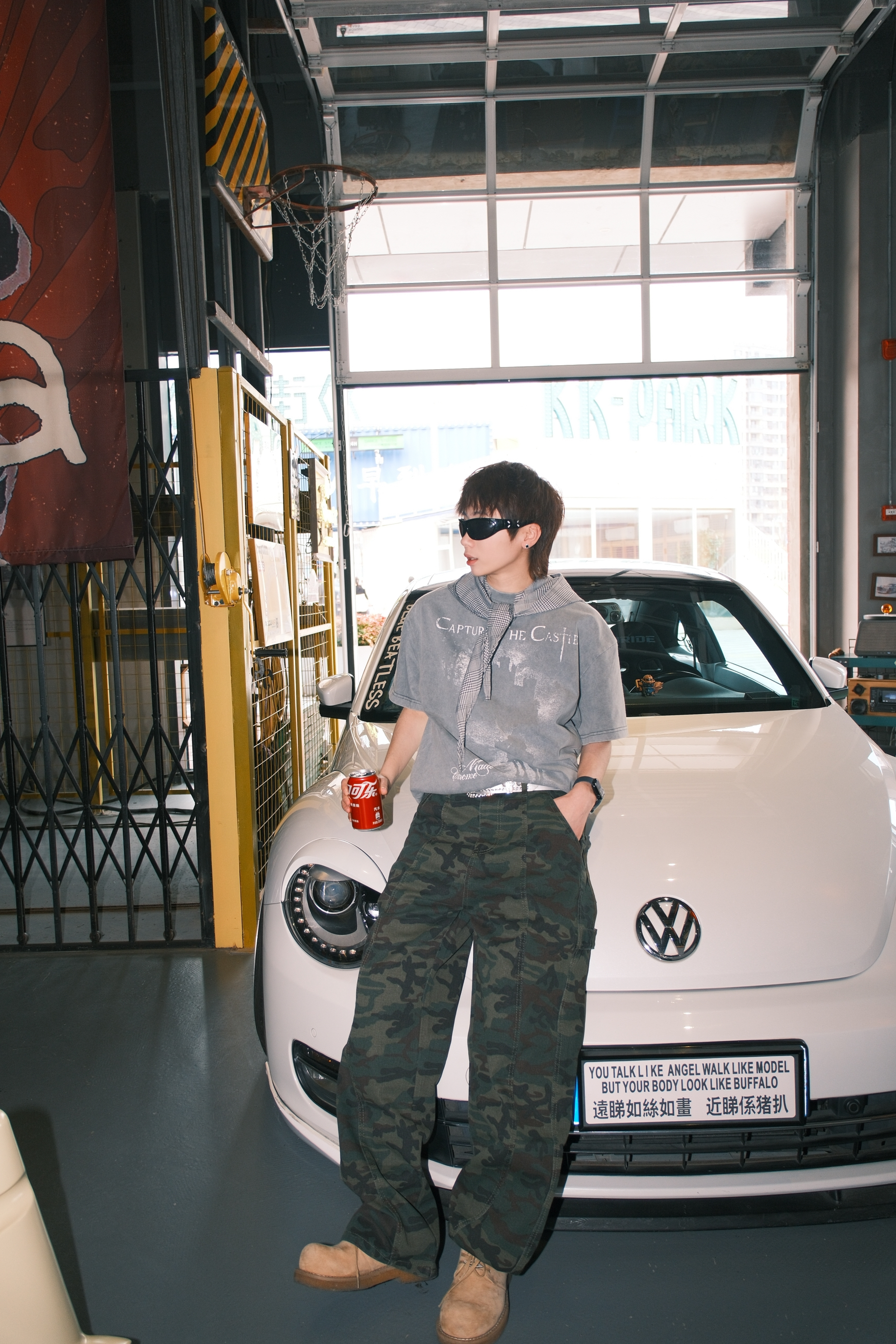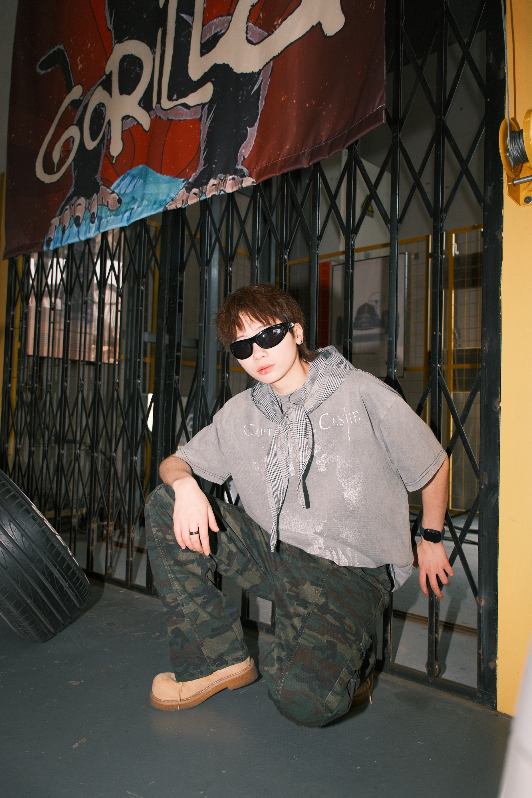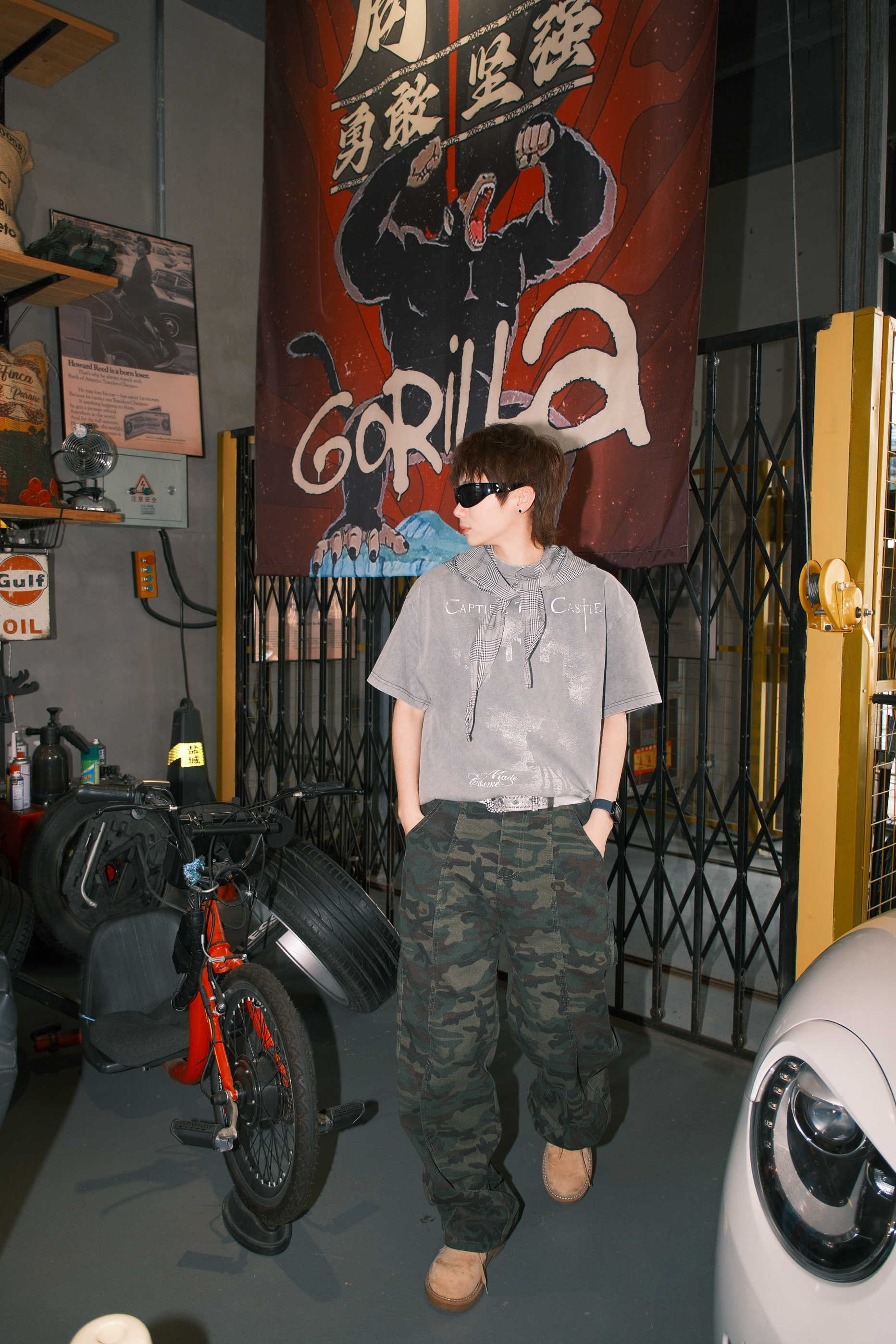 学会这套公式让你摆脱NPC路人感 上衣选一件美式风格的T恤 做旧的低饱和度灰 有点偏向简单清爽的cleanfit风 利用连帽头巾的配饰,增加造型感 搭配军绿色迷彩工装裤 这种直筒版型,上身会比较有街头感 上衣塞进去,系根银色腰带 拉高腰线,通过上短下长的方法显高 最后来一双棕色大头德比鞋,百搭不出错 尺码参考:163cm/48kg 上身M码